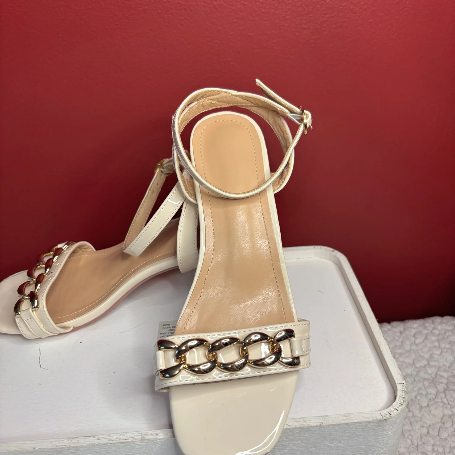 Women’s cream colored block heels with gold chain detail