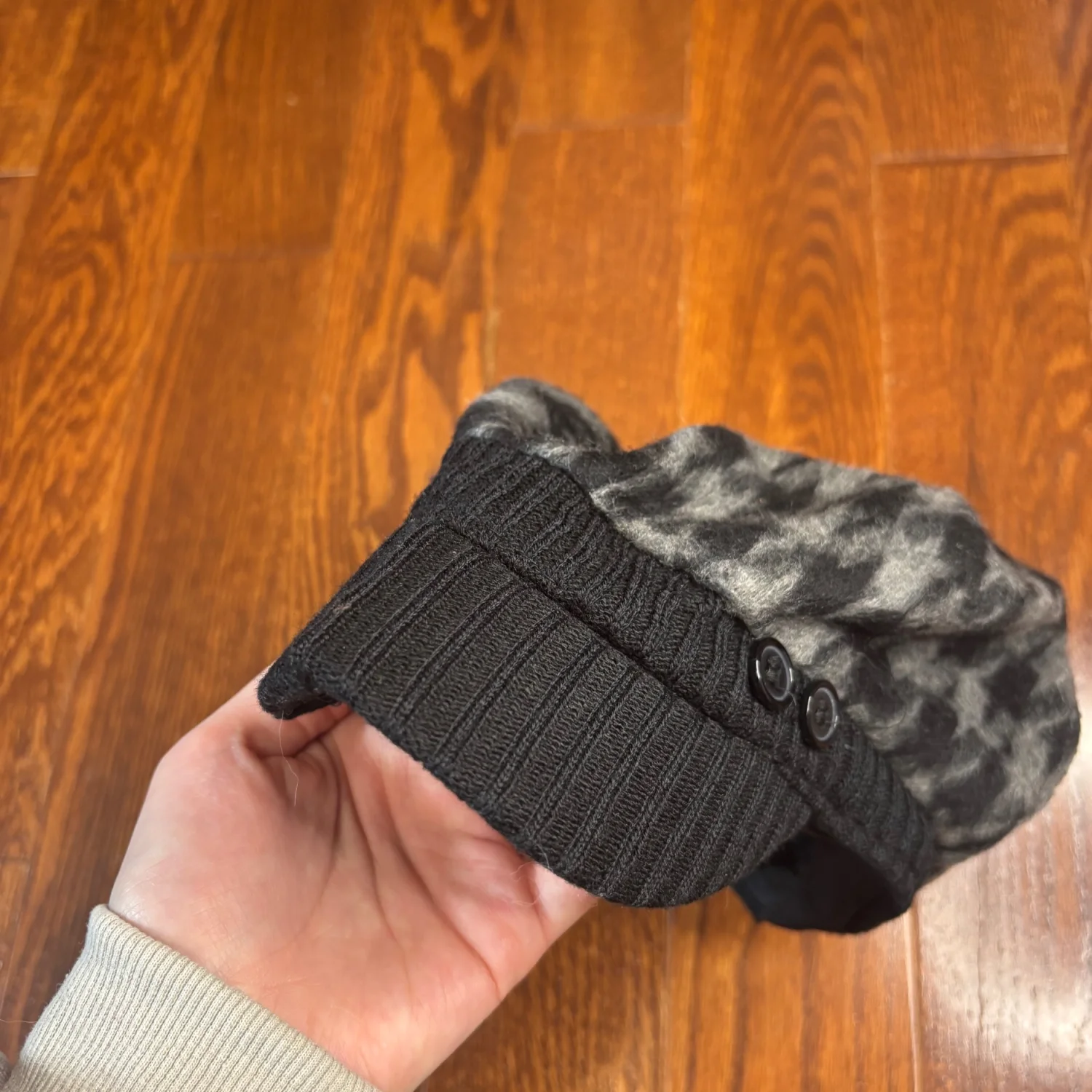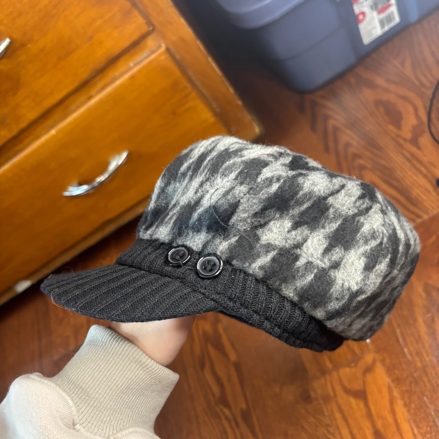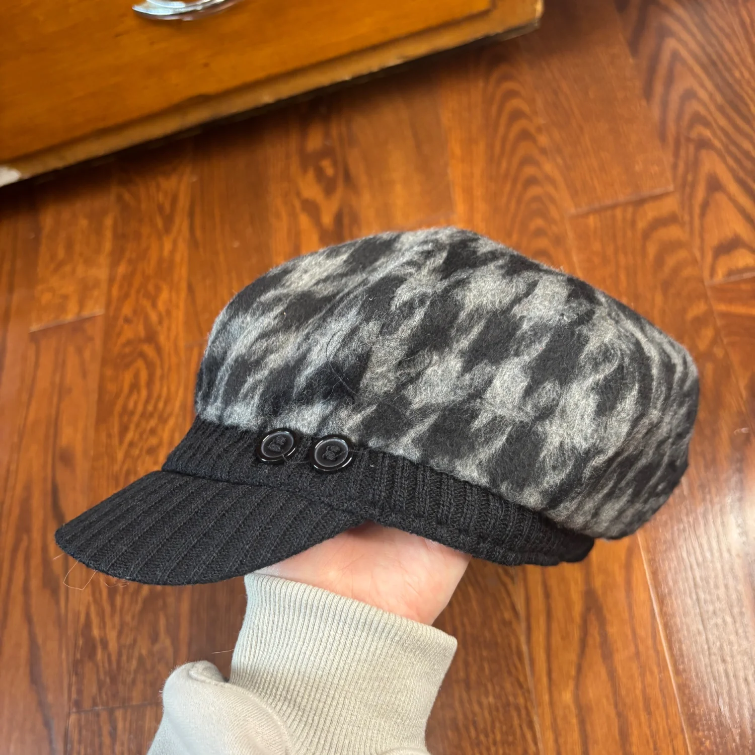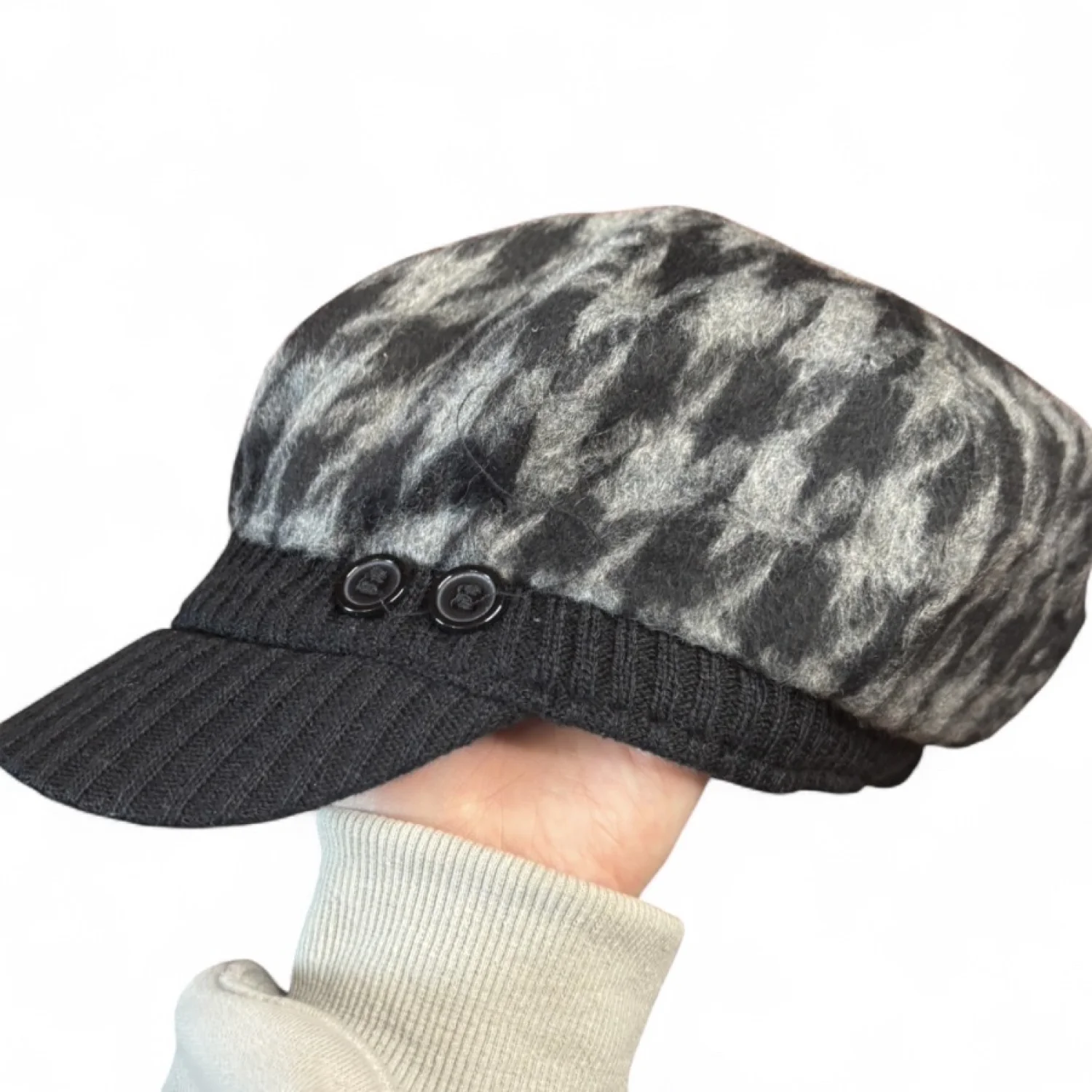 Stylish wool-blend cadet cap featuring a black and gray houndstooth pattern. Soft, warm fabric with a ribbed black brim and decorative side buttons. Designed for comfortable everyday wear and easy outfit coordination. Newsboy Cap, a feminine wool baker boy hat featuring a plaid patterned grey and black design with decorative buttons. Only flaw is that the plastic inside the brim is broken, but does not seem noticeable when wearing. Cotton and polyester One size, otherwise great condition Peaky blinders, Heritage, dark academia, urban chic, grunge, retro.