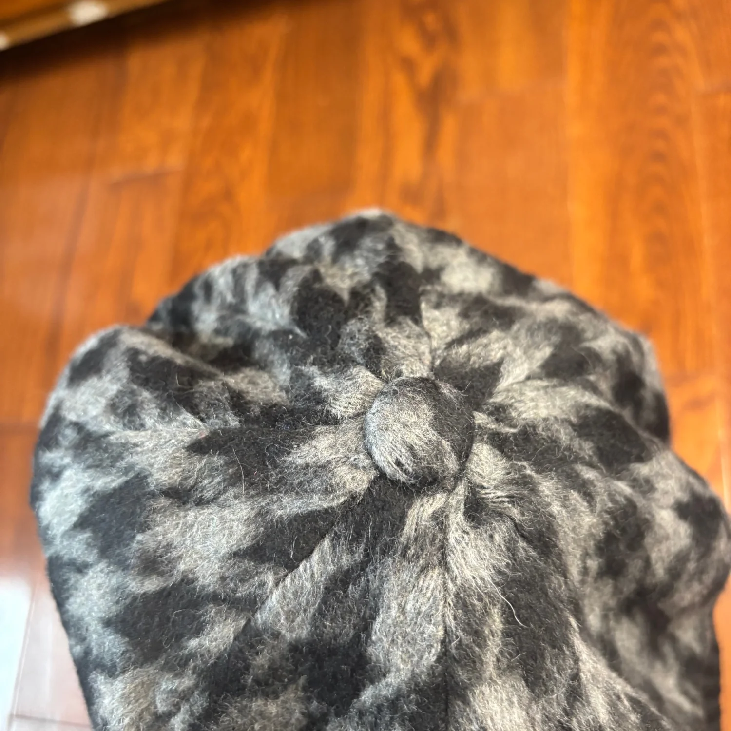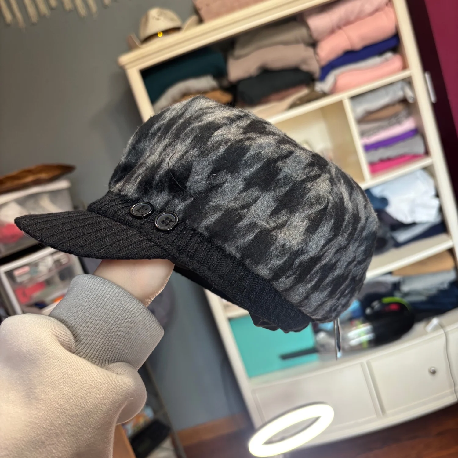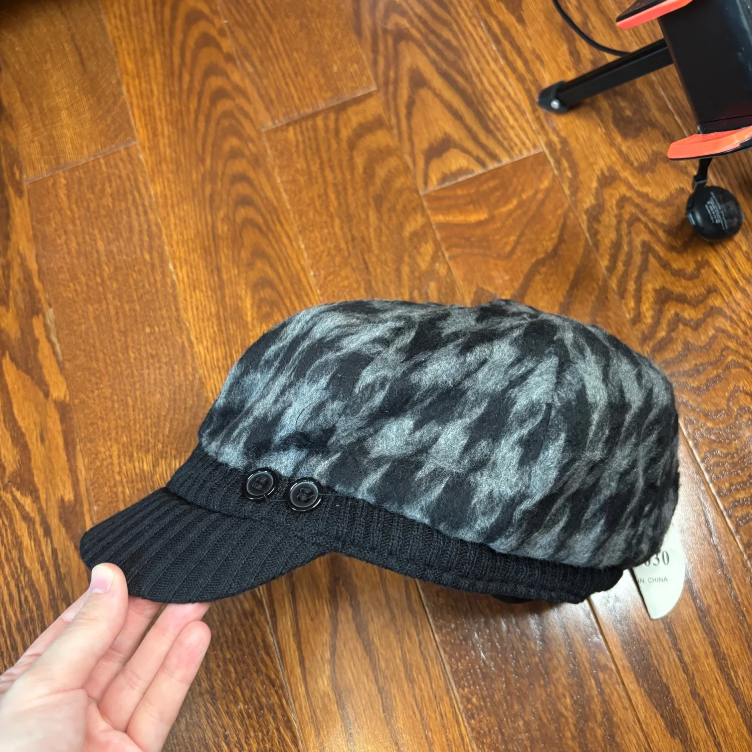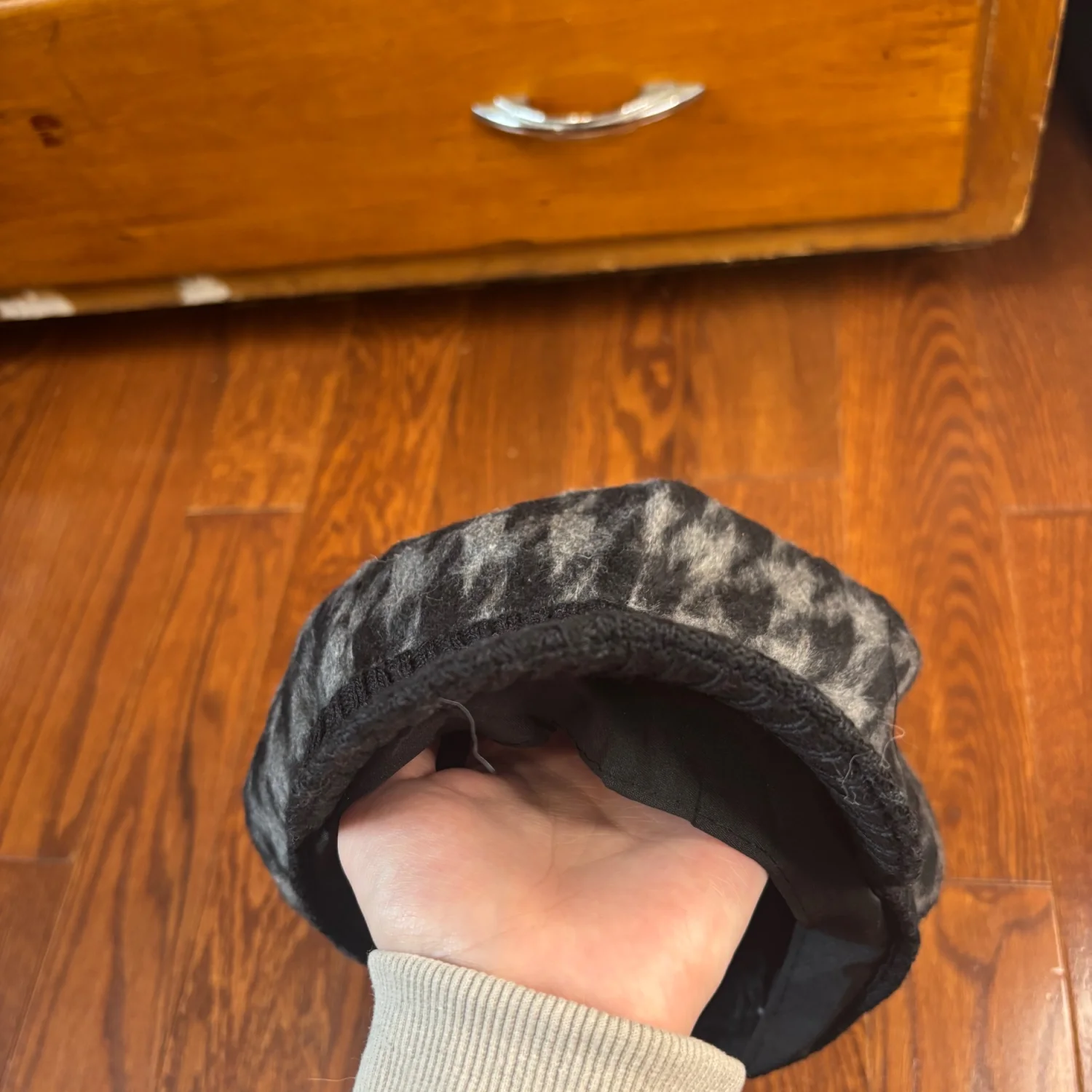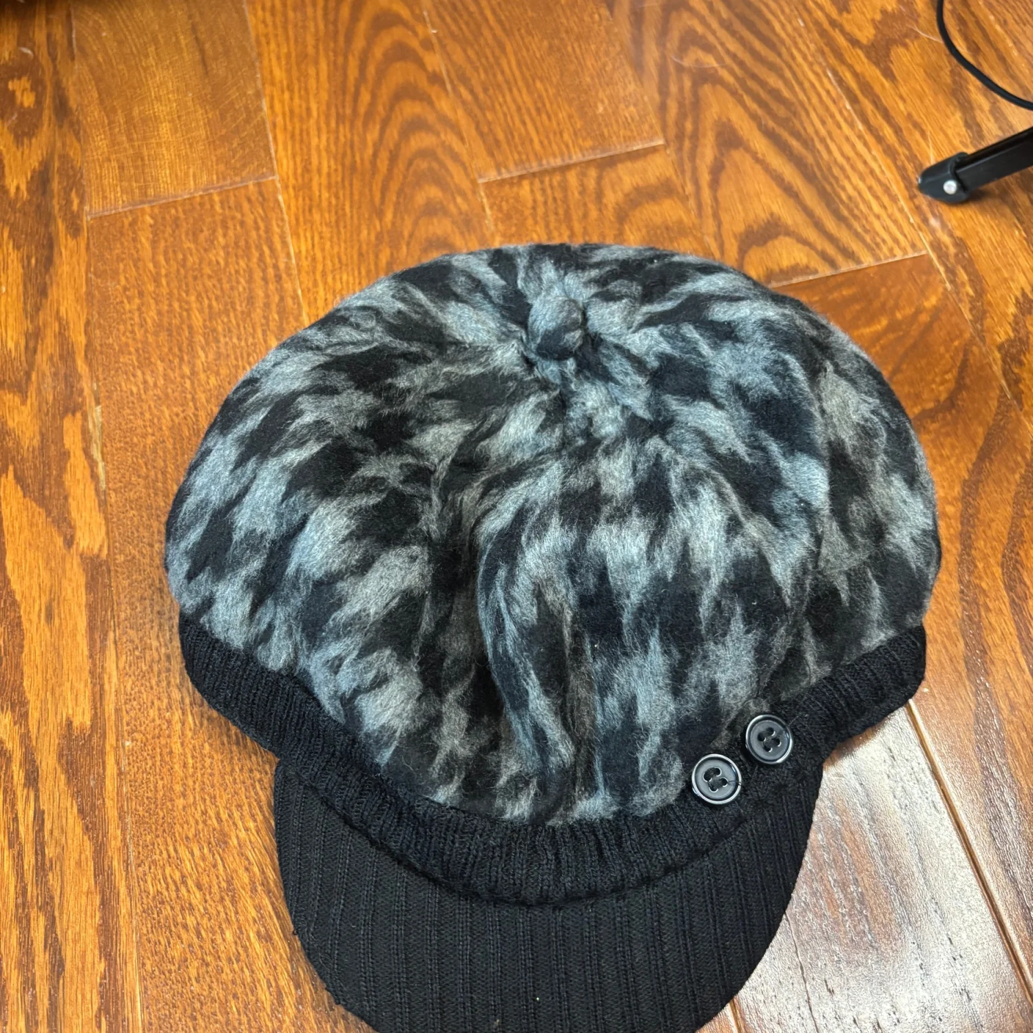 Stylish wool-blend cadet cap featuring a black and gray houndstooth pattern. Soft, warm fabric with a ribbed black brim and decorative side buttons. Designed for comfortable everyday wear and easy outfit coordination. Newsboy Cap, a feminine wool baker boy hat featuring a plaid patterned grey and black design with decorative buttons. Only flaw is that the plastic inside the brim is broken, but does not seem noticeable when wearing. Cotton and polyester One size, otherwise great condition Peaky blinders, Heritage, dark academia, urban chic, grunge, retro.
