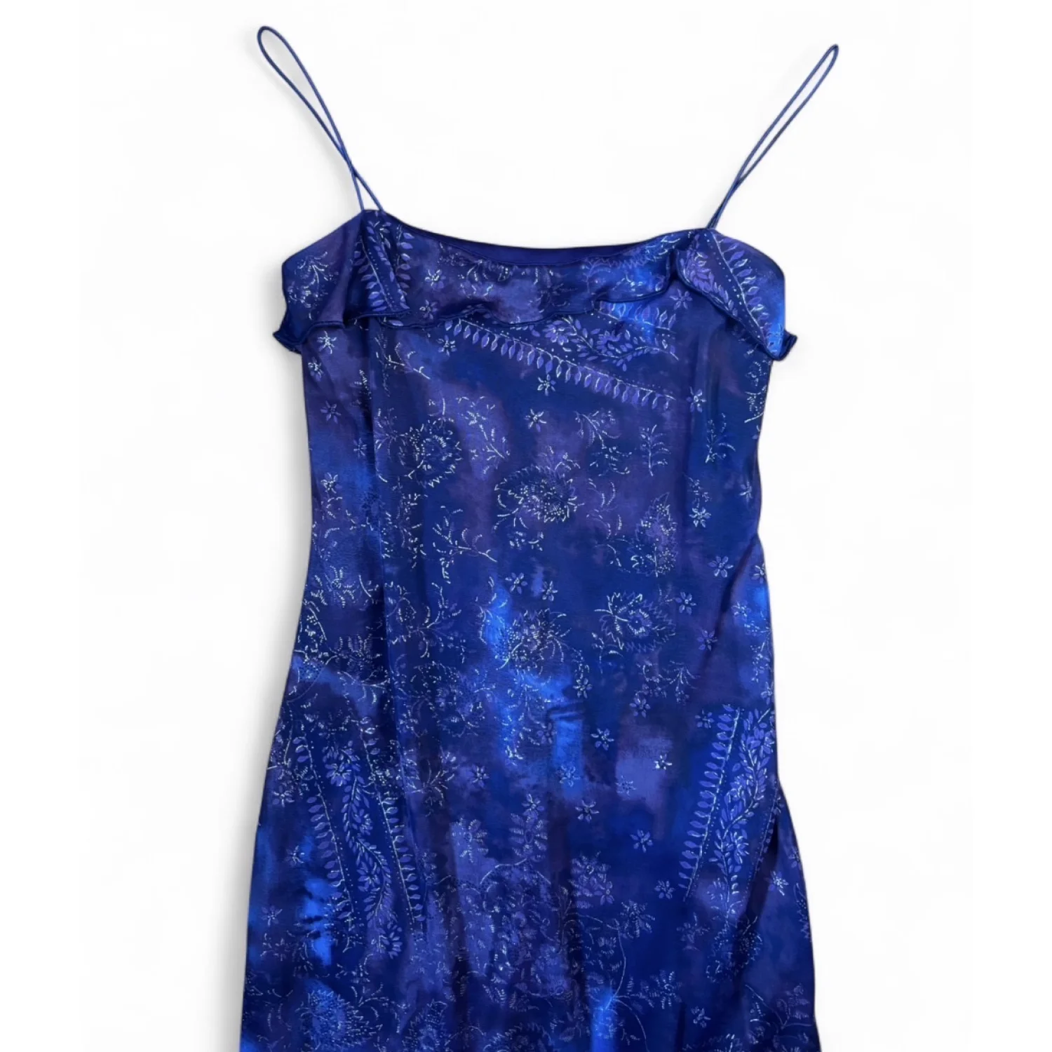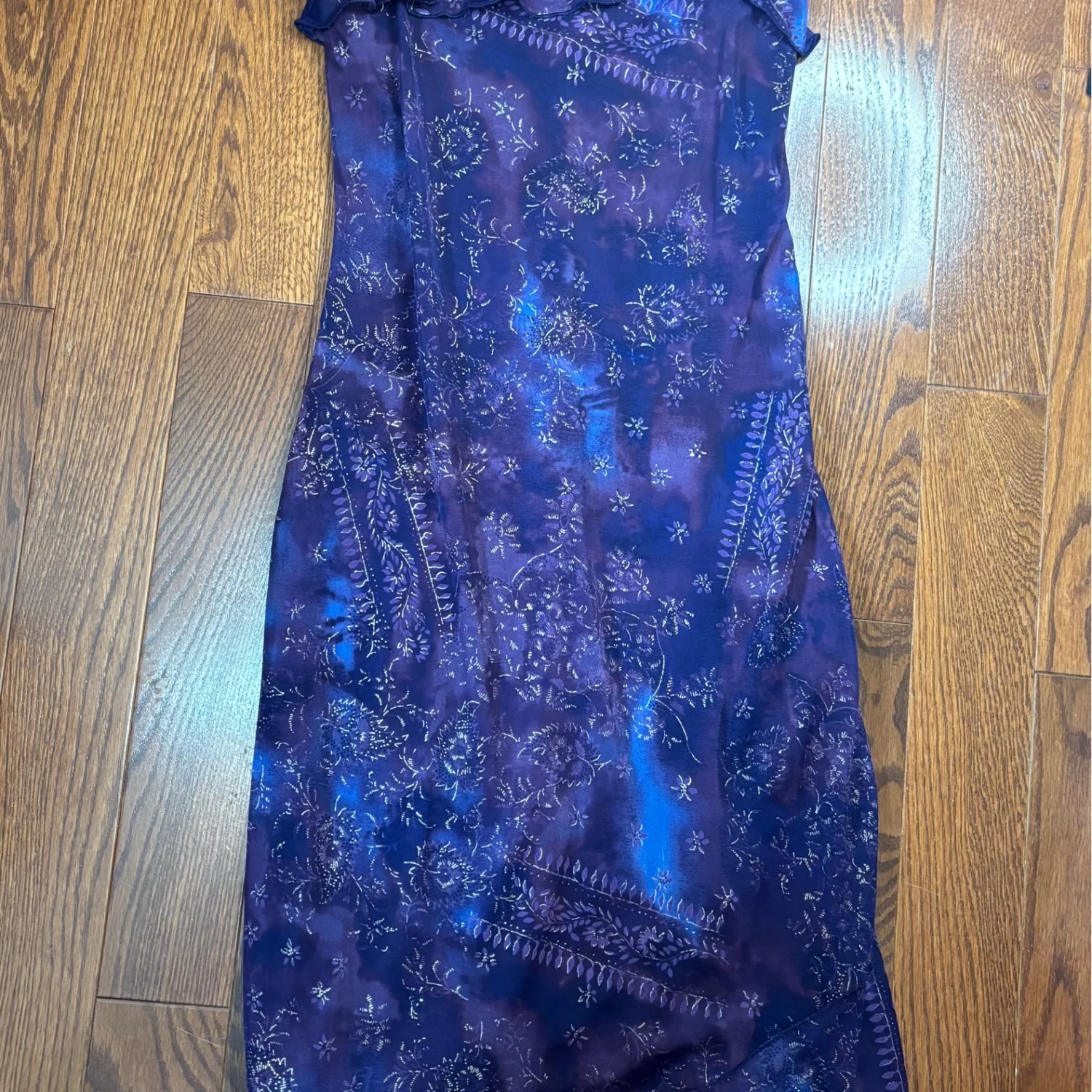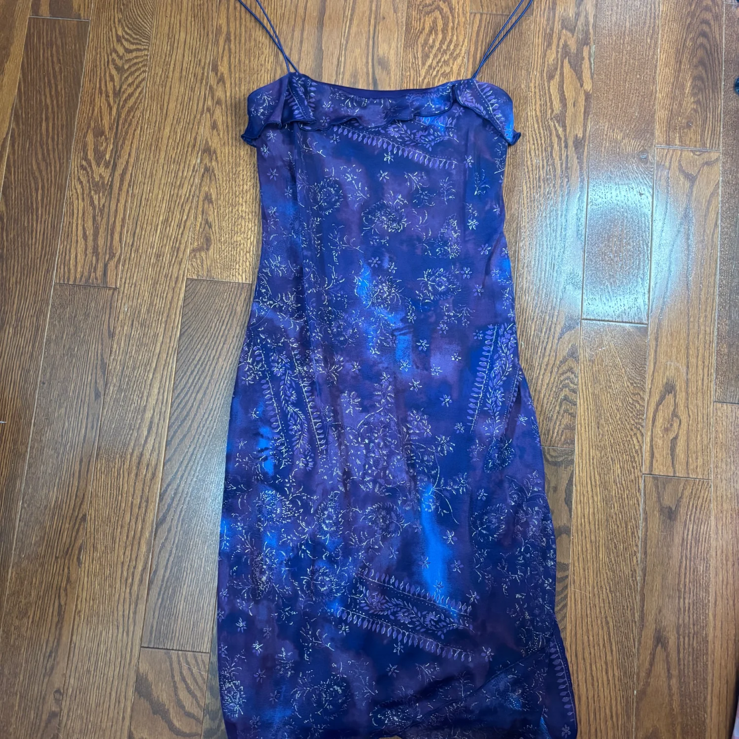 Y2K Byer Too! dress. This brand was popular in the 1990s and early 2000s (Y2K era) and is known for its whimsical, fairy, and grunge-style dresses. Key characteristics of this specific dress and the brand's style include: Design: The dress features a vibrant blue and purple floral pattern with a ruffled bust and an asymmetrical or handkerchief hemline. Aesthetic: It aligns with the "whimsigoth" or "fairycore" aesthetic popular during that period, often incorporating elements like glitter or mesh overlays. Versatility: These vintage dresses are noted for their versatility in styling, suitable for various occasions depending on the accessories. Great condition, size medium but looks to fit a small best. Measurements include 33 inches long and putting pit is about 14 inches. 100% polyester