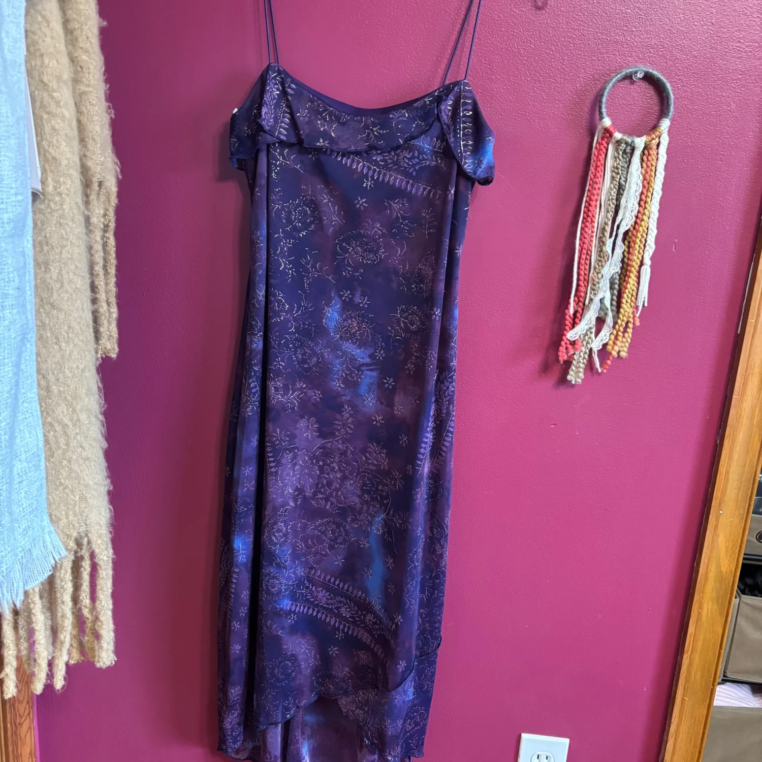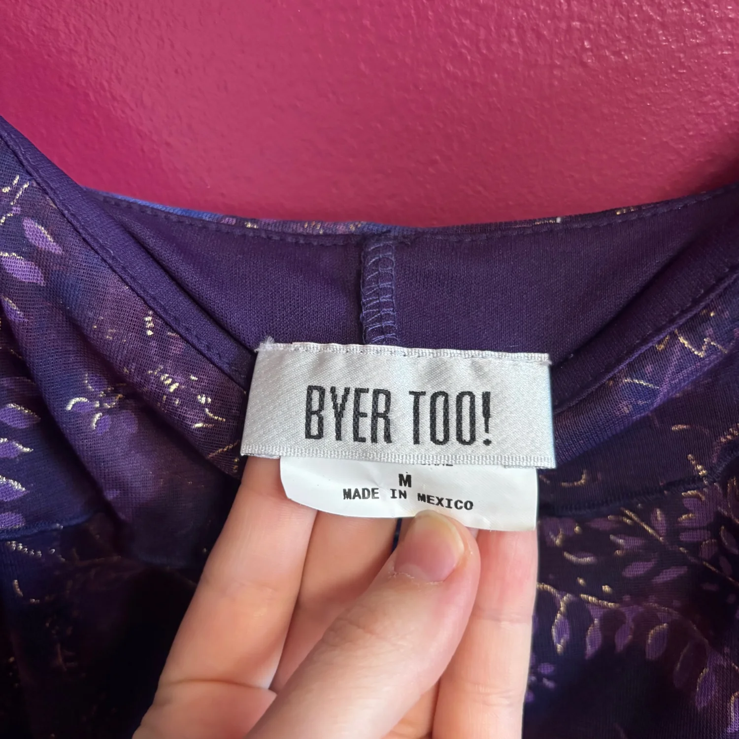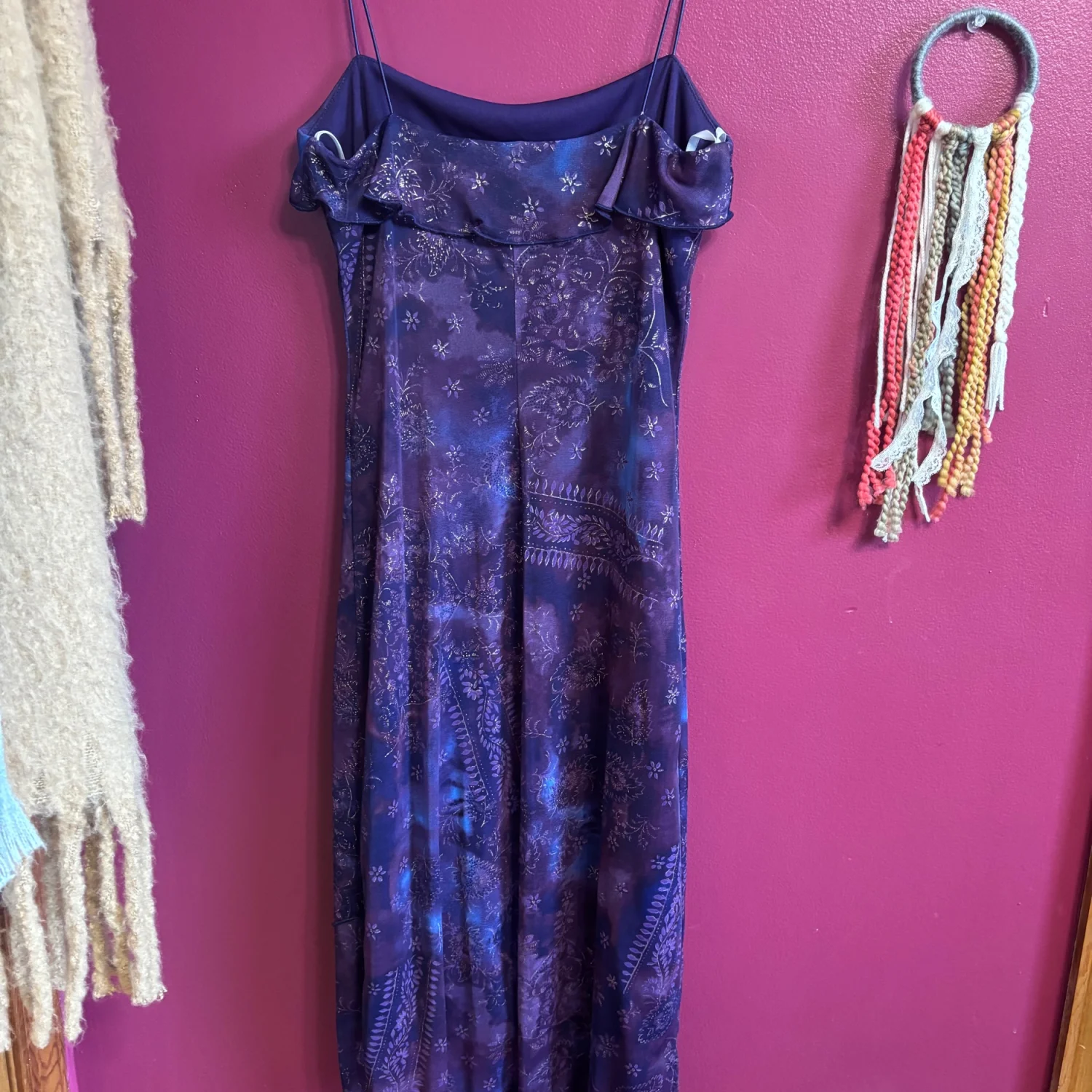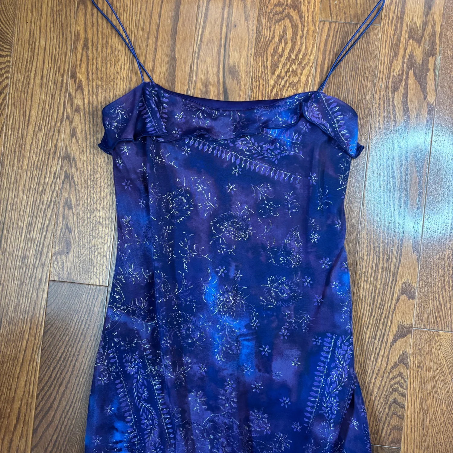 Y2K Byer Too! dress. This brand was popular in the 1990s and early 2000s (Y2K era) and is known for its whimsical, fairy, and grunge-style dresses. Key characteristics of this specific dress and the brand's style include: Design: The dress features a vibrant blue and purple floral pattern with a ruffled bust and an asymmetrical or handkerchief hemline. Aesthetic: It aligns with the "whimsigoth" or "fairycore" aesthetic popular during that period, often incorporating elements like glitter or mesh overlays. Versatility: These vintage dresses are noted for their versatility in styling, suitable for various occasions depending on the accessories. Great condition, size medium but looks to fit a small best. Measurements include 33 inches long and putting pit is about 14 inches. 100% polyester