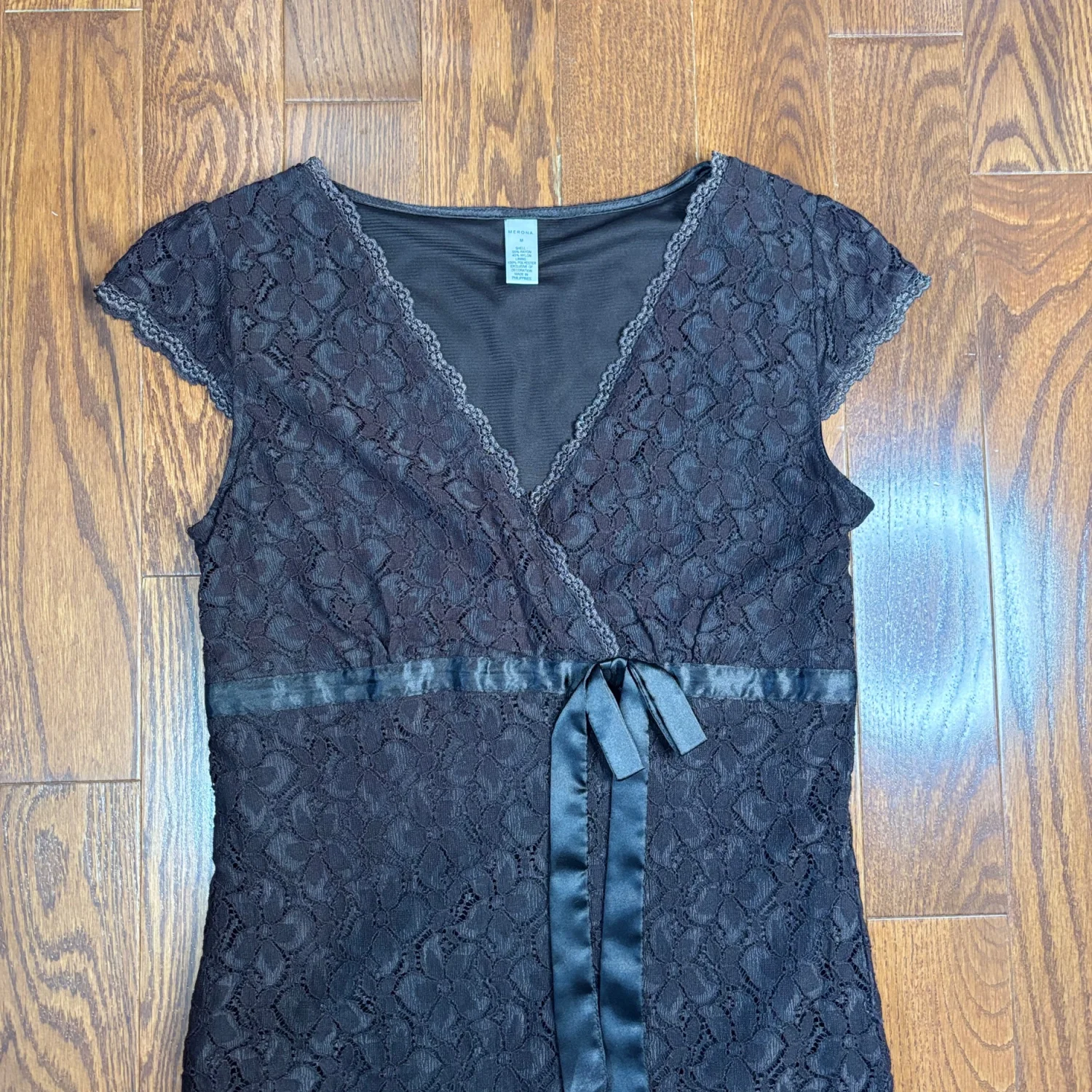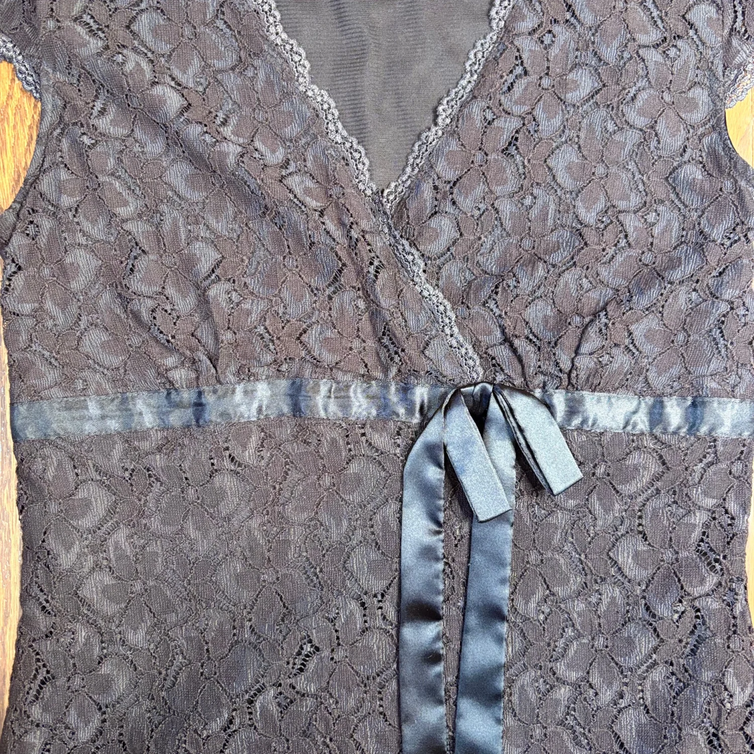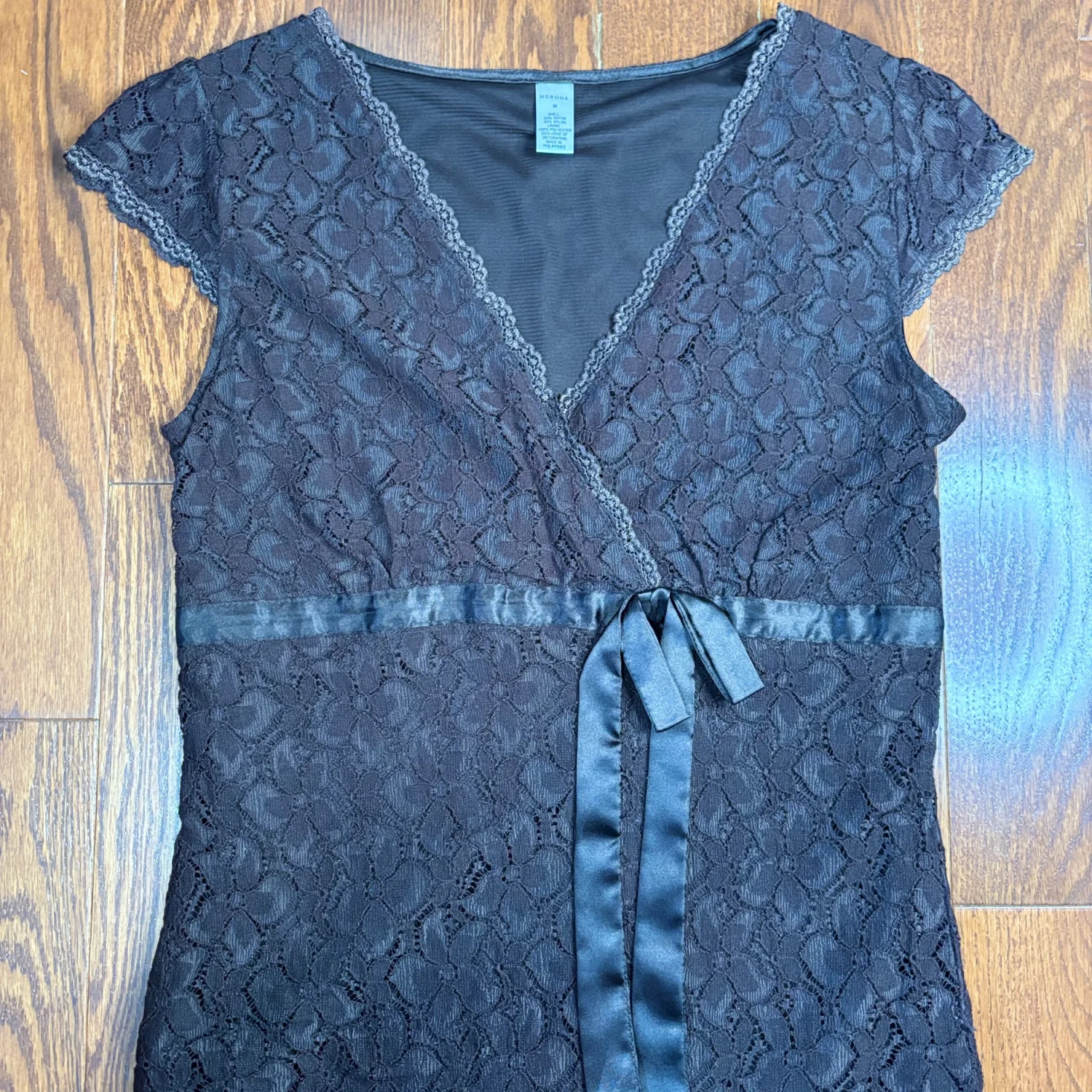 Y2K chocolate brown lace coquette merona blouse with lace detail throughout with under lining. Brown bow ribbon detail, v neckline. Size medium Great condition!