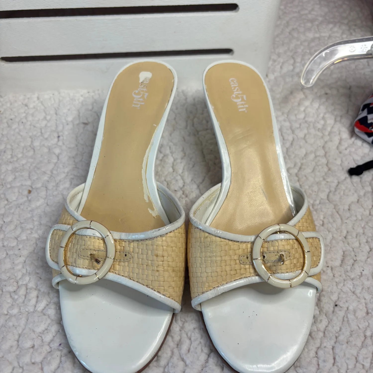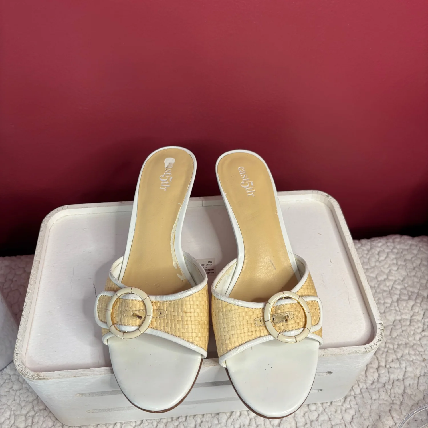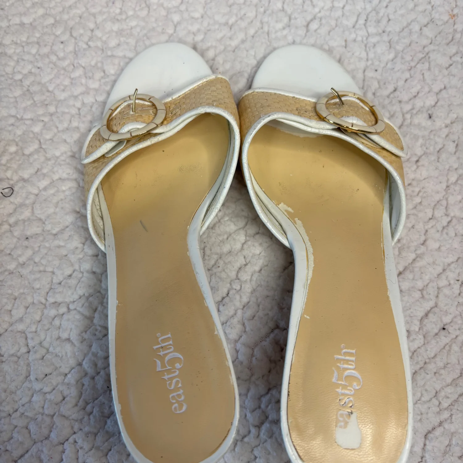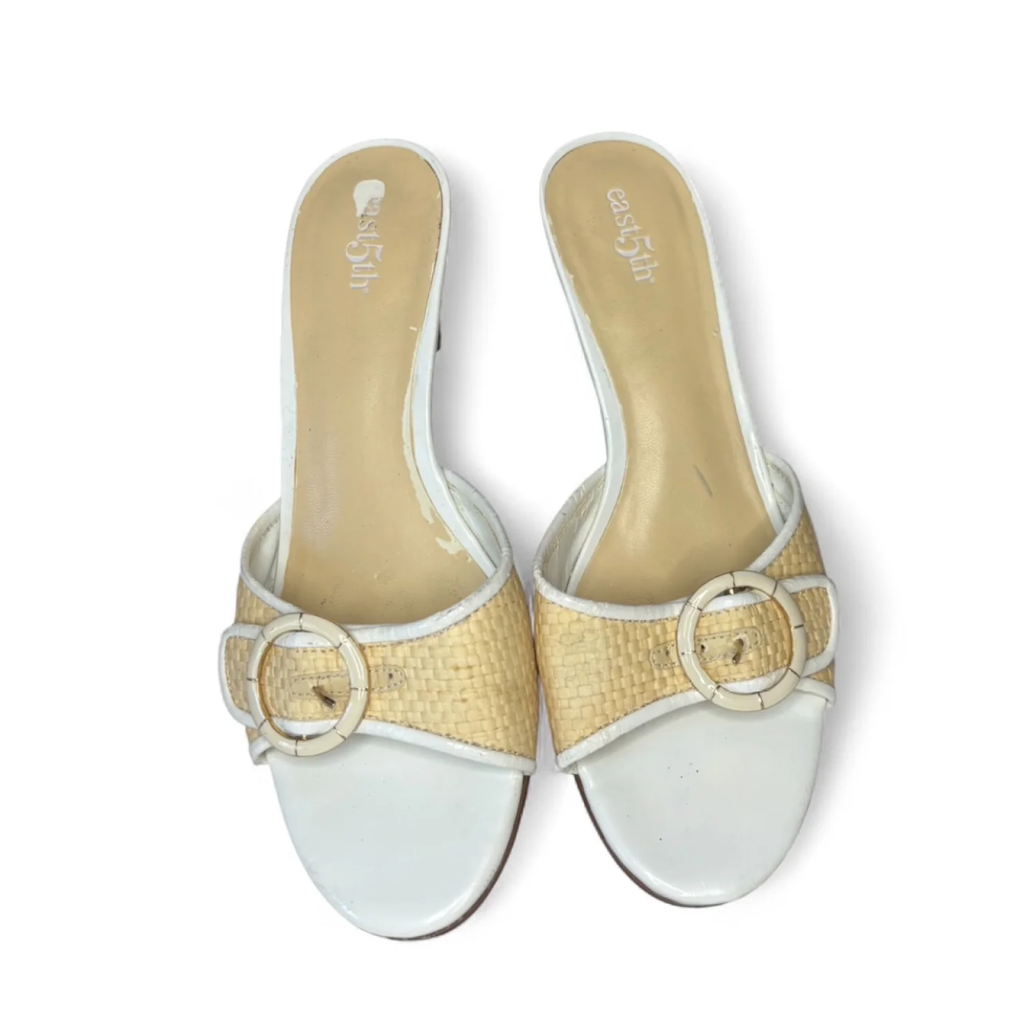 These Y2K East 5th brand mule Kitten sandals Heels feature a woven raffia-textured strap with a decorative buckle, a white leather-look trim, and a low block heel. These heels are timeless, although many flaws are still functional and can easily be hidden when worn. There is wear on the foot bed along with the heels with chips in them. Size 7, in satisfactory condition