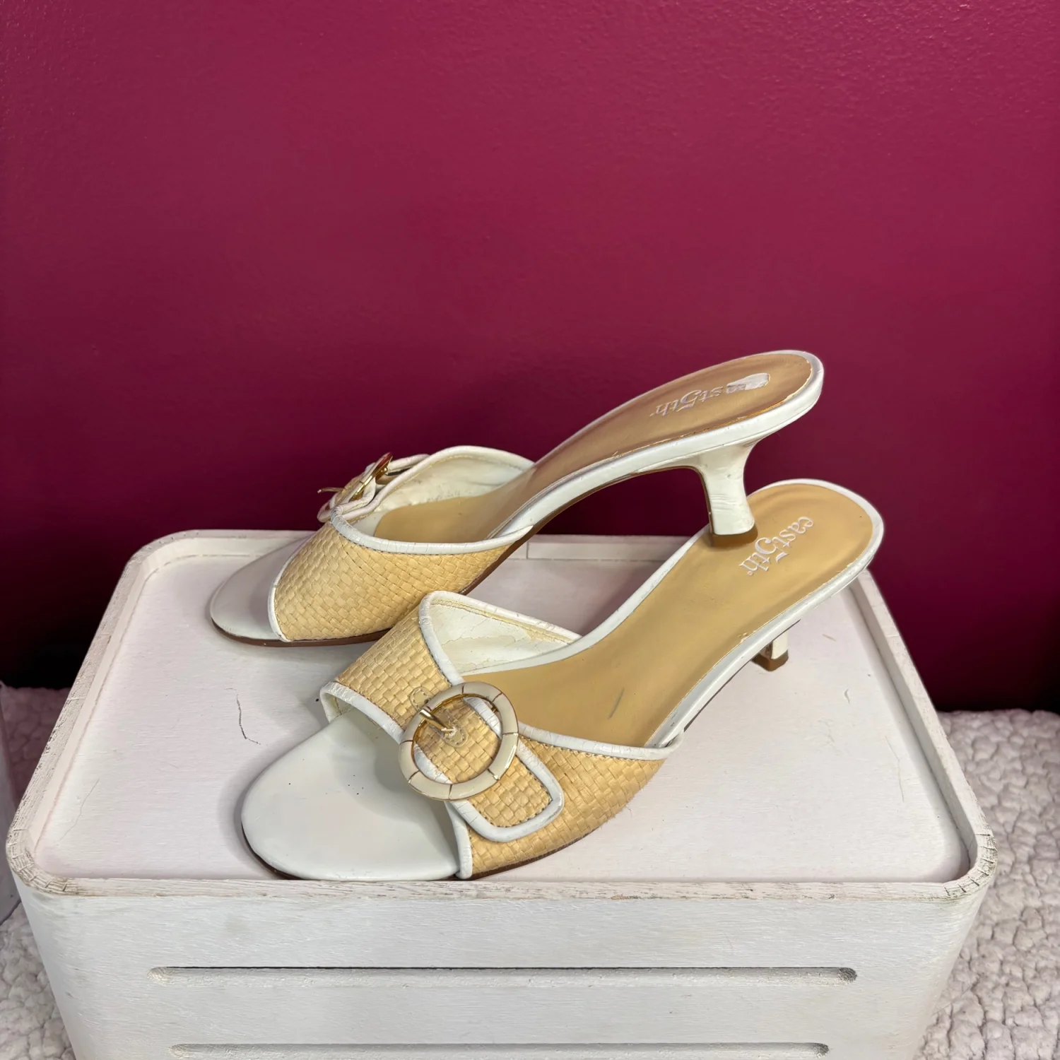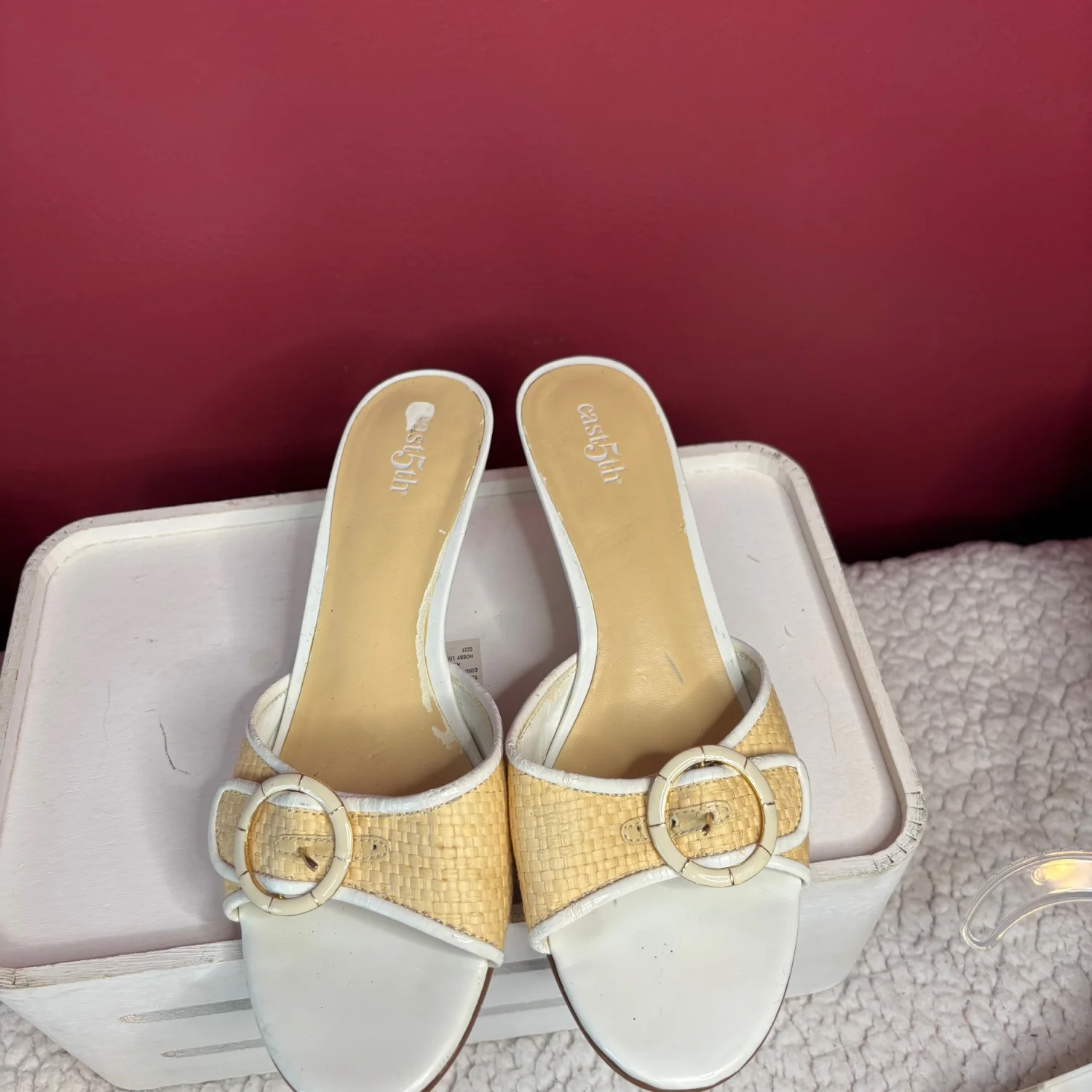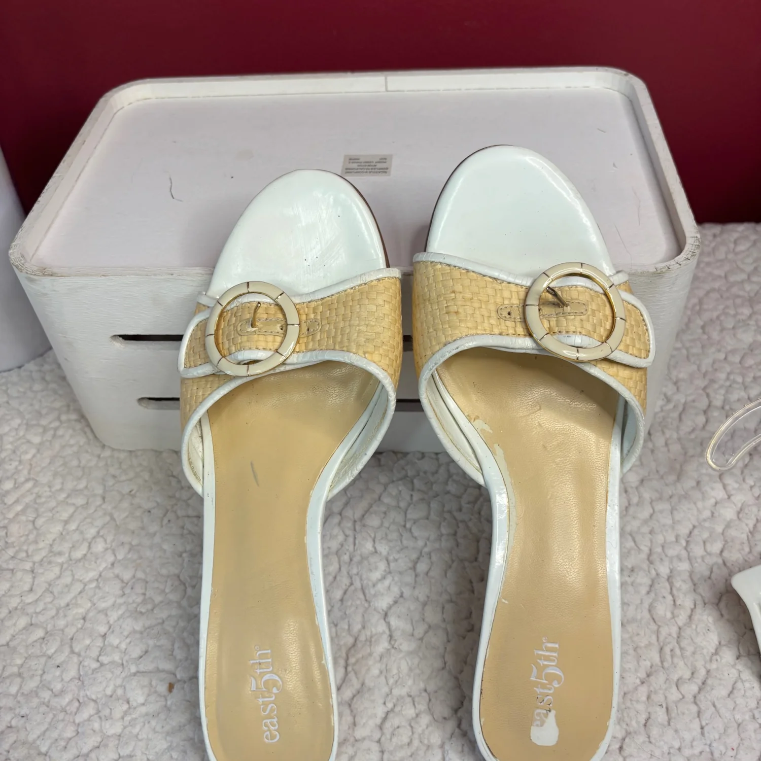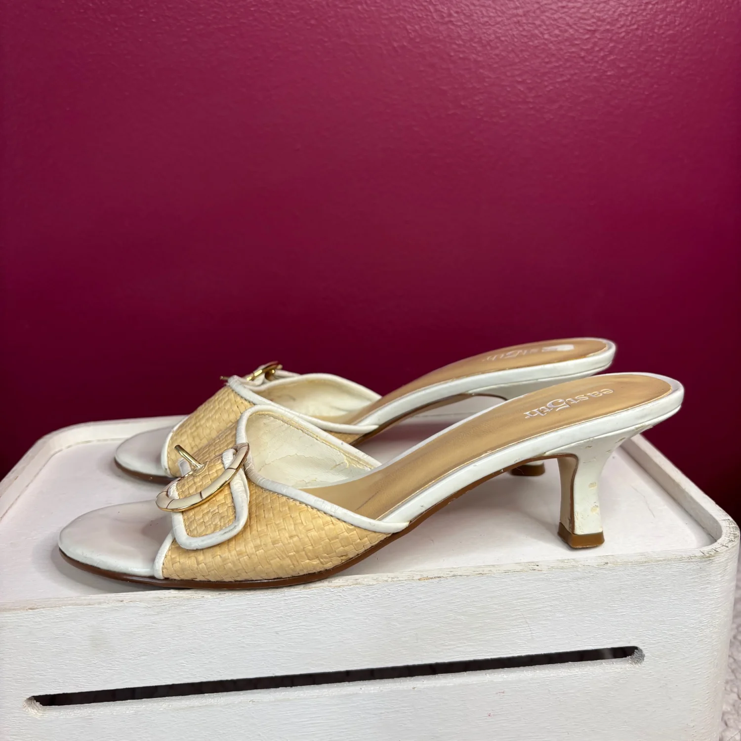 These Y2K East 5th brand mule Kitten sandals Heels feature a woven raffia-textured strap with a decorative buckle, a white leather-look trim, and a low block heel. These heels are timeless, although many flaws are still functional and can easily be hidden when worn. There is wear on the foot bed along with the heels with chips in them. Size 7, in satisfactory condition
