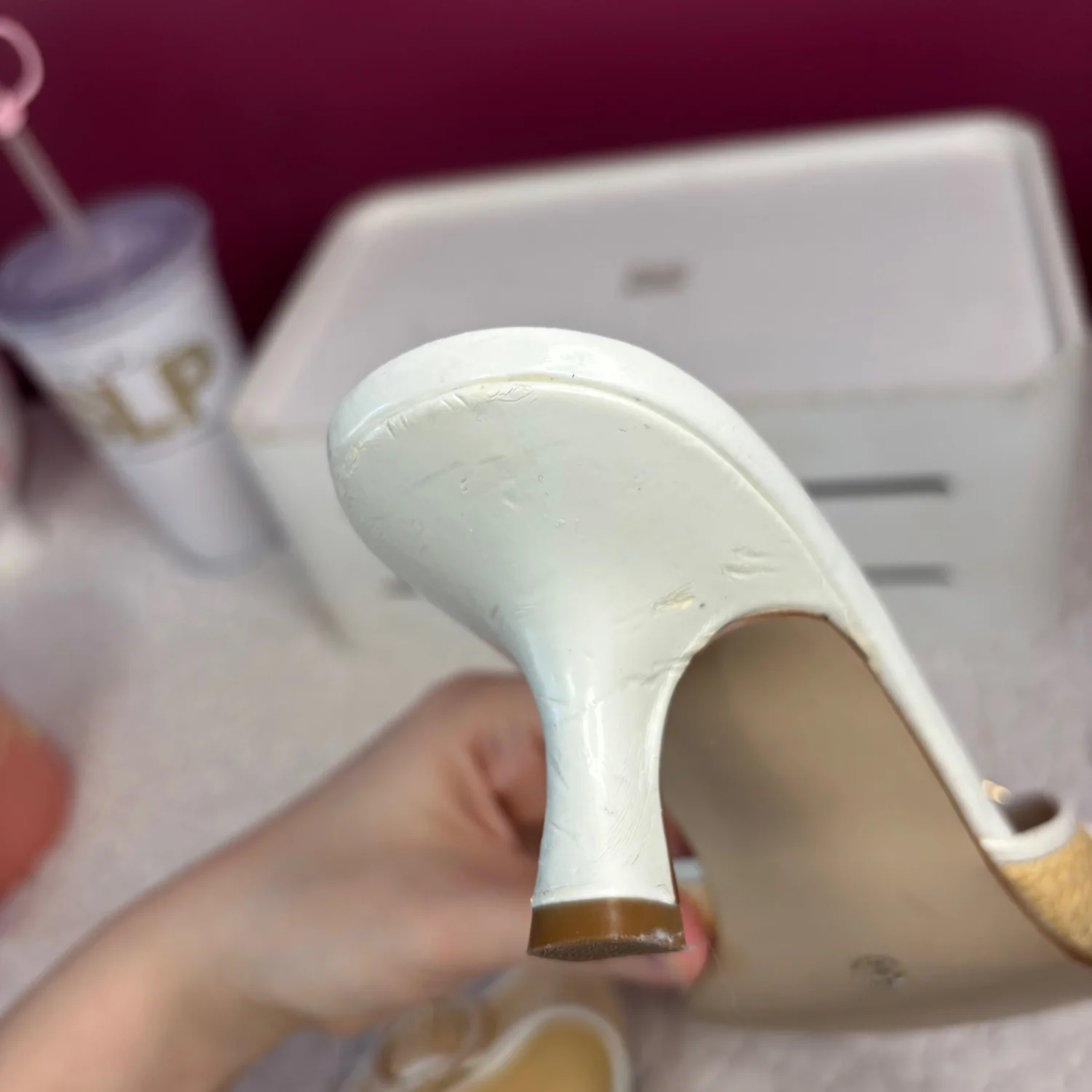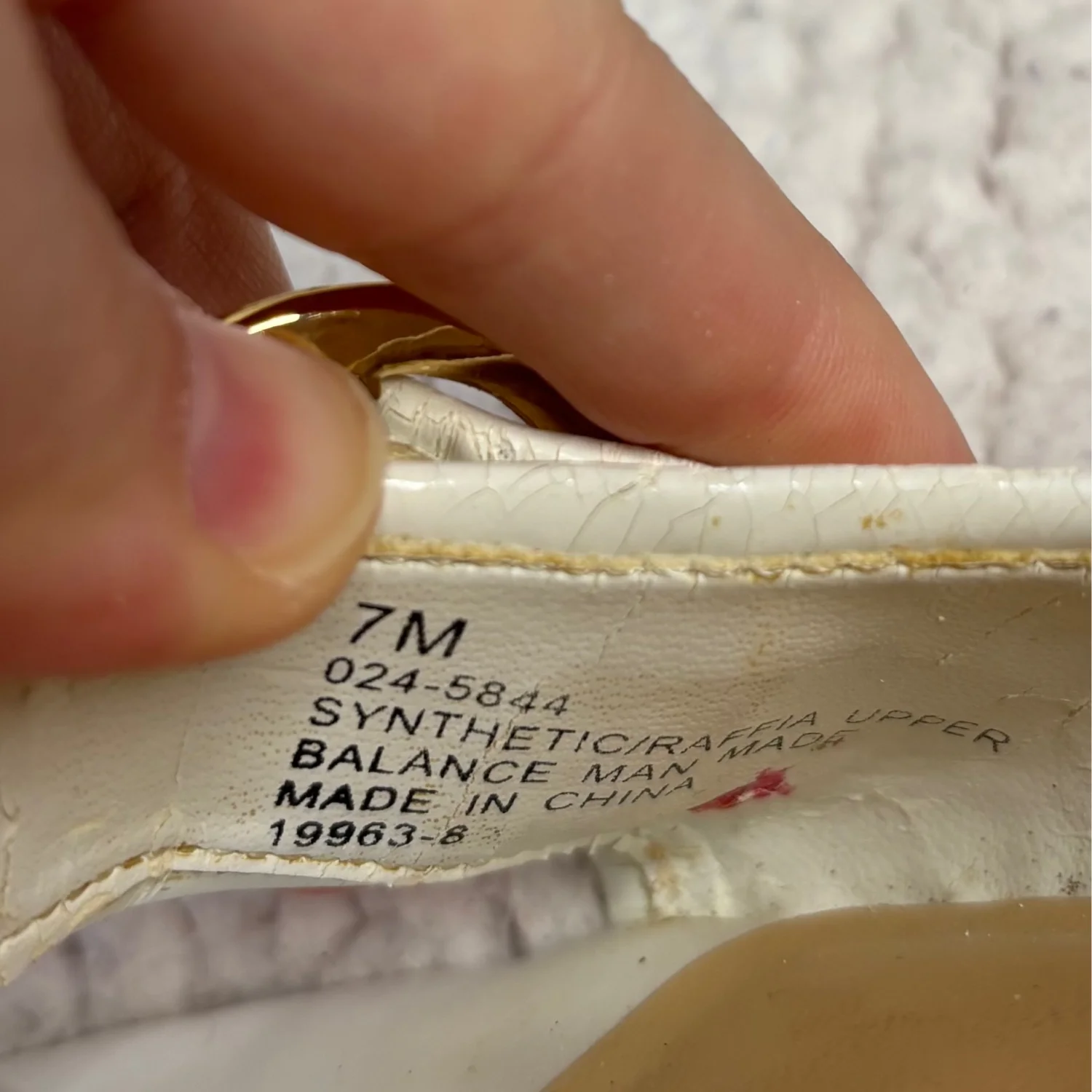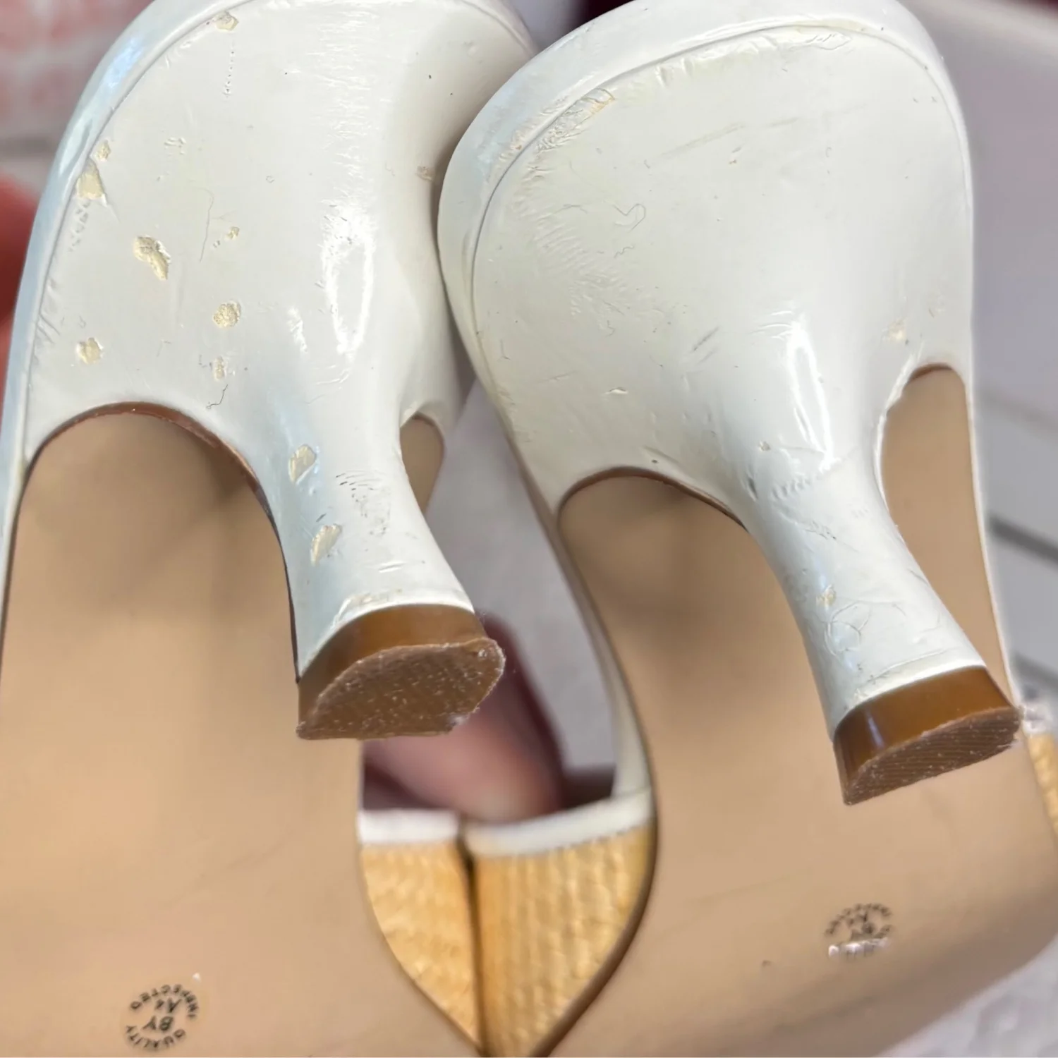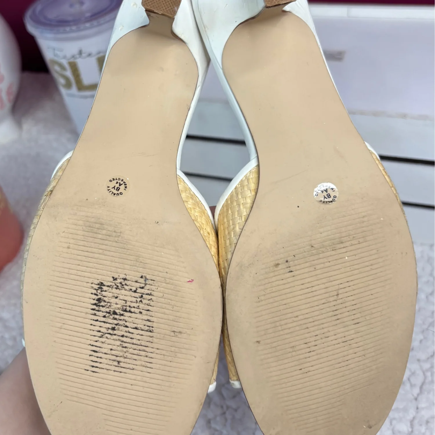 These Y2K East 5th brand mule Kitten sandals Heels feature a woven raffia-textured strap with a decorative buckle, a white leather-look trim, and a low block heel. These heels are timeless, although many flaws are still functional and can easily be hidden when worn. There is wear on the foot bed along with the heels with chips in them. Size 7, in satisfactory condition