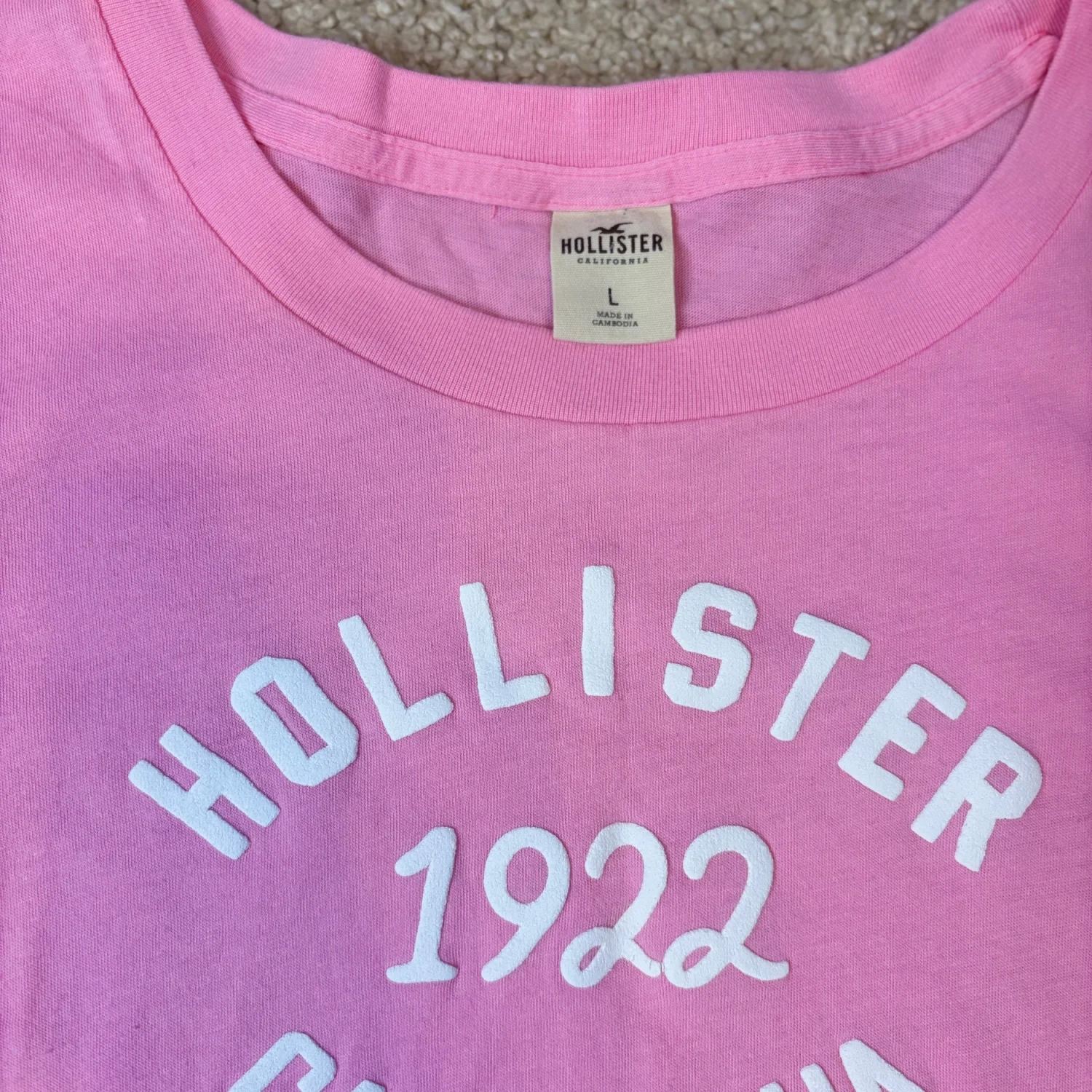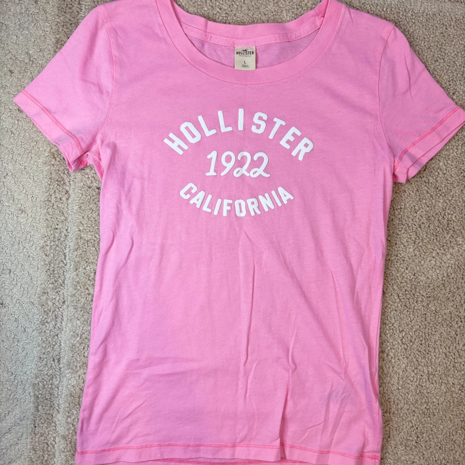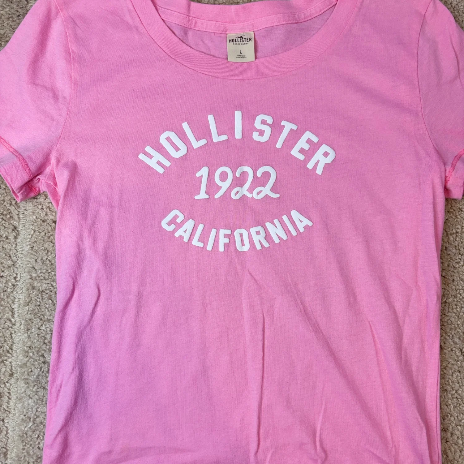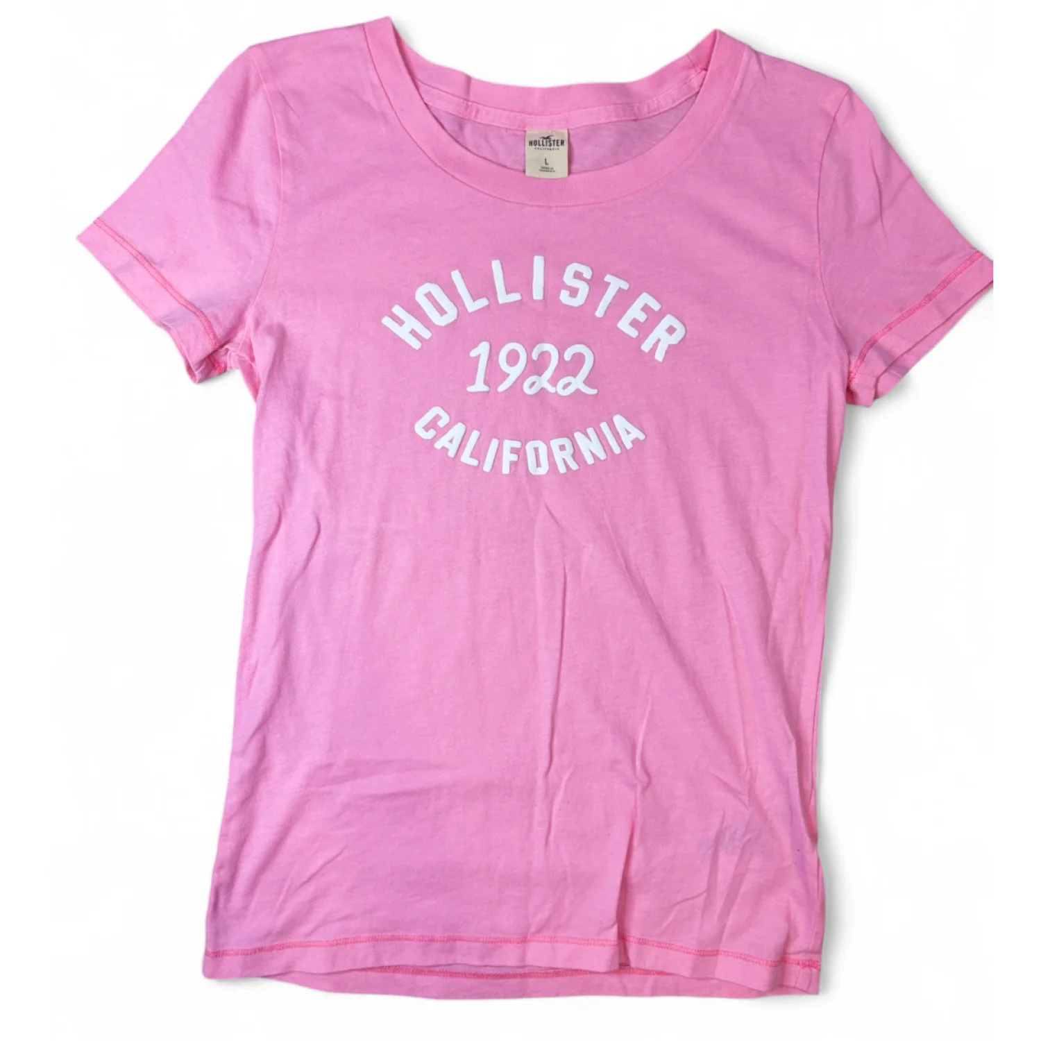 This item is a Y2K pink graphic t-shirt from Hollister featuring a white "HOLLISTER 1922 CALIFORNIA" logo Size large Super soft and in great condition!