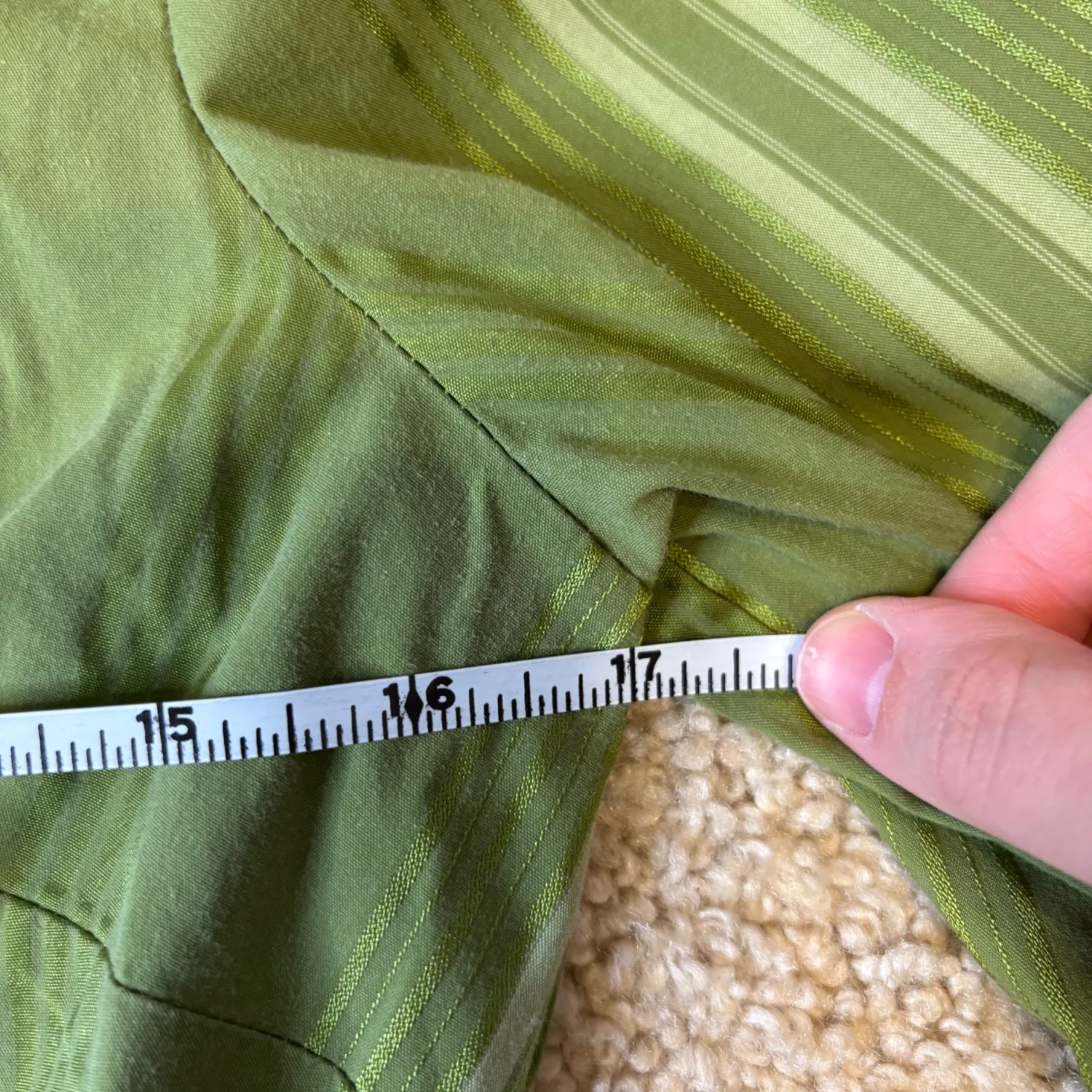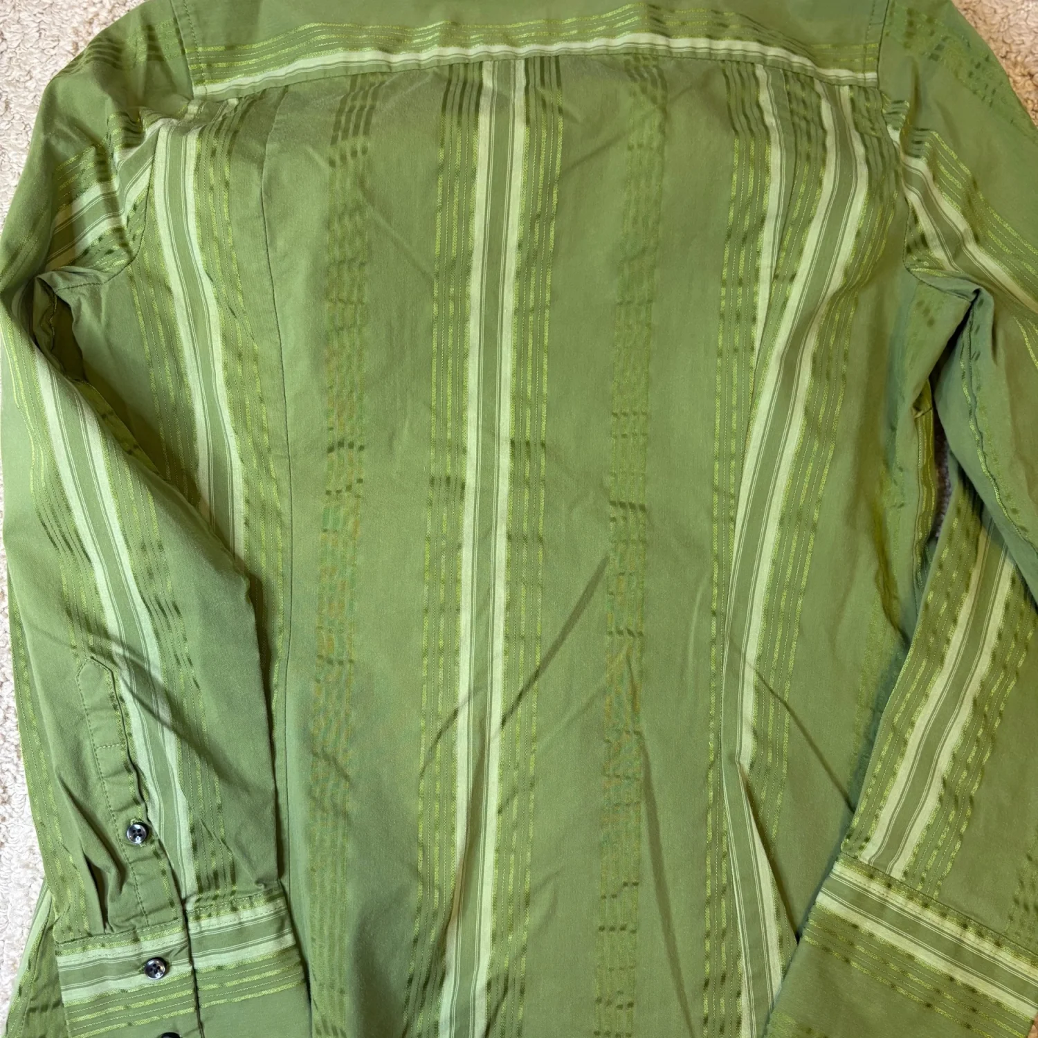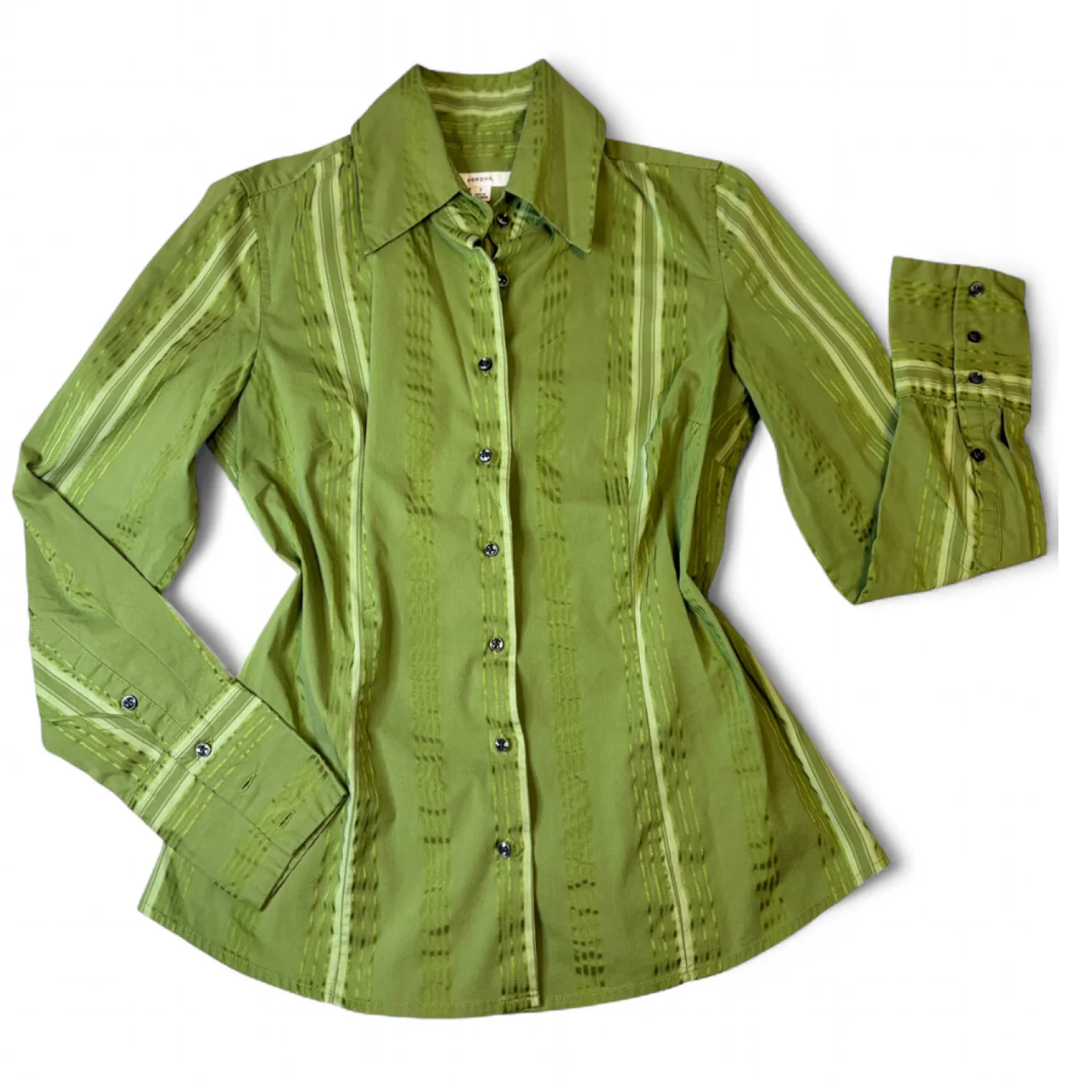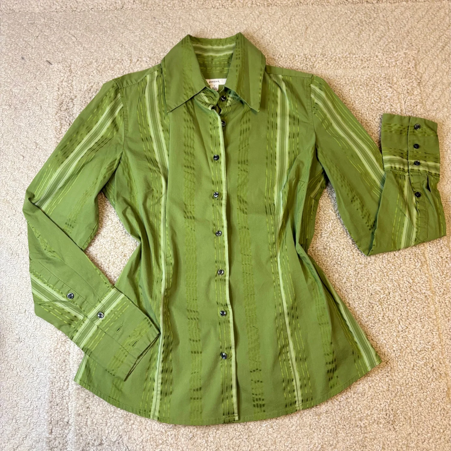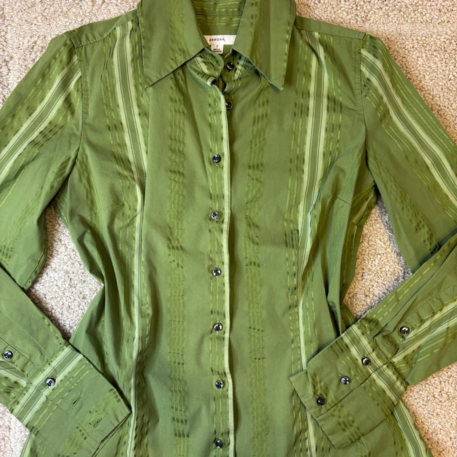 Y2K Merona green vertical striped long sleeve button down blouse v neck top size small Great condition Pit to pit is about 17 inches Pit down is about 14.5 inches Arms about 16.5 inches Cotton, nylon, polyester, spandex