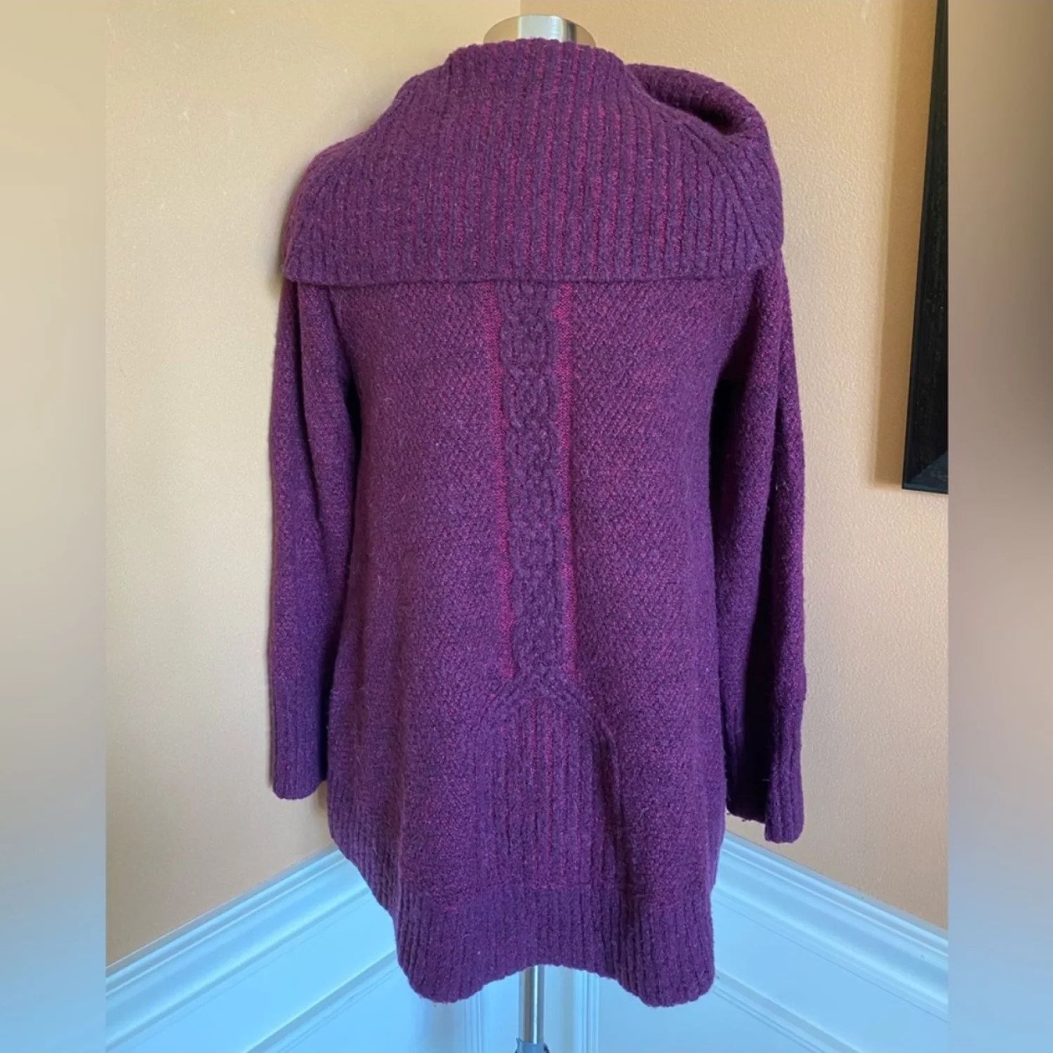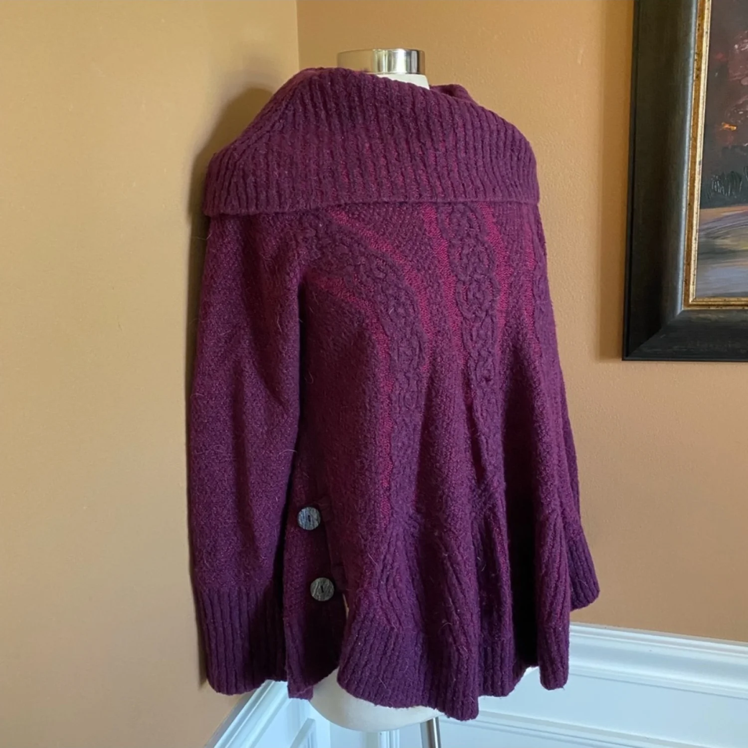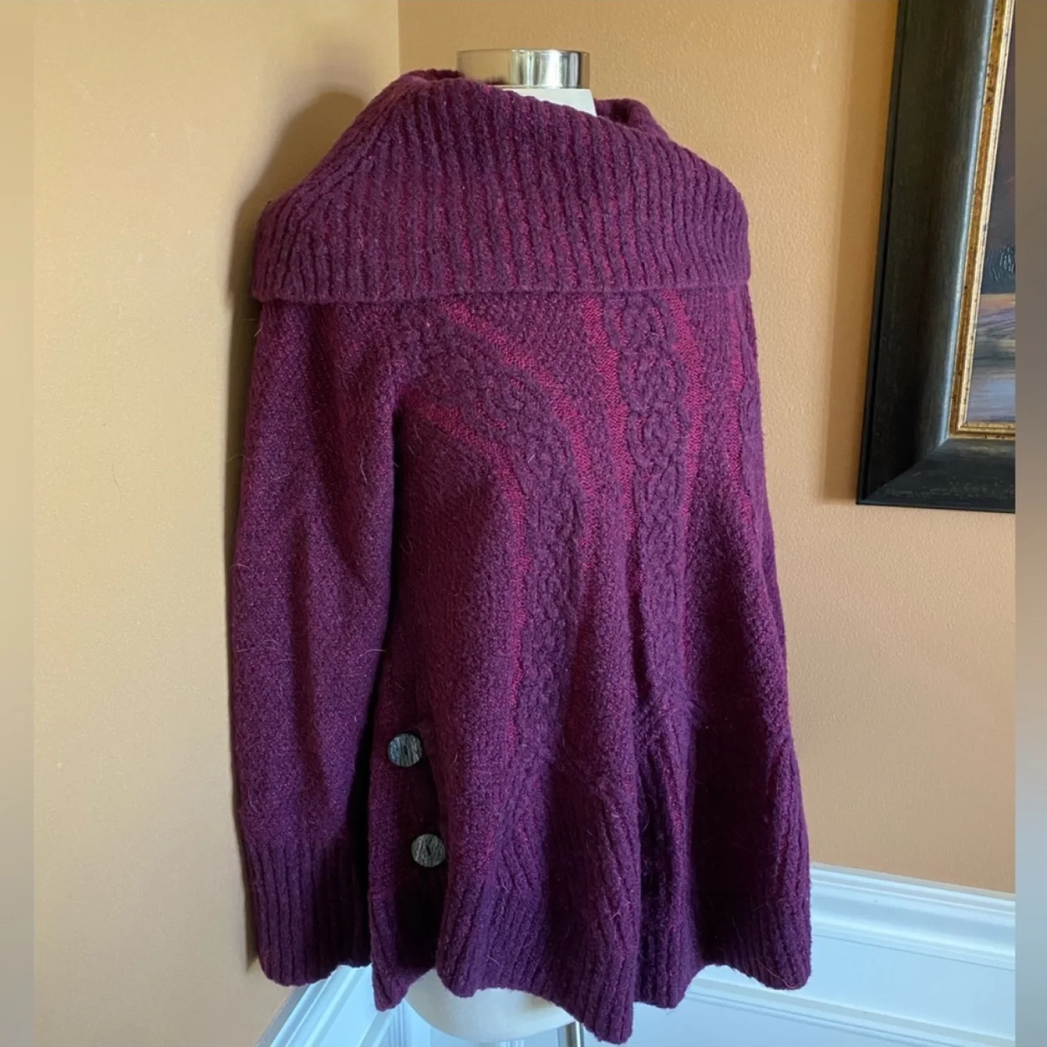 Anthropologie wool blend chunky Knit Side Button Detail Cowl Neck Sweater L Size: Large Condition: very good, no noted flaws Features: Flowing wide hem Cable knit Cowl neck 2 Working side buttons on each side Laying flat, measuring from: Pit to pit is approx. 20.5in. Shoulder to hem approx. 24in.