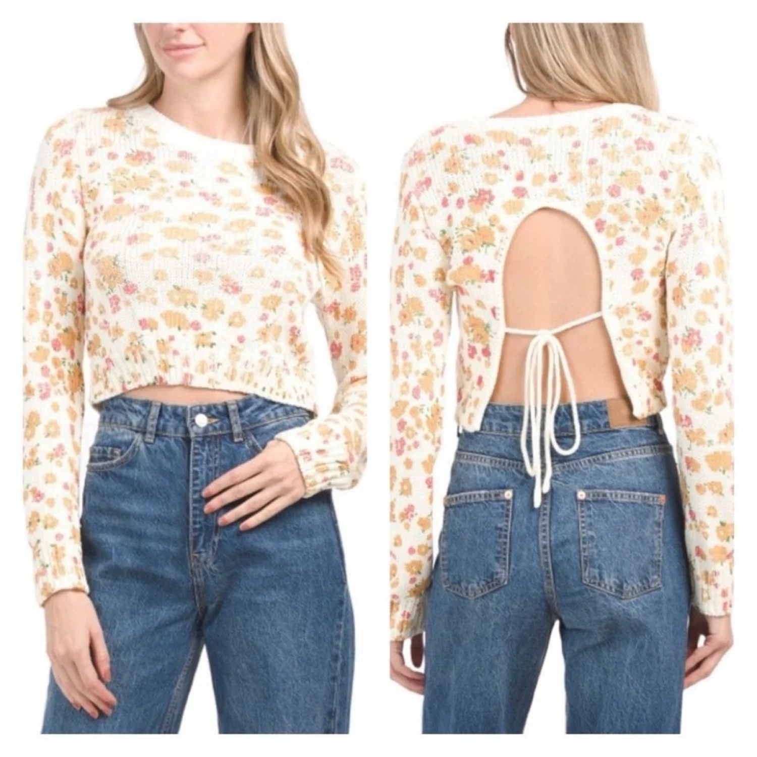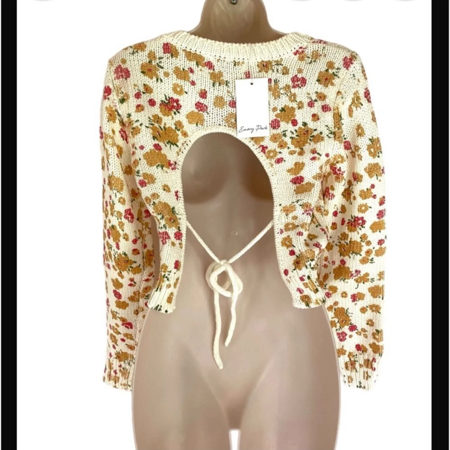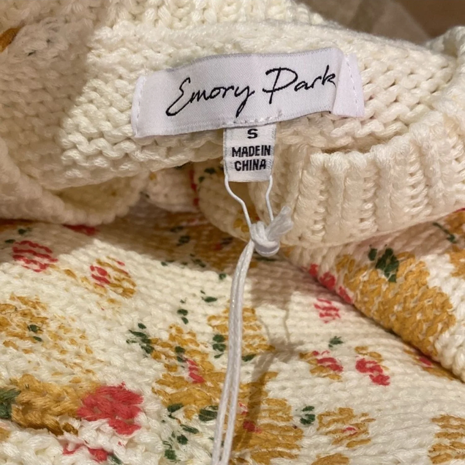 Emory Park Everly Sweater Open Back Floral S NWT Size: Small Condition: New with tags Features: Add Spring colors to your closet with this crewneck pullover sweater from Emory Park. This floral patterned long-sleeve sweater brings an updated look to your wardrobe. Fashioned in a comfortable mid-crop fit, it features an adjustable back tie with ribbed cuffs and hem. • 100% Acrylic Imported • Contrasted Sweater Top With Back Cut Out MSRP $75 Laying flat, measuring from: Pit to pit is approx. 17.75in. Shoulder to hem approx. 16in.