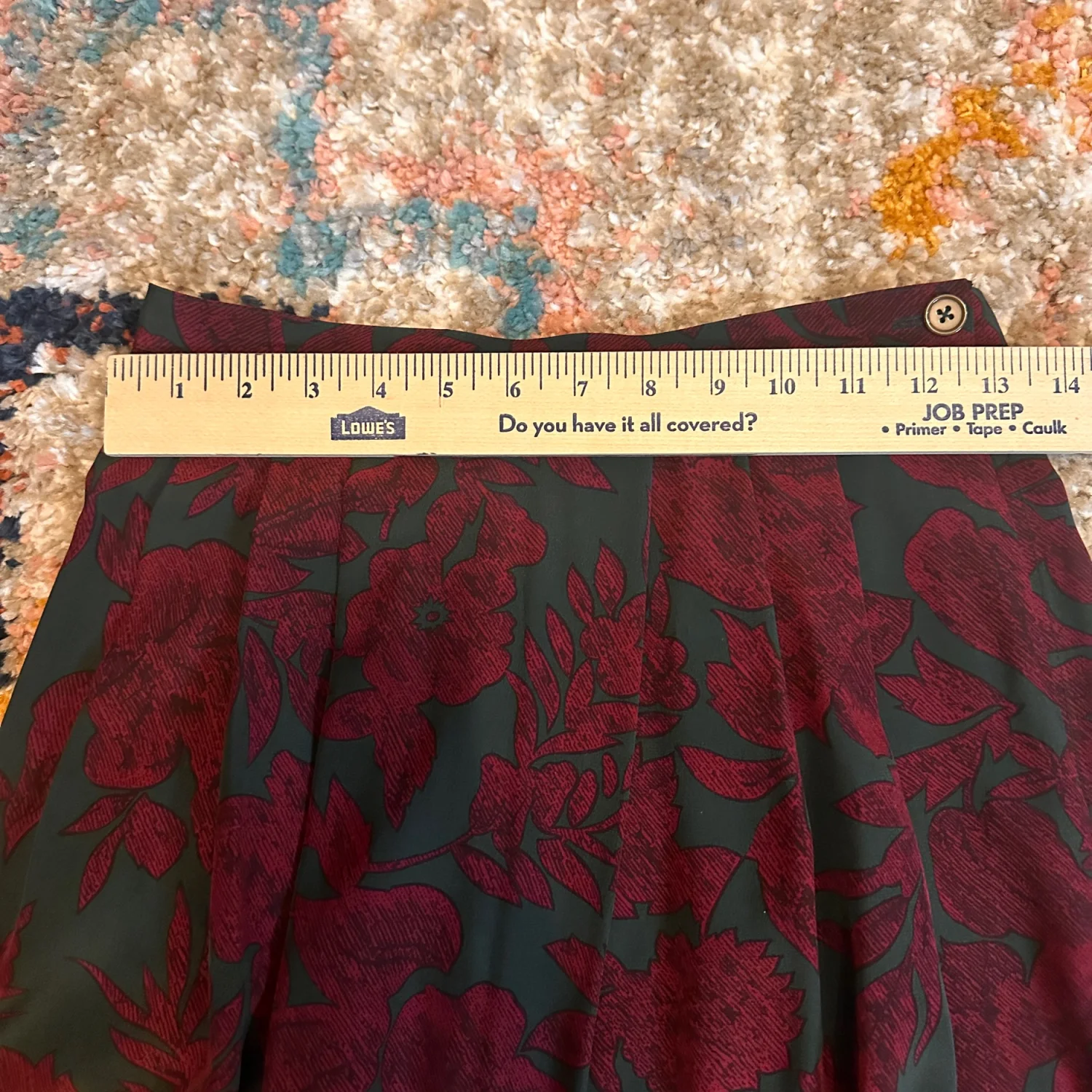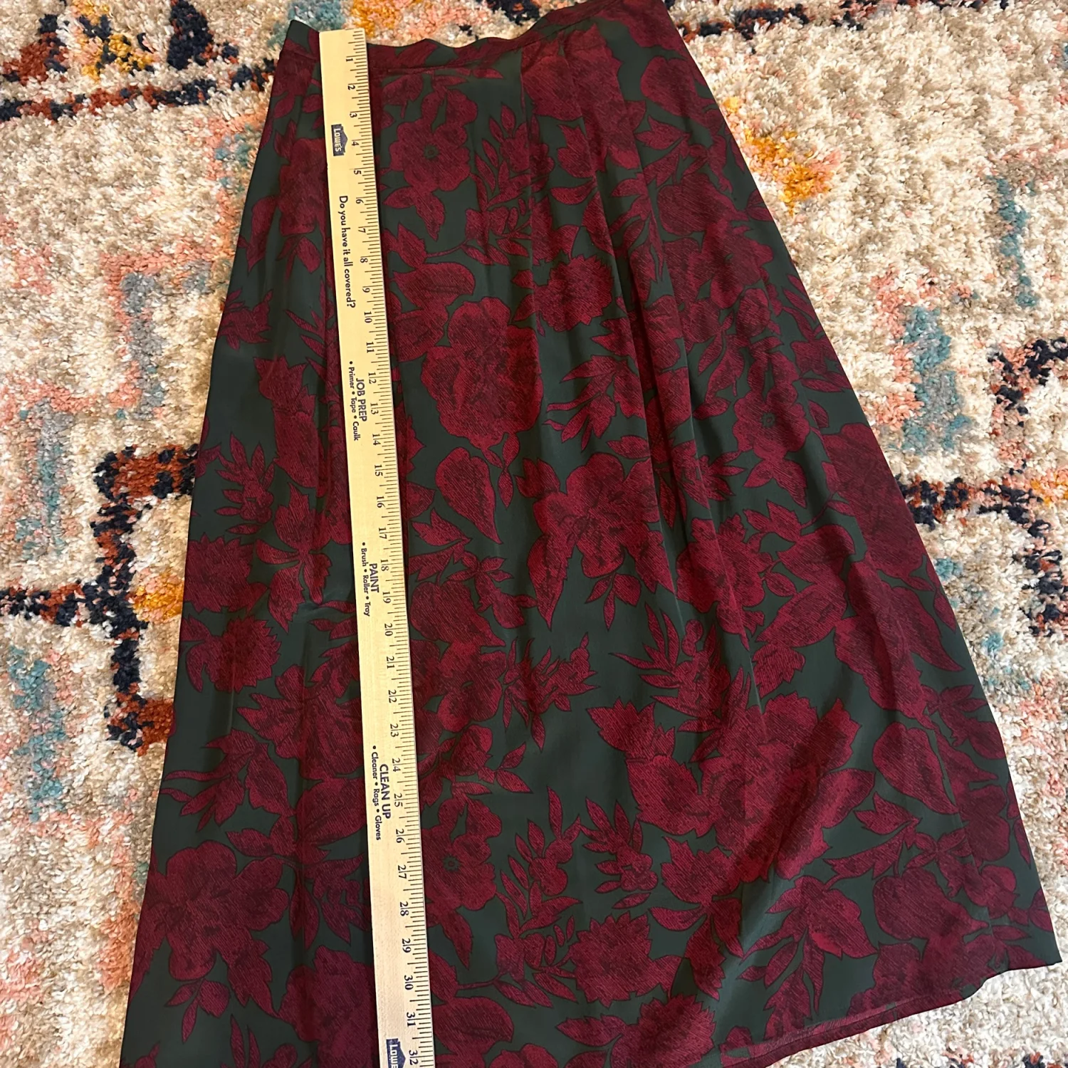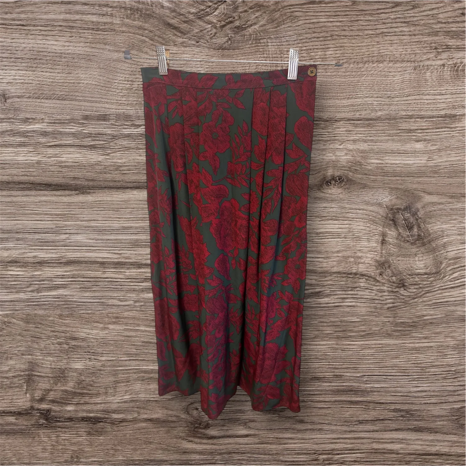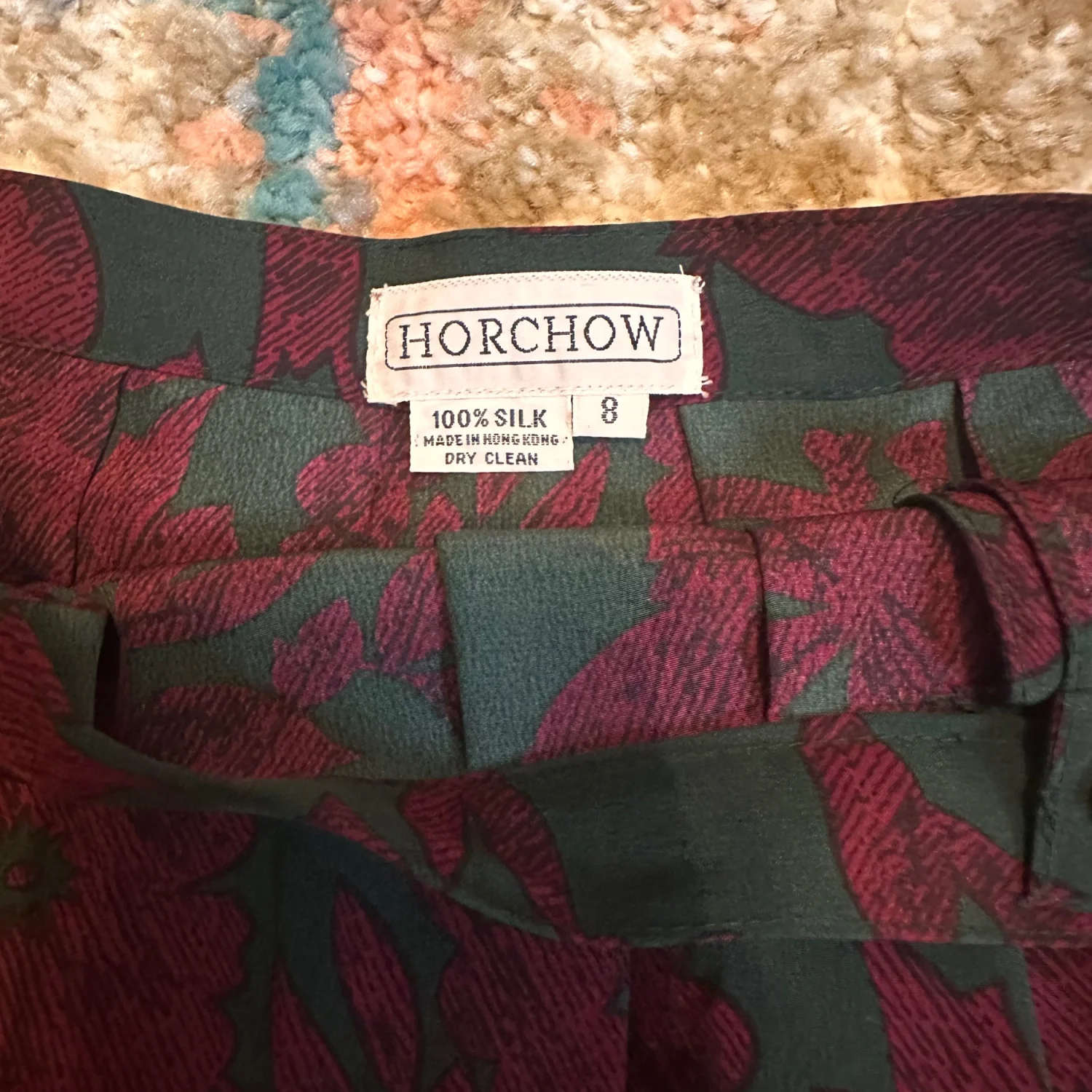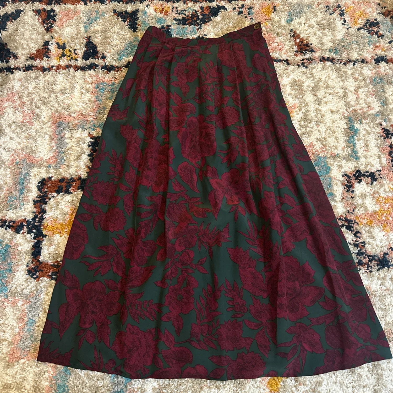 Horchow 100% silk skirt featuring a striking floral pattern in burgundy and deep green. This size 8 skirt offers a luxurious feel and elegant drape, making it perfect for both formal occasions and stylish everyday wear. Care instructions recommend dry cleaning. #Floral #Silk #Horchow #Vintage