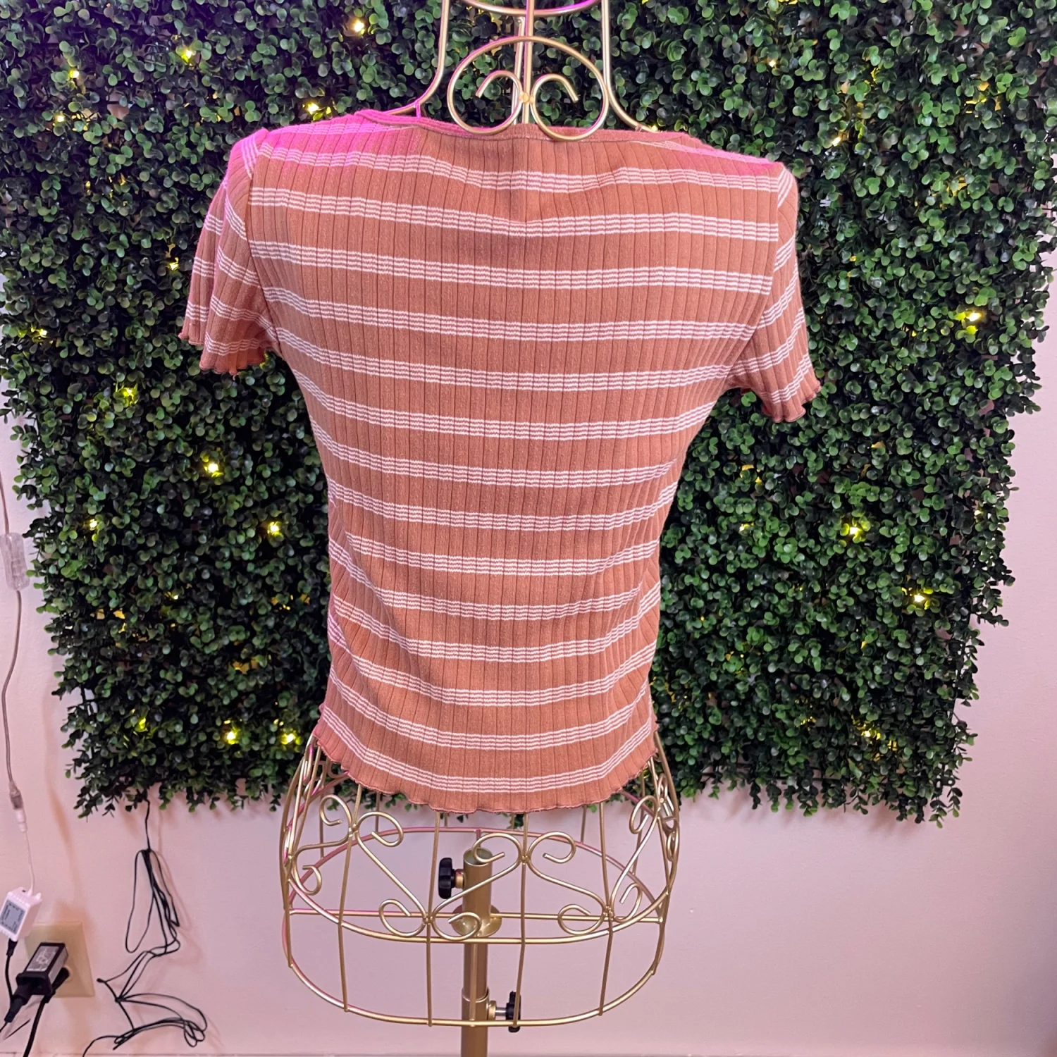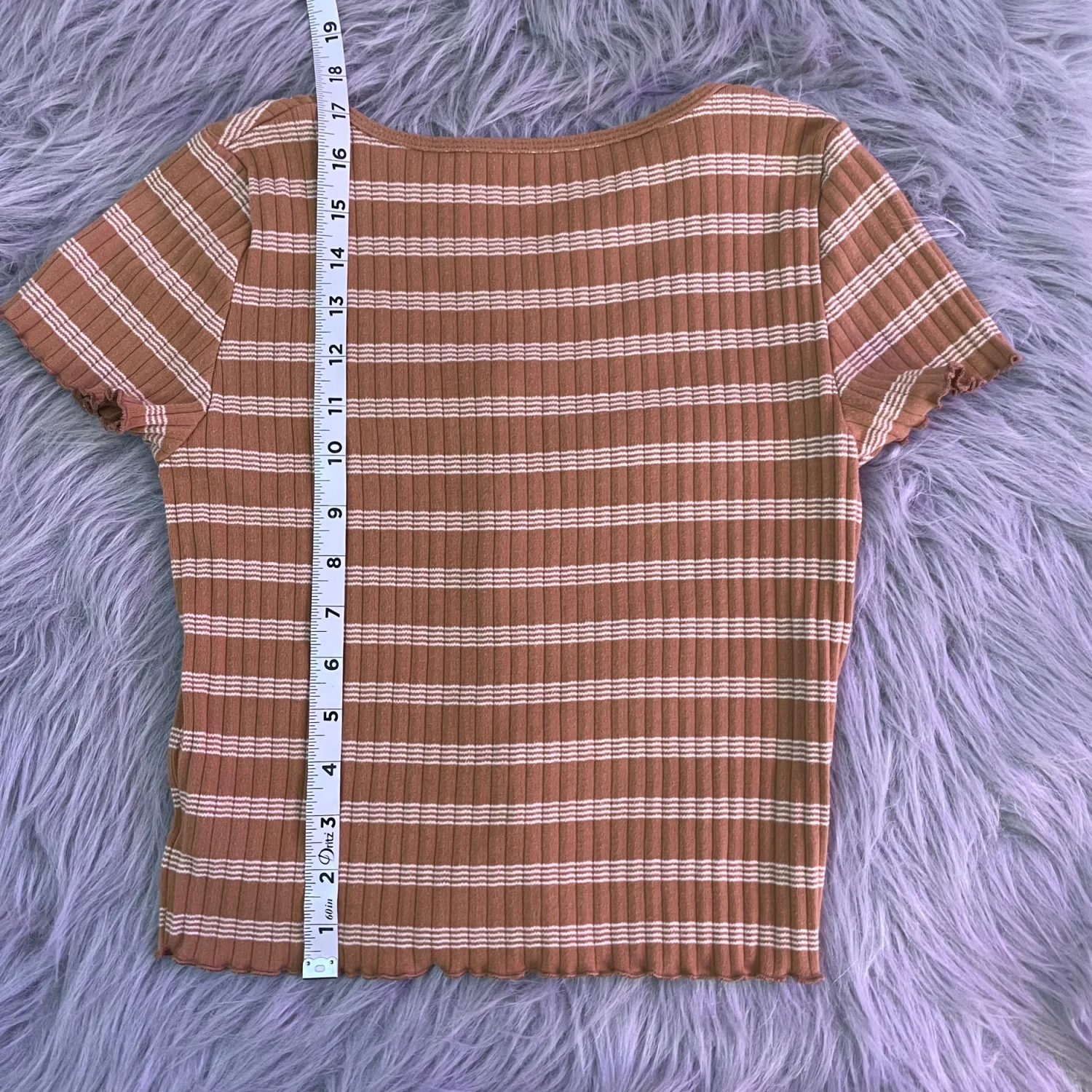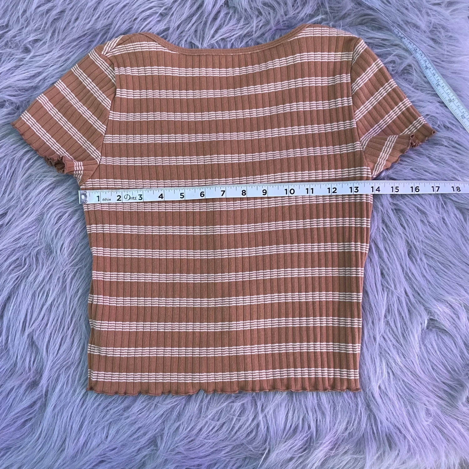 Short-sleeve ribbed crop top with horizontal stripes. Scoop neckline and functional front buttons. Fitted silhouette for casual wear or layering.