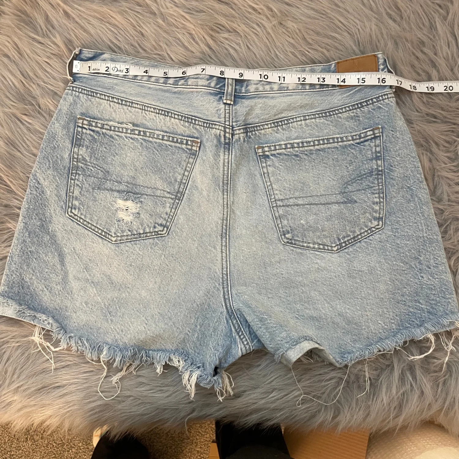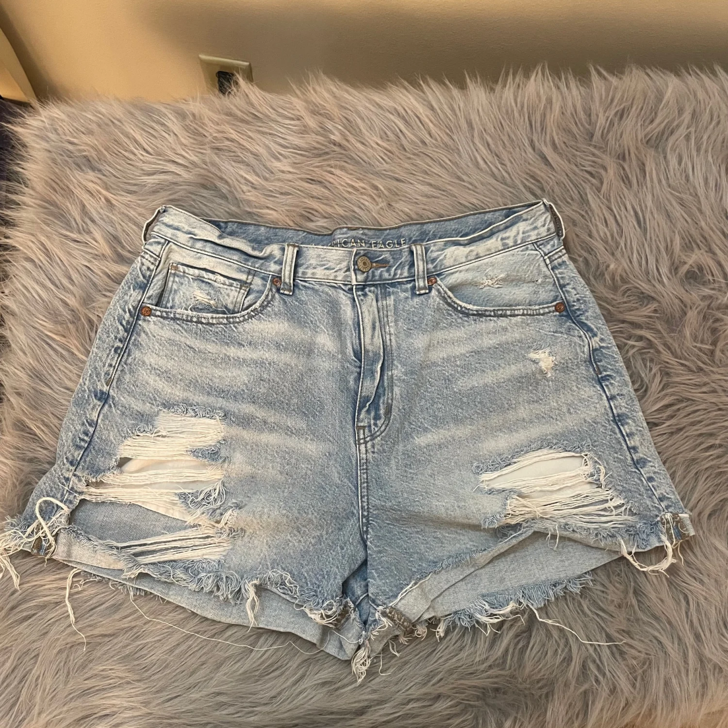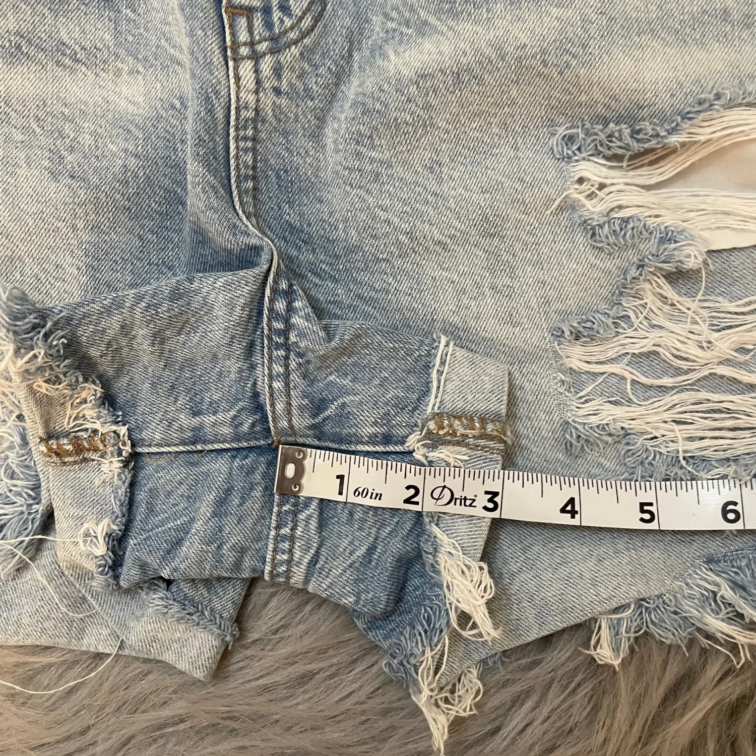 High-rise women's denim shorts in a light blue wash. Distressed details with frayed hem. Classic five-pocket styling and button fly. Casual, easy-to-wear summer staple. Minor wear at waist
