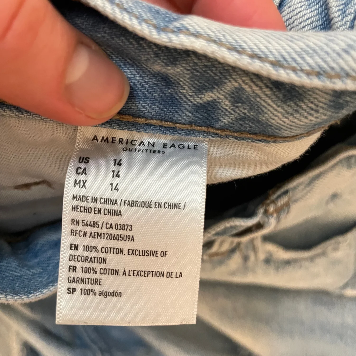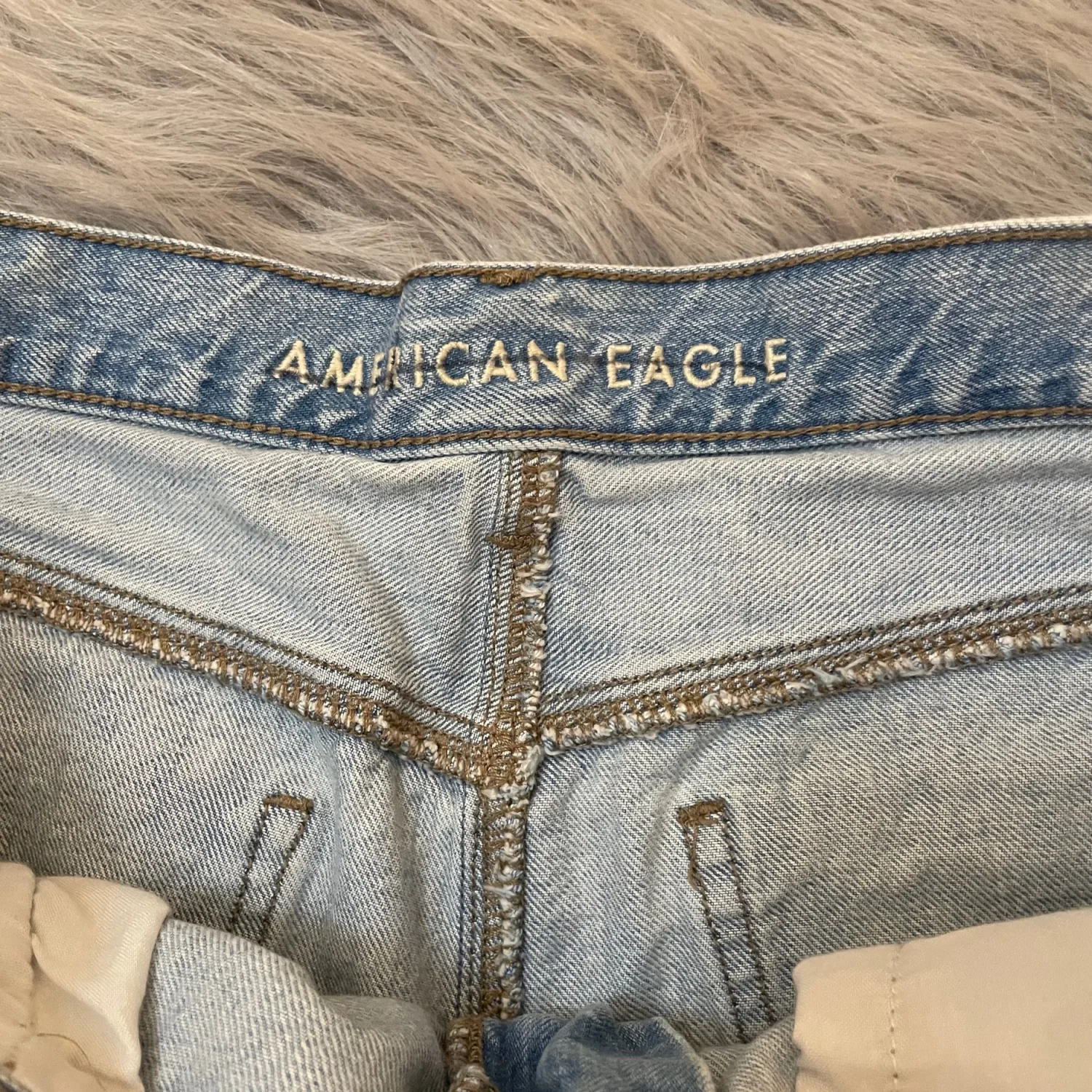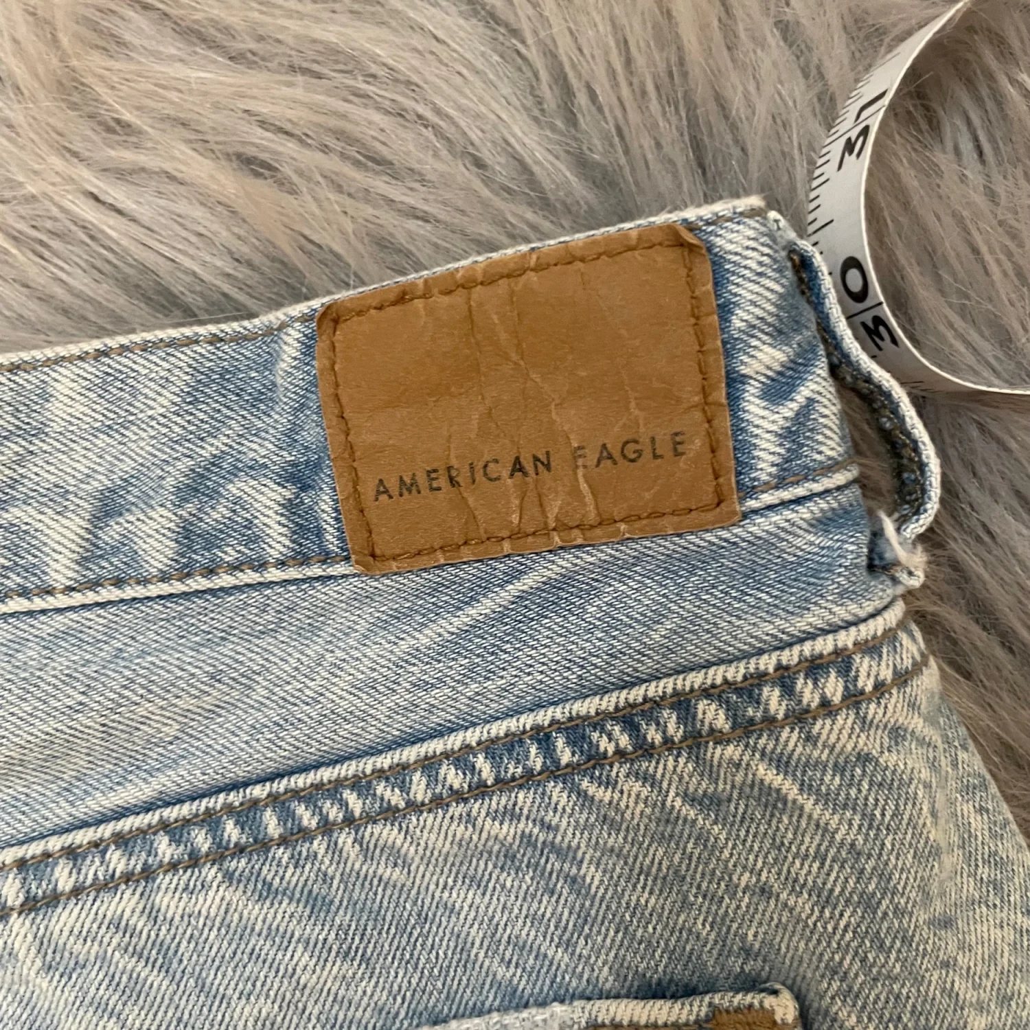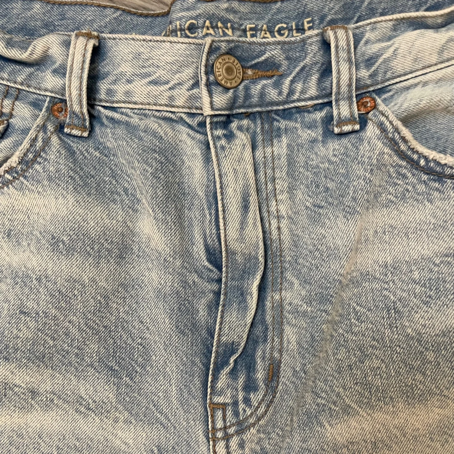 High-rise women's denim shorts in a light blue wash. Distressed details with frayed hem. Classic five-pocket styling and button fly. Casual, easy-to-wear summer staple. Minor wear at waist