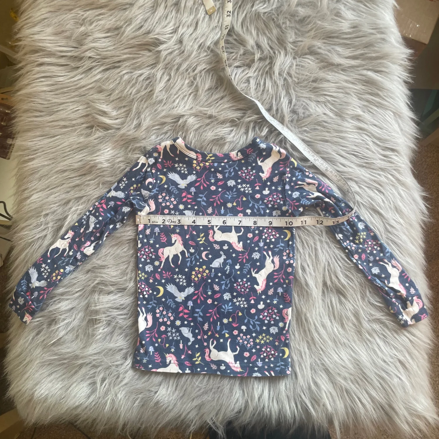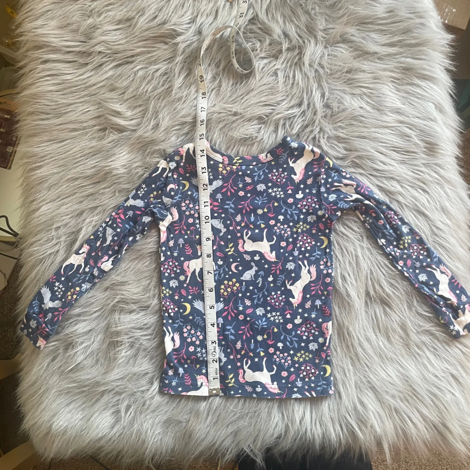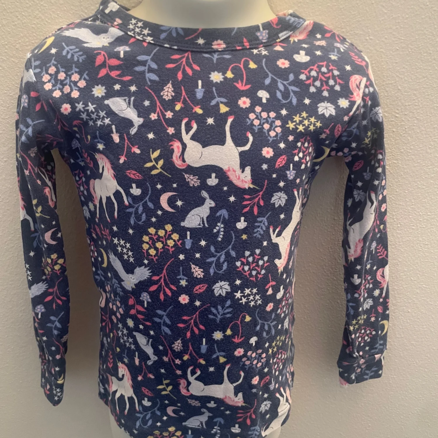 Cute long sleeve top with unicorn and floral print. Navy base with colorful accents. Cozy, soft cotton feel. Easy everyday style. Long pants. Pilling throughout
