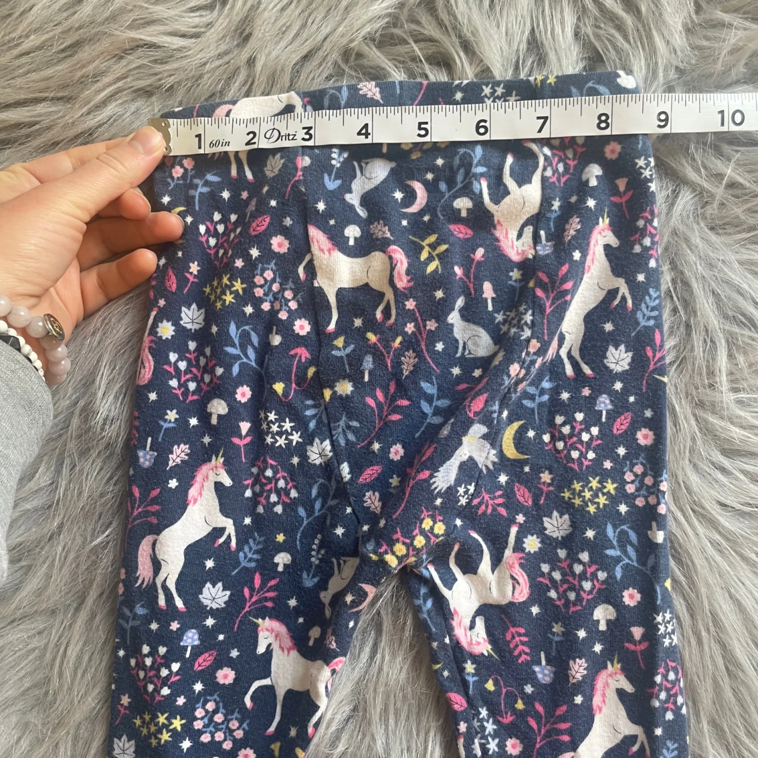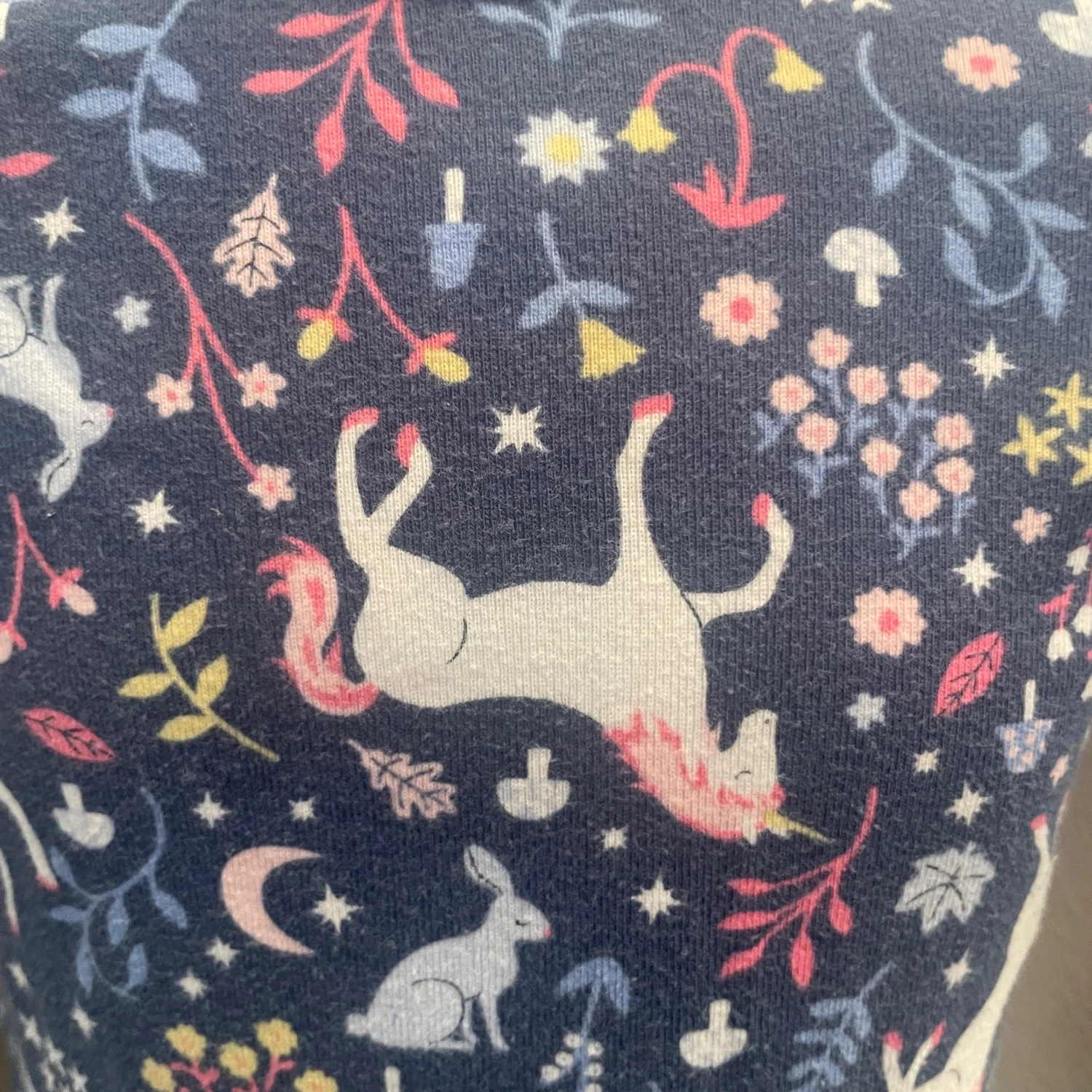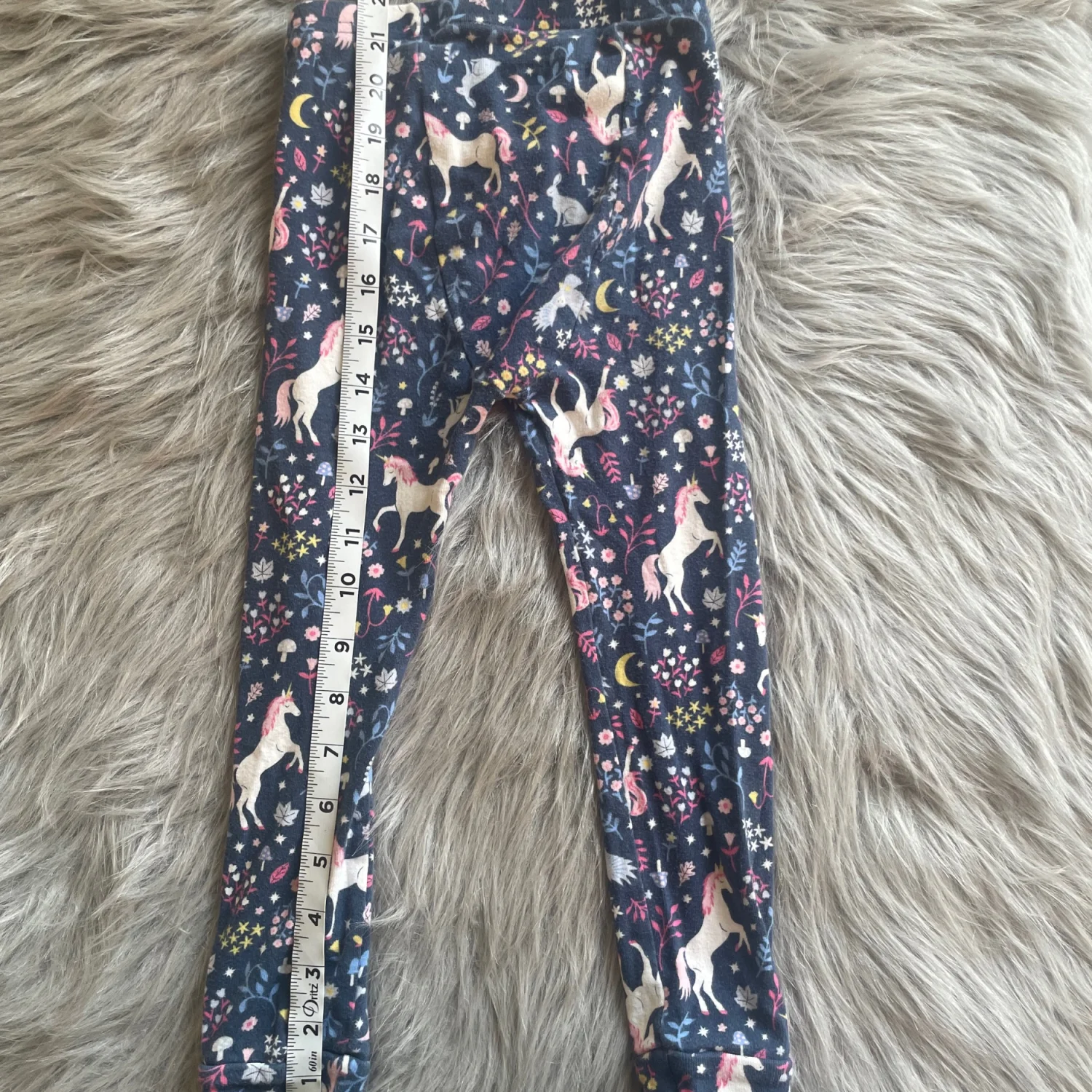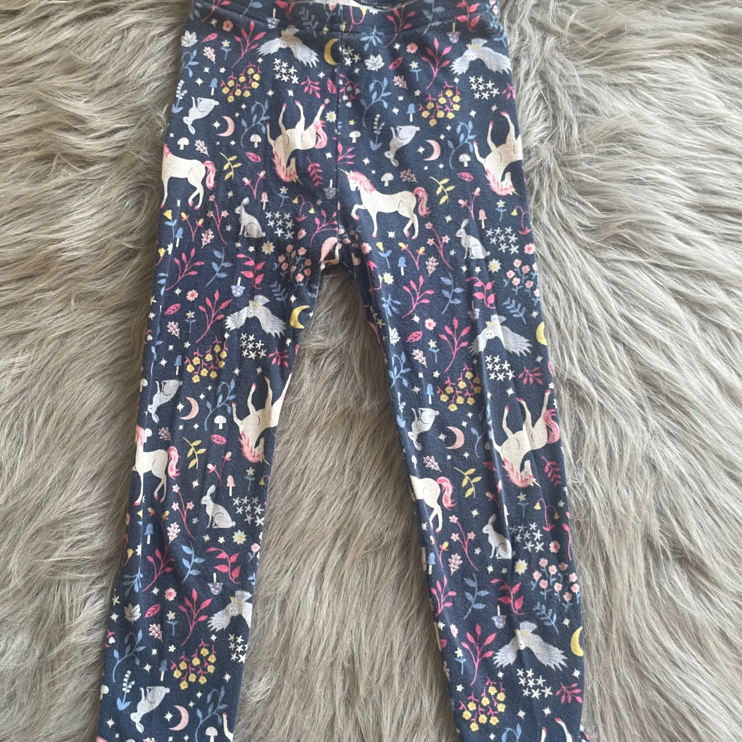 Cute long sleeve top with unicorn and floral print. Navy base with colorful accents. Cozy, soft cotton feel. Easy everyday style. Long pants. Pilling throughout