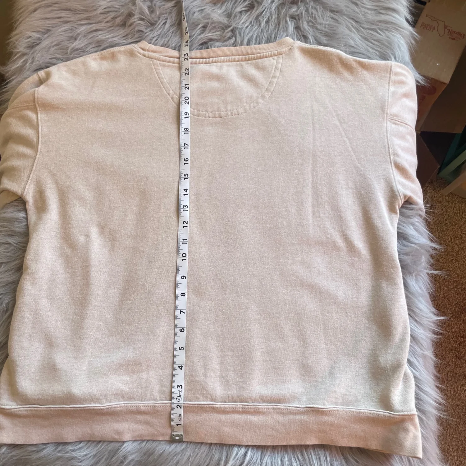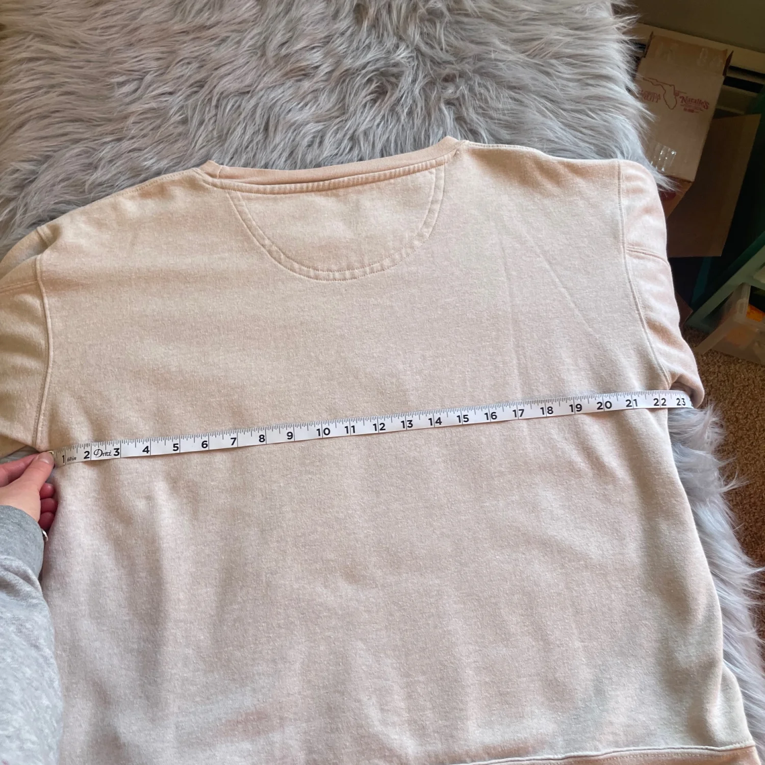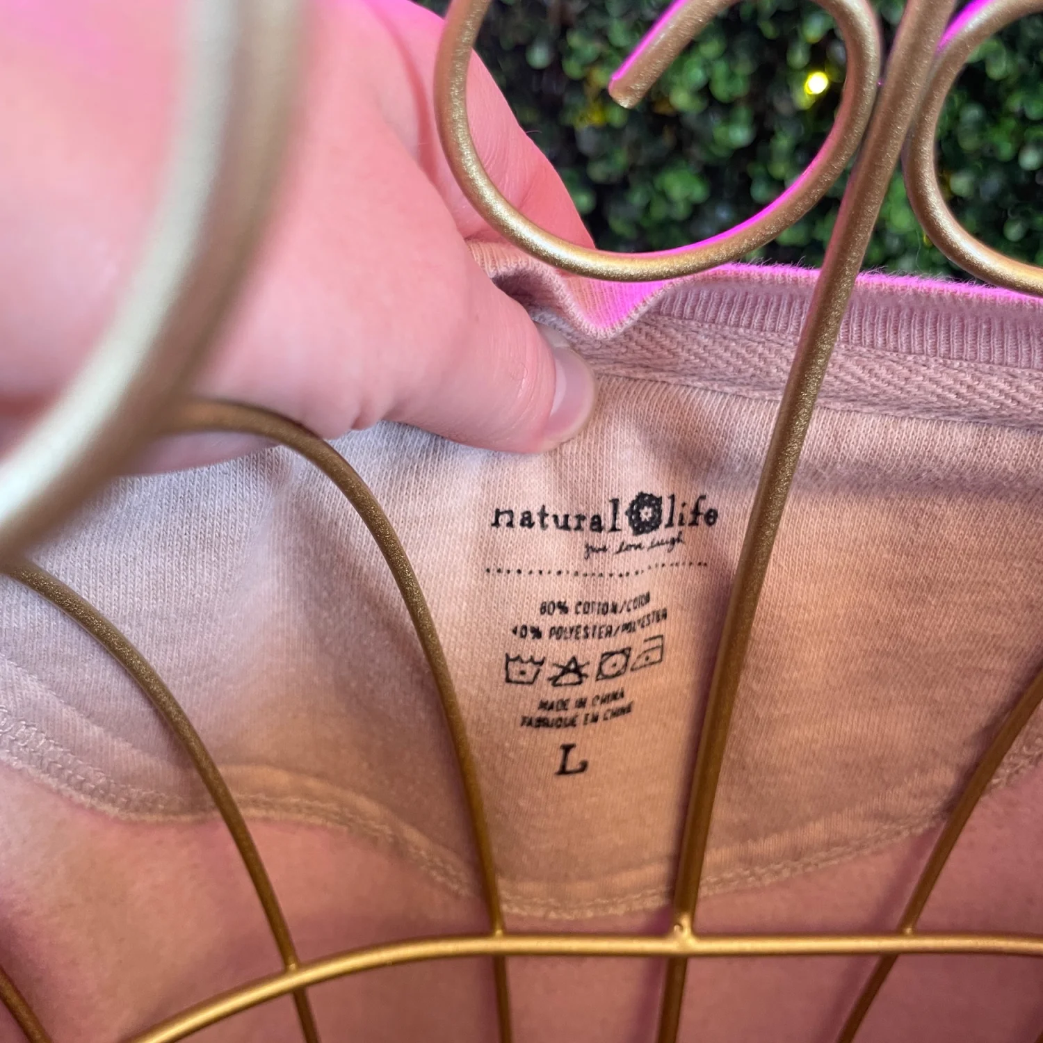 Beige NATURAL LIFE crewneck. Lightweight knit with printed care label. Simple, casual style.