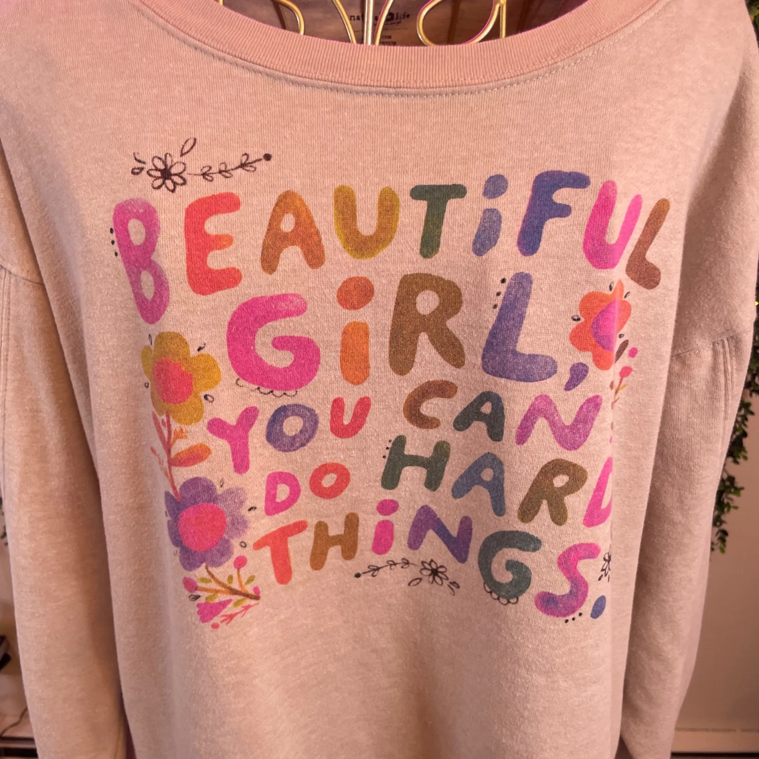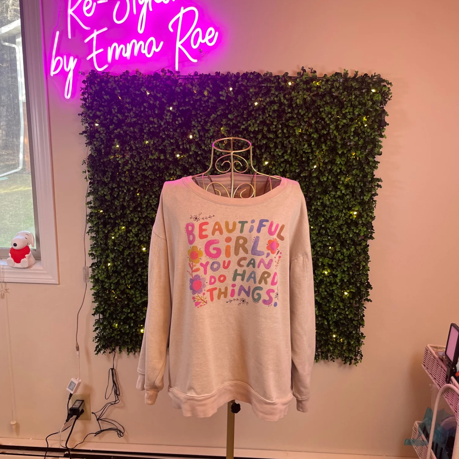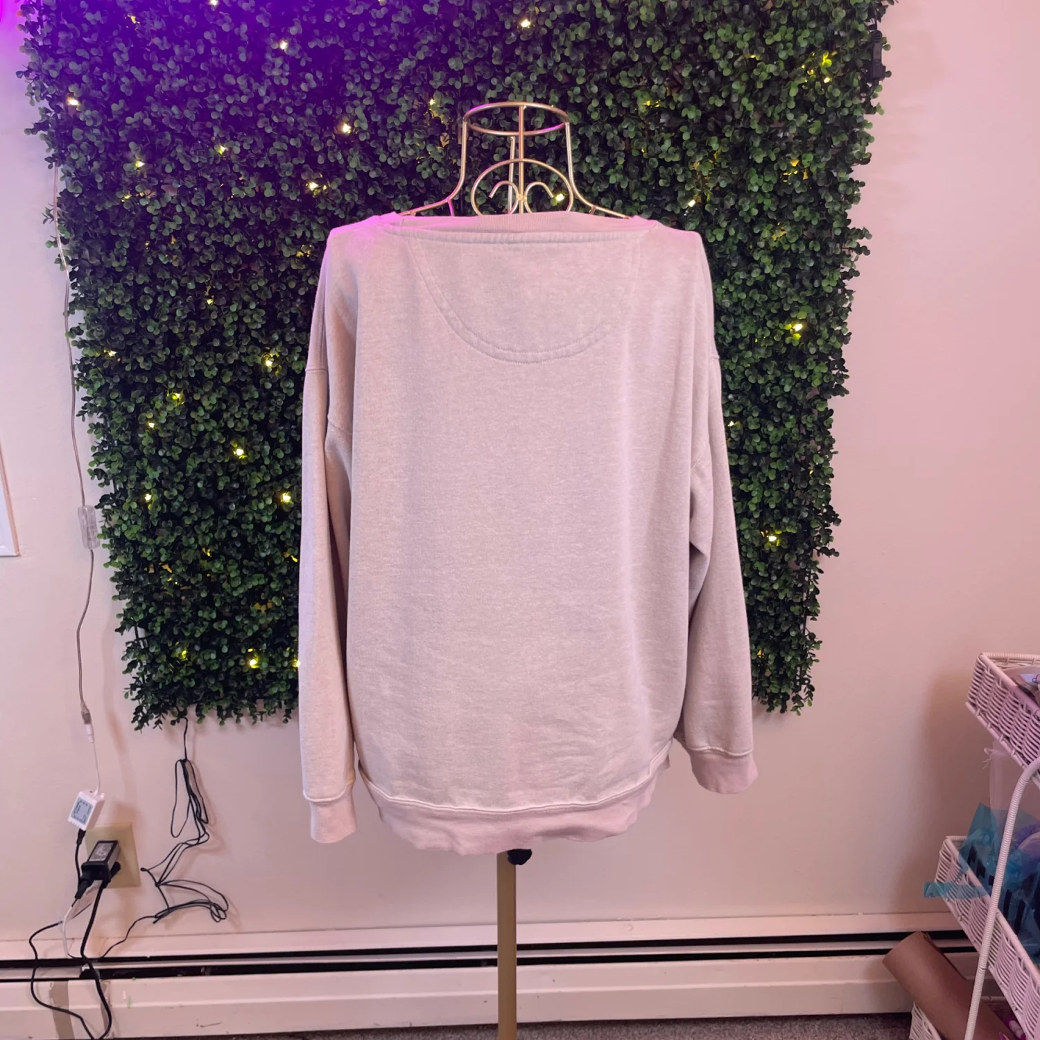 Beige NATURAL LIFE crewneck. Lightweight knit with printed care label. Simple, casual style.