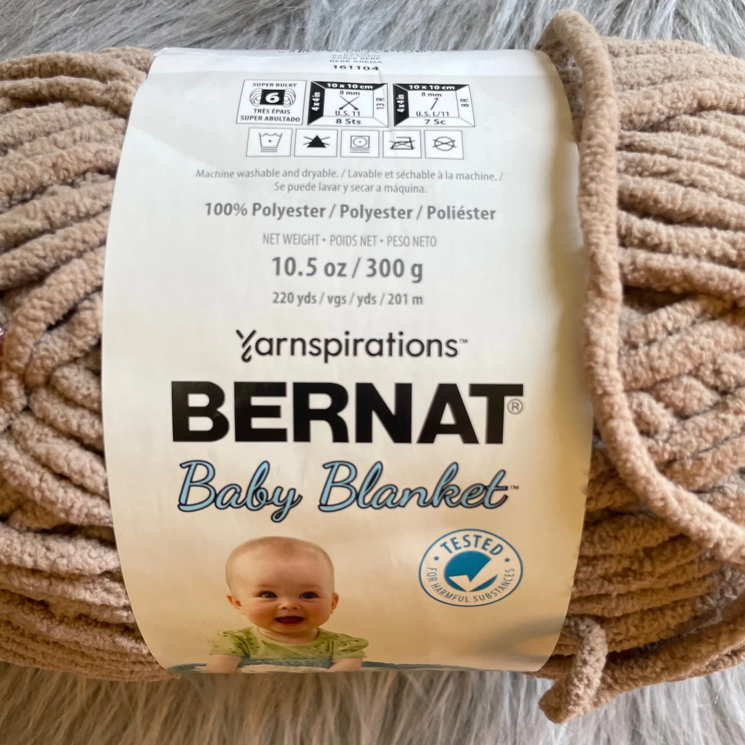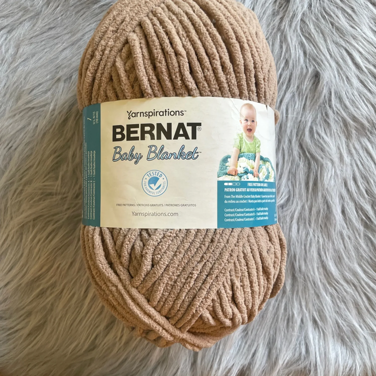 Bernat Baby Blanket chenille yarn in a soft camel/tan color. Plush, velvety texture perfect for baby blankets and cozy projects. Smooth bulky weight for quick, comfy makes.