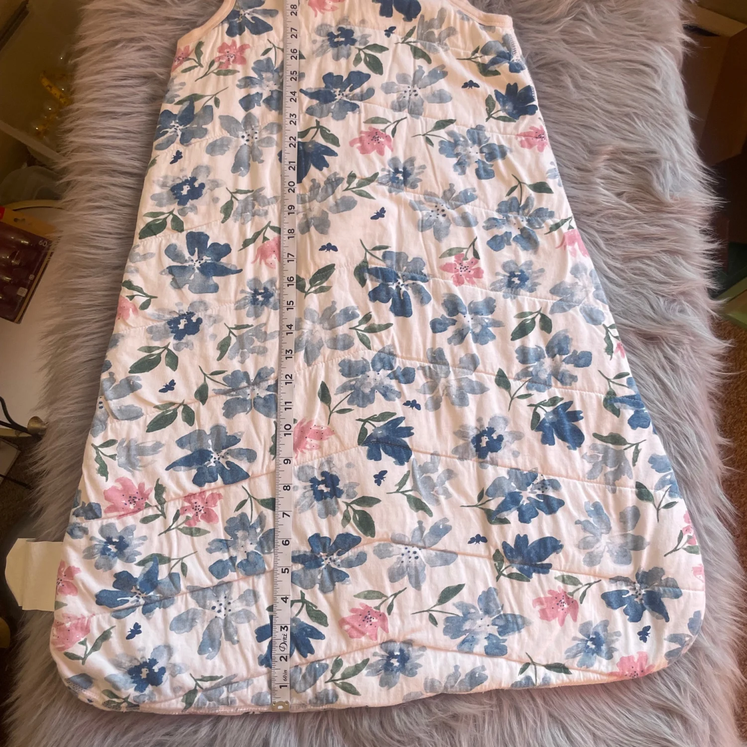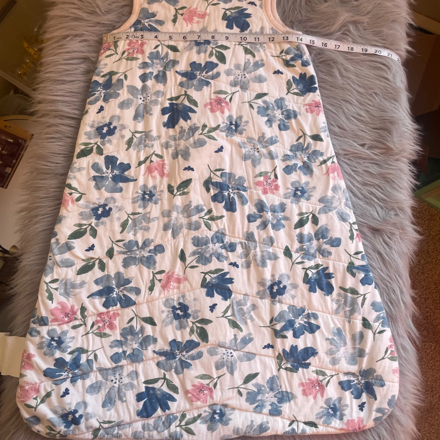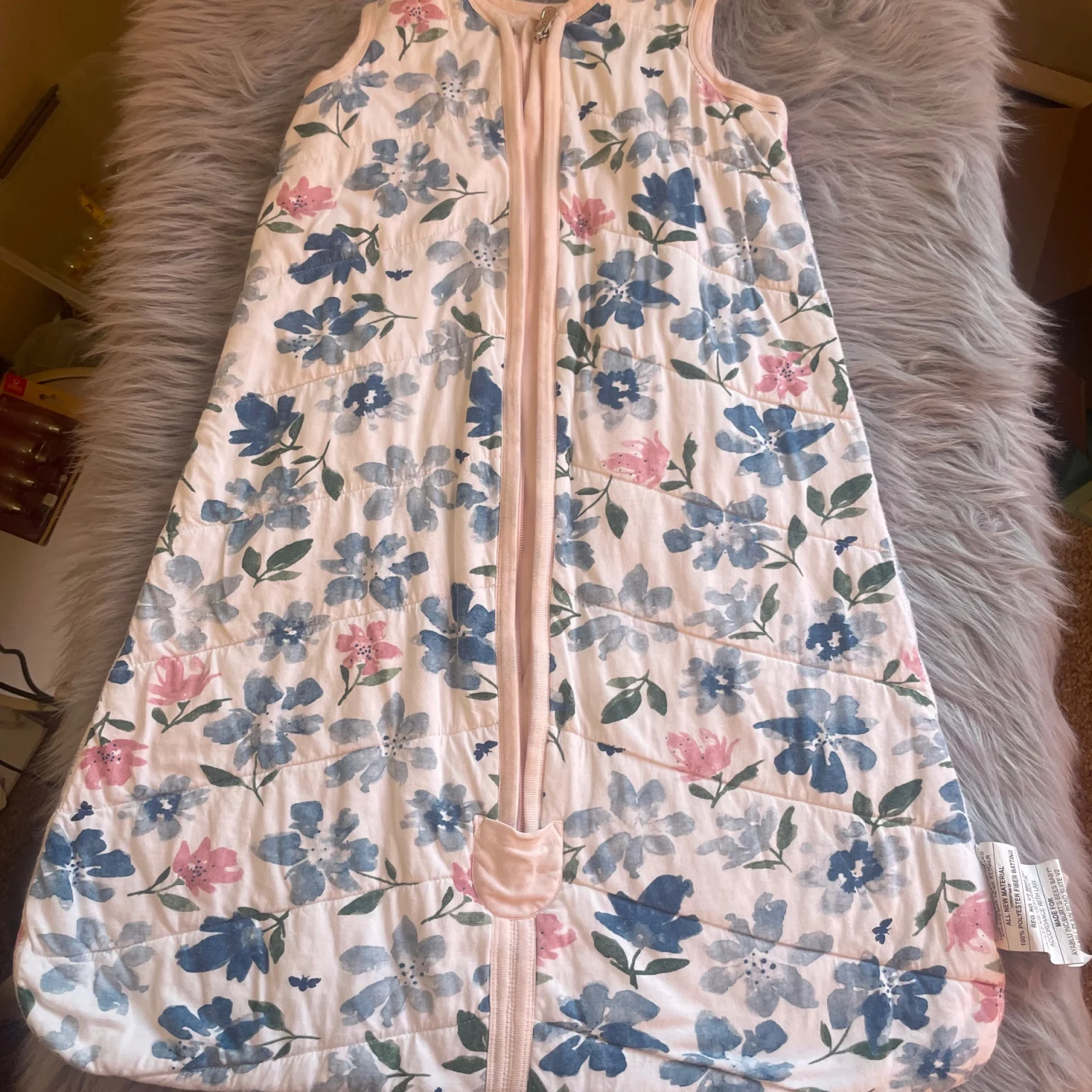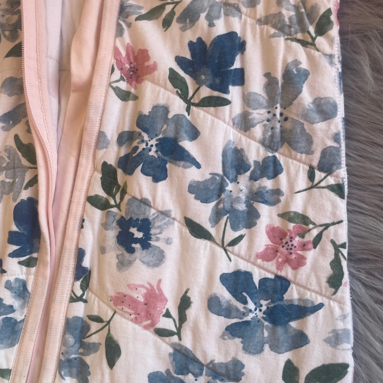Quilted sleep sack with all-over floral print. Soft trim and easy front zipper closure. Breathable fabric for cozy sleep. Gentle floral pattern in blue and pink tones. Minor pilling