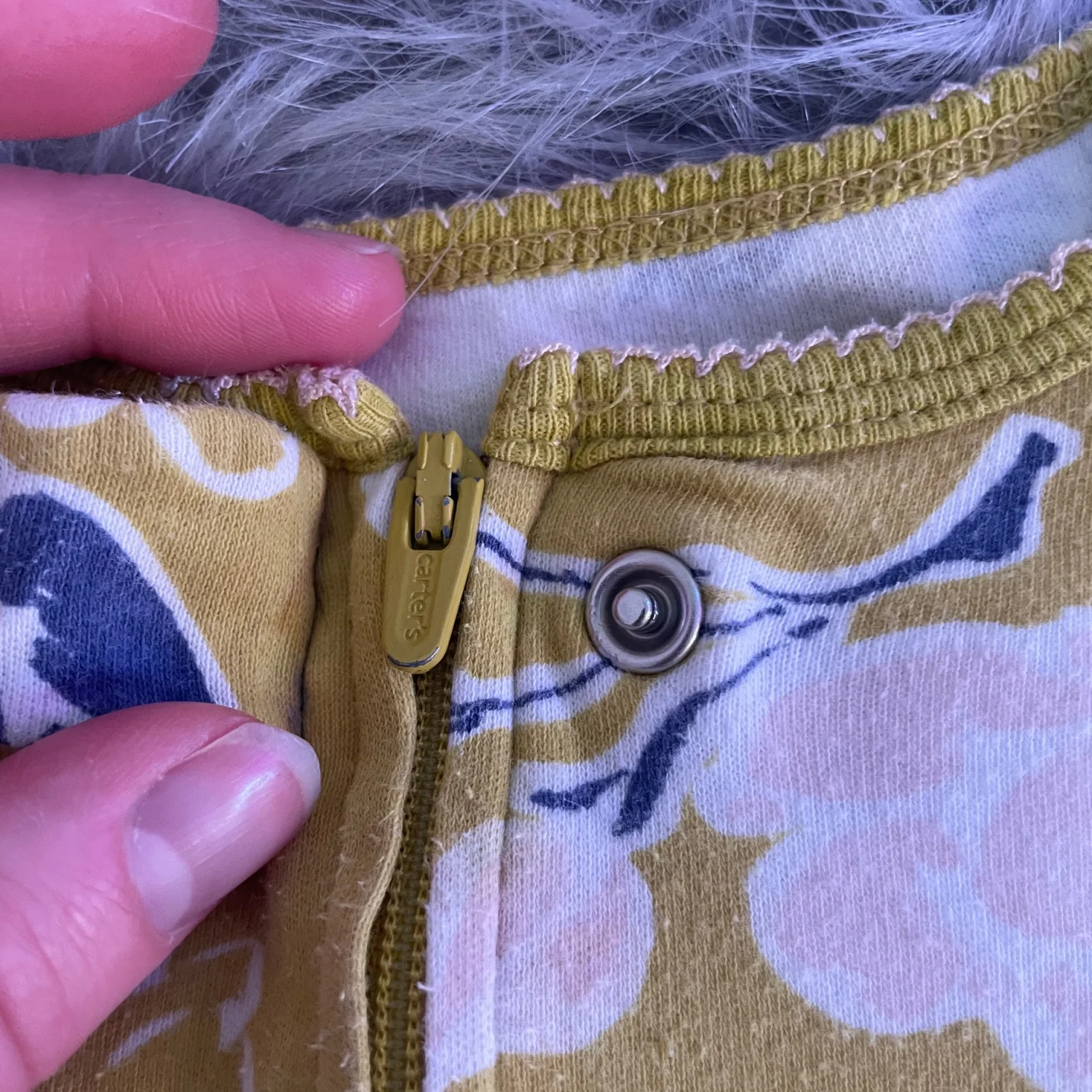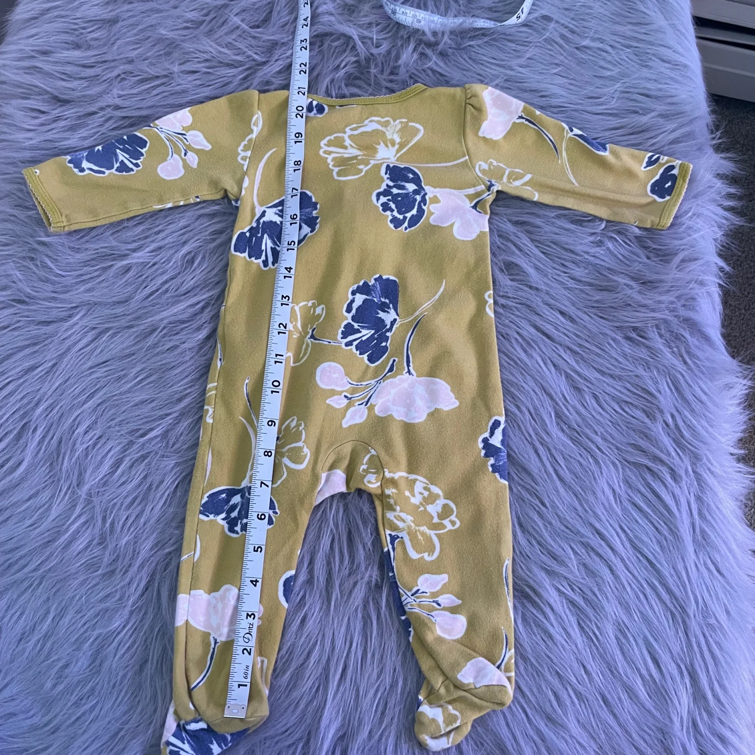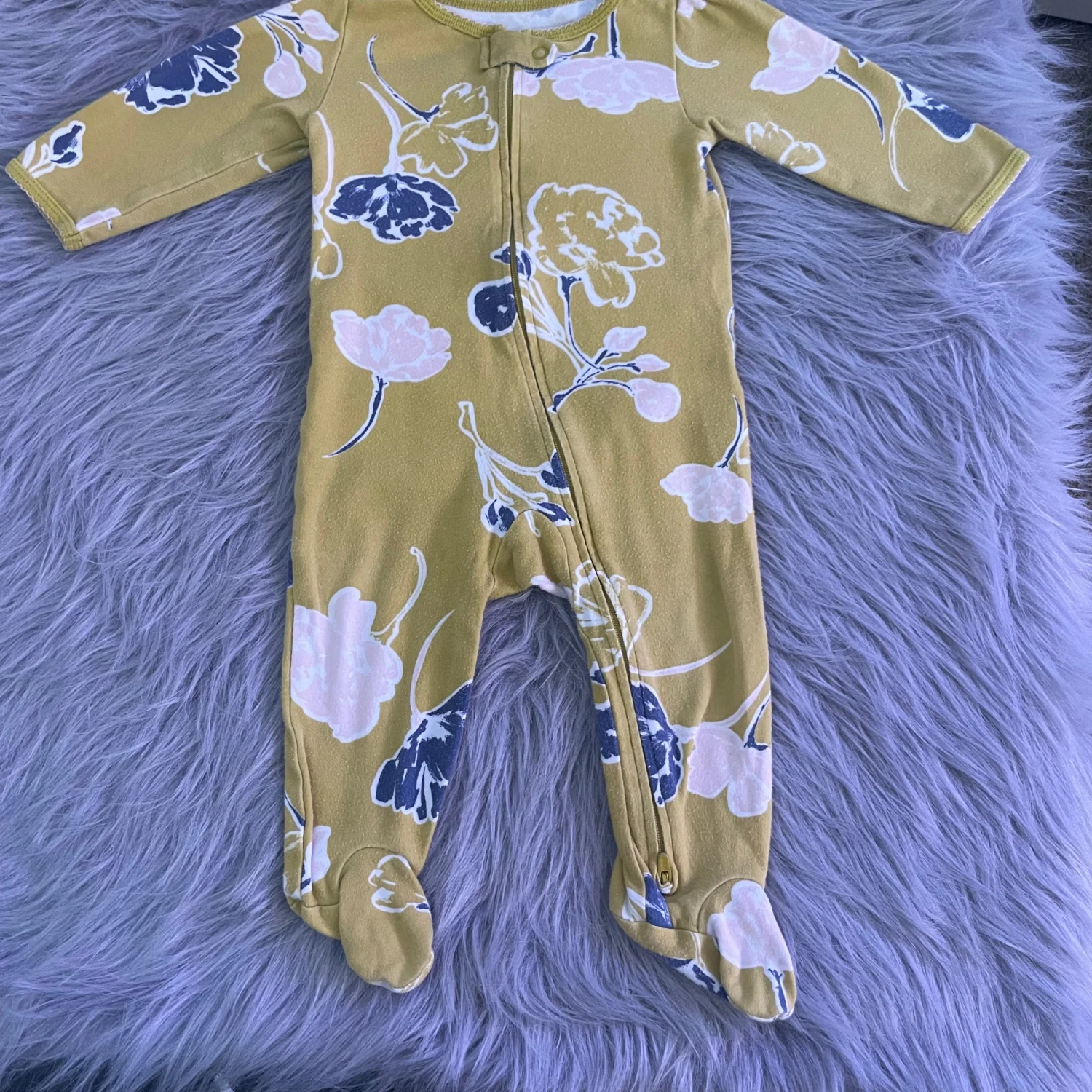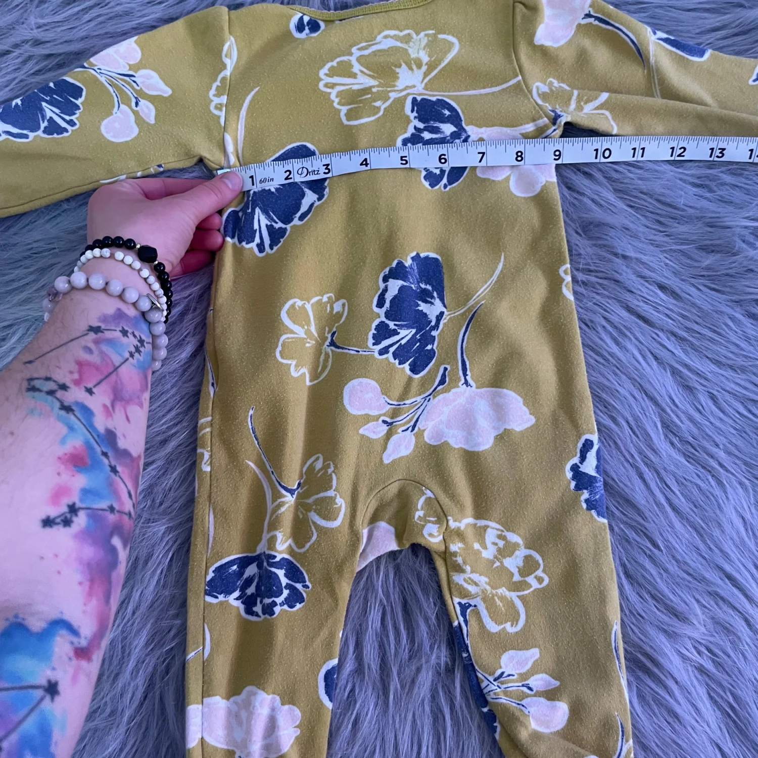 Soft mustard floral footed one-piece with navy and cream flower prints. Gentle zipper (2 zippers) closure for easy changes. Comfortable long sleeves and enclosed feet for full coverage. Machine washable fabric for simple care. Pilling throughout