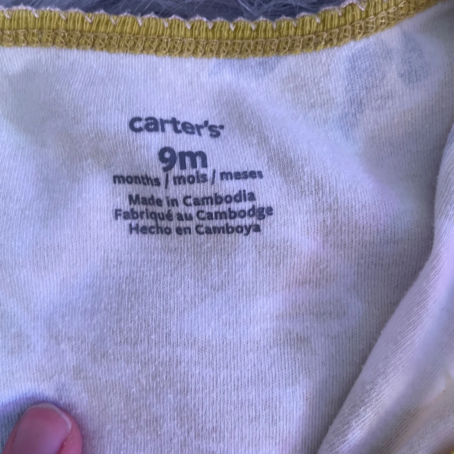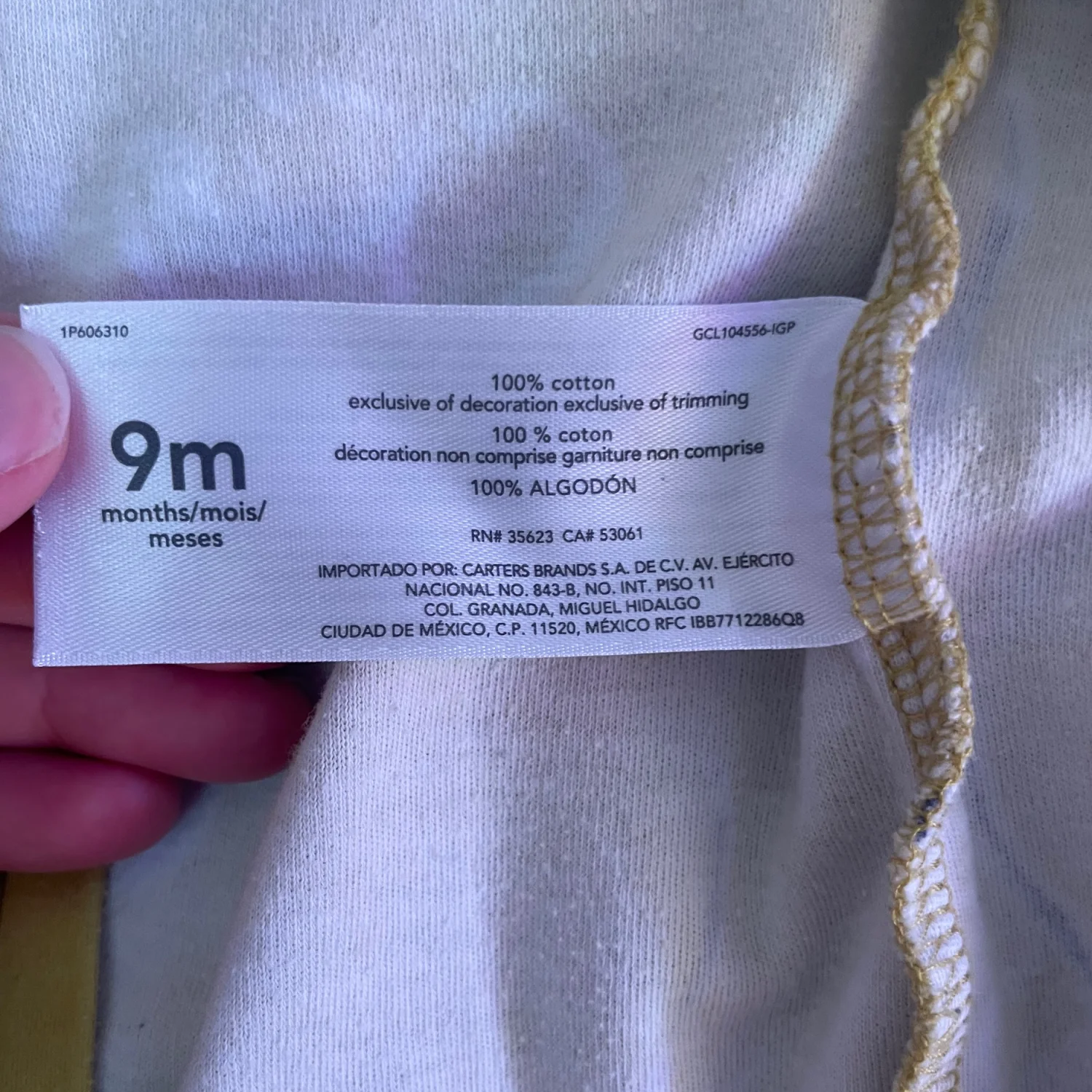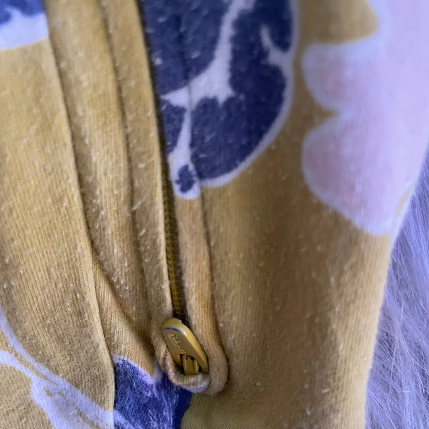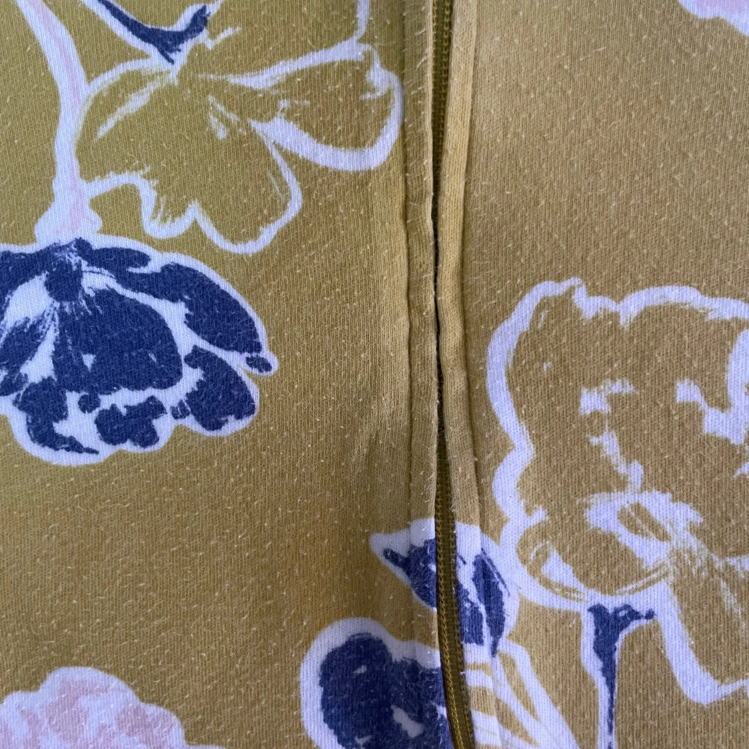 Soft mustard floral footed one-piece with navy and cream flower prints. Gentle zipper (2 zippers) closure for easy changes. Comfortable long sleeves and enclosed feet for full coverage. Machine washable fabric for simple care. Pilling throughout