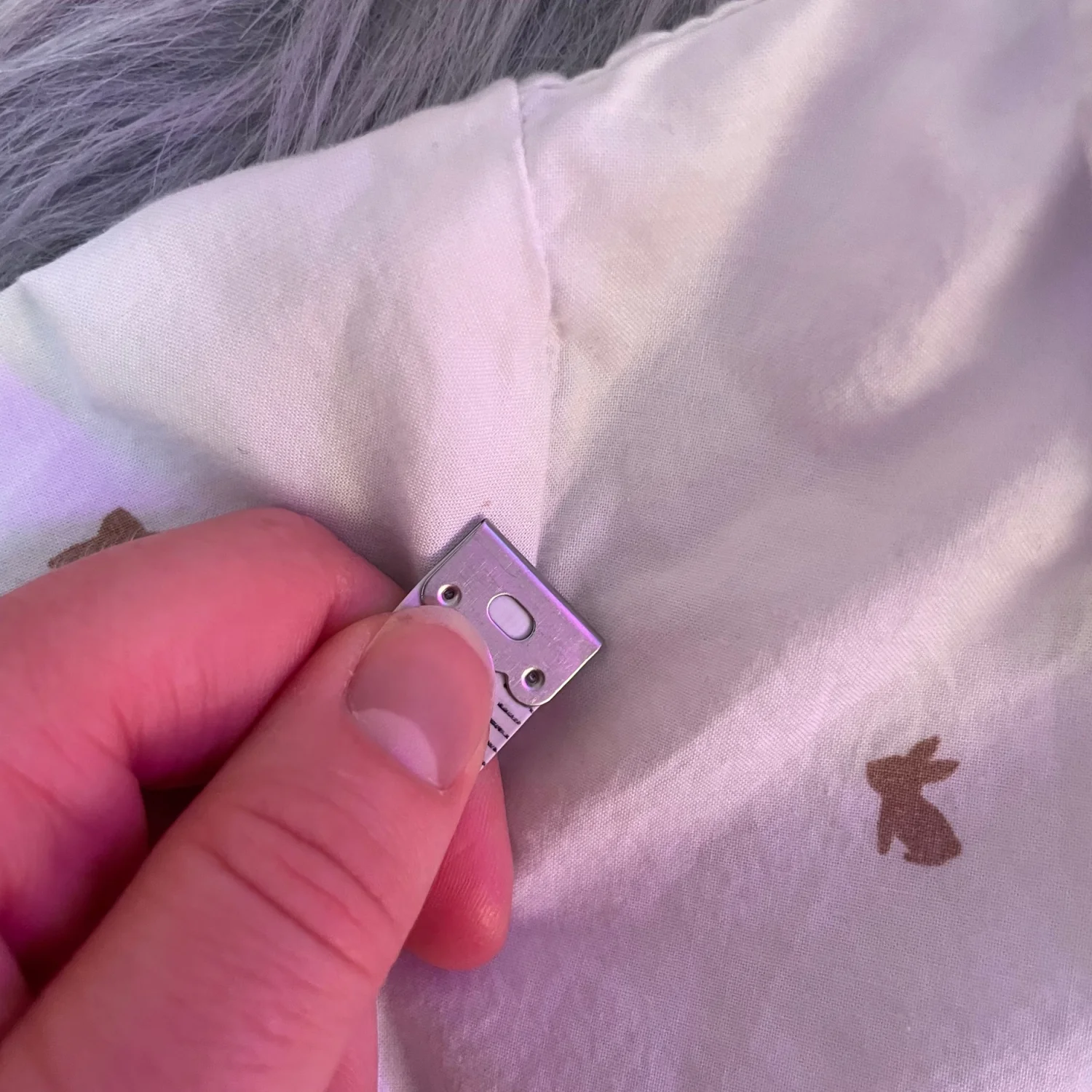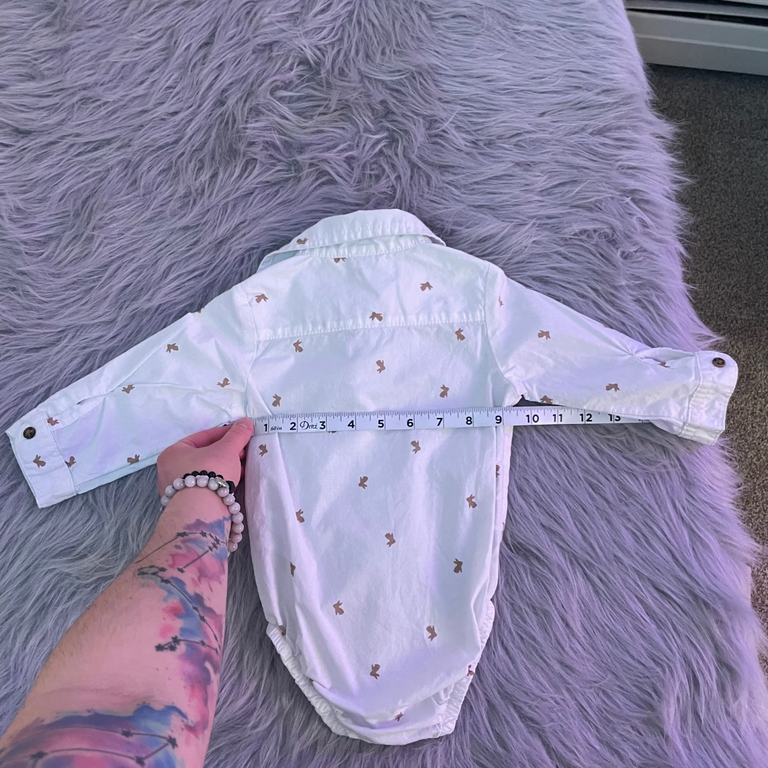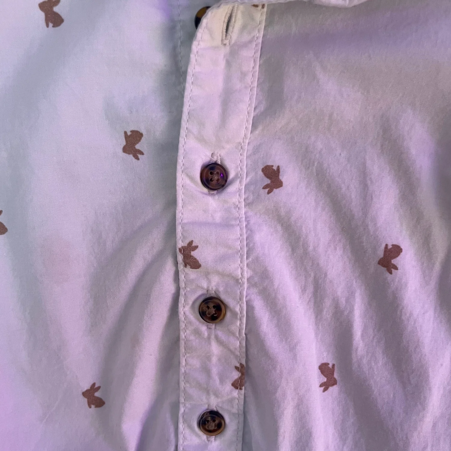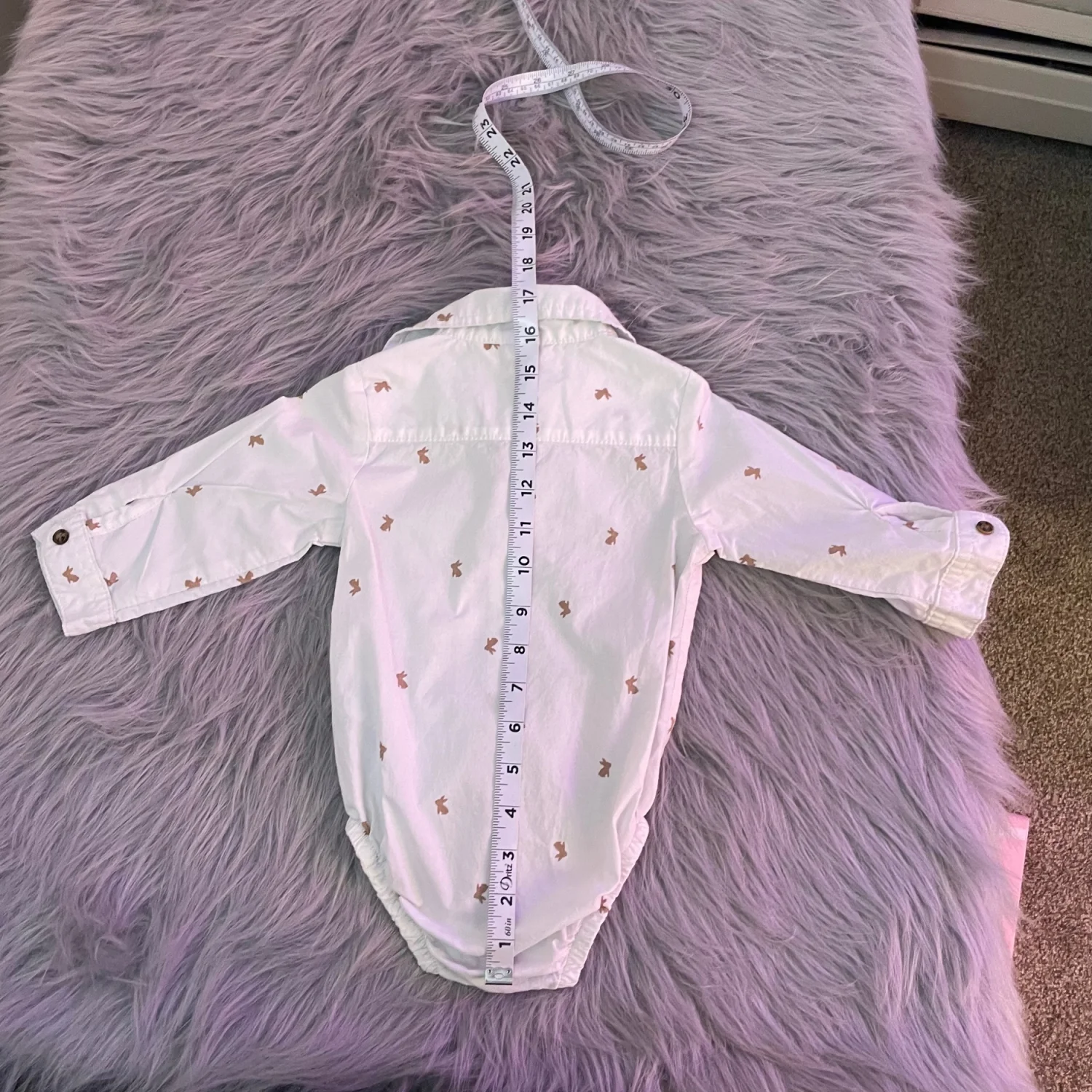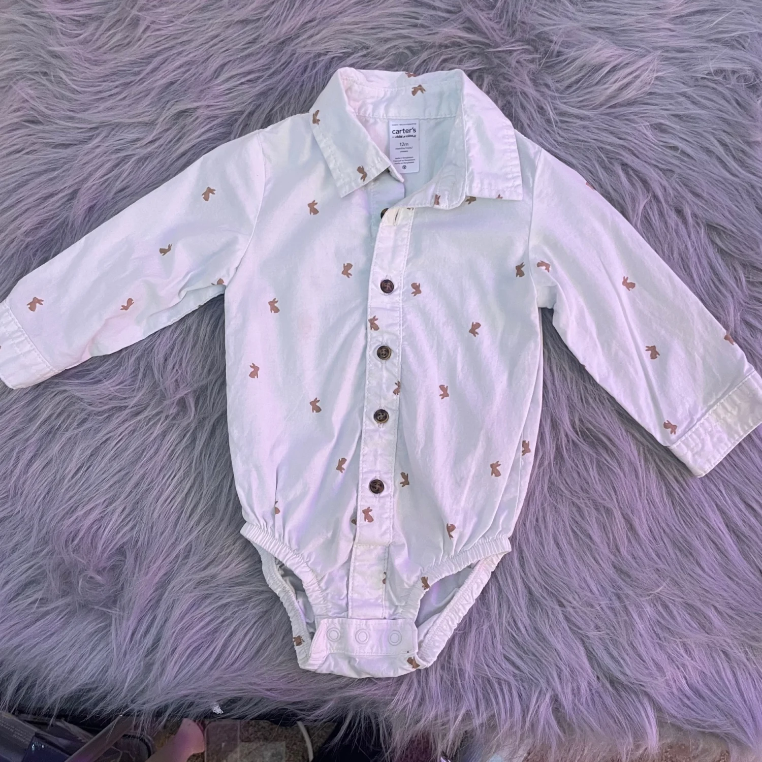 Carter's long-sleeve one-piece with button-front closure. White fabric with small brown bunny prints. Snaps at the bottom for quick changes. Soft, comfortable cotton construction. Very tiny brown spot on front