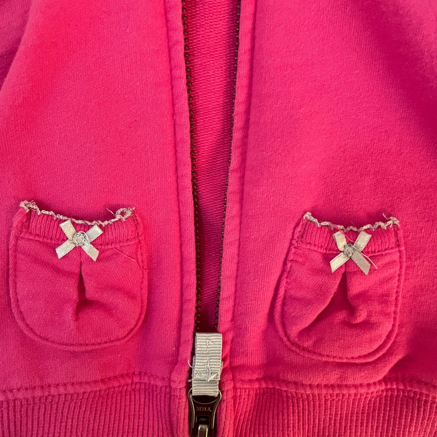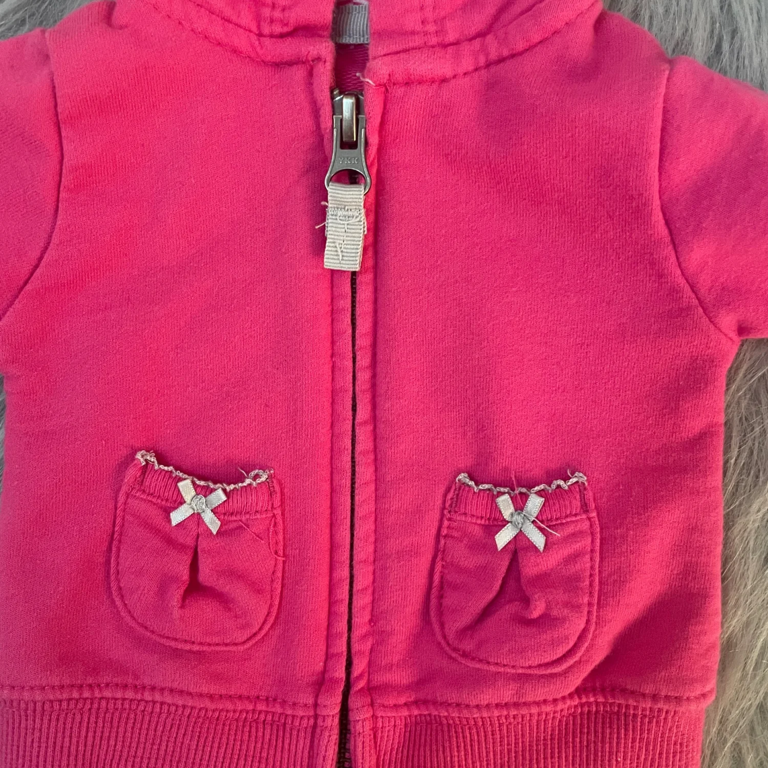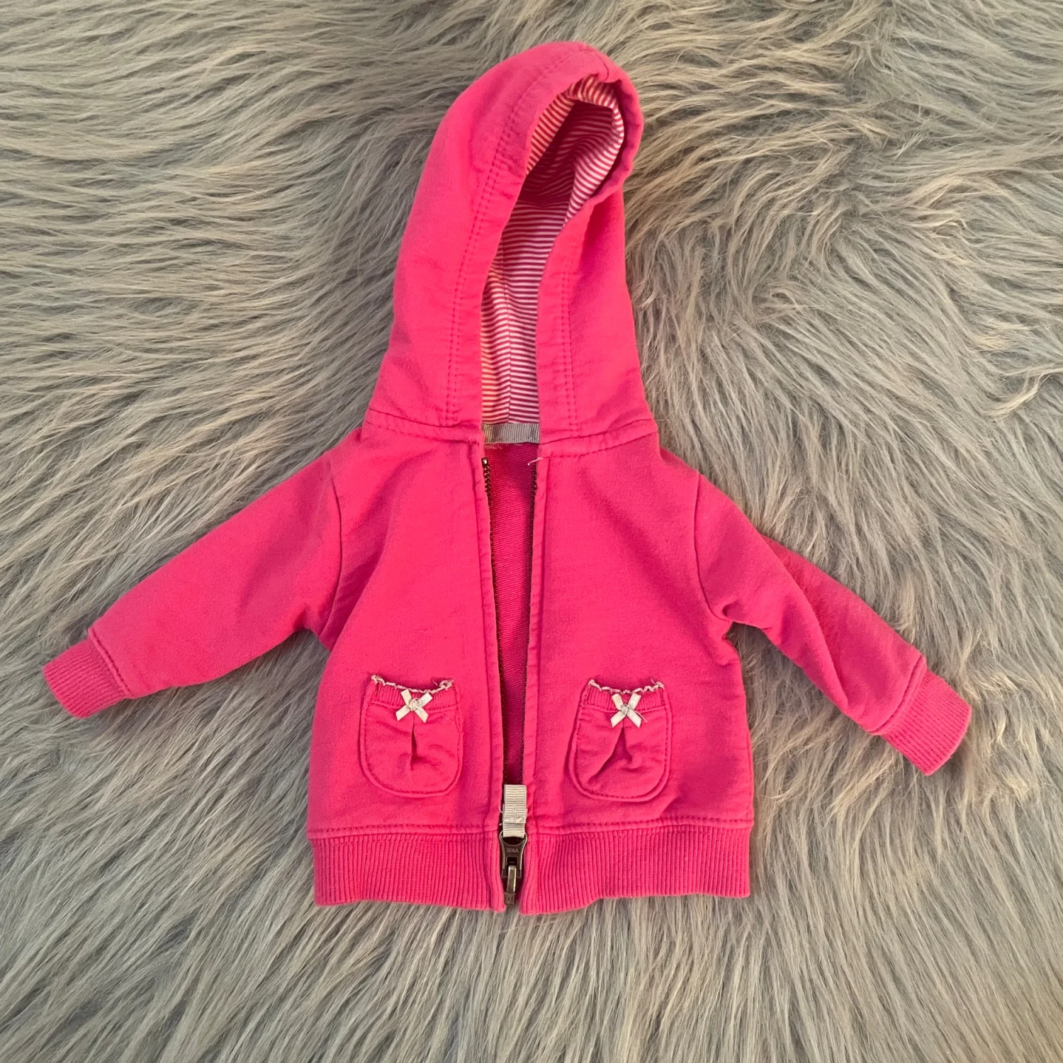 Soft pink zip-up hoodie for baby. Hooded with striped inner lining. Two front pockets with bow accents. Comfortable ribbed cuffs and hem.