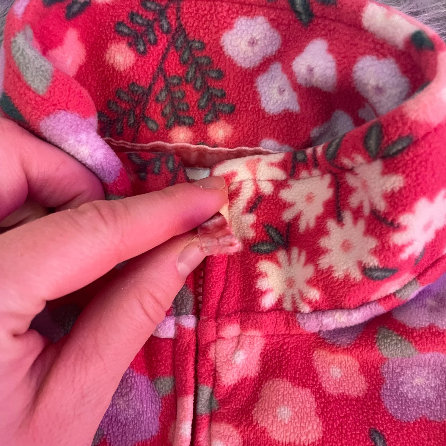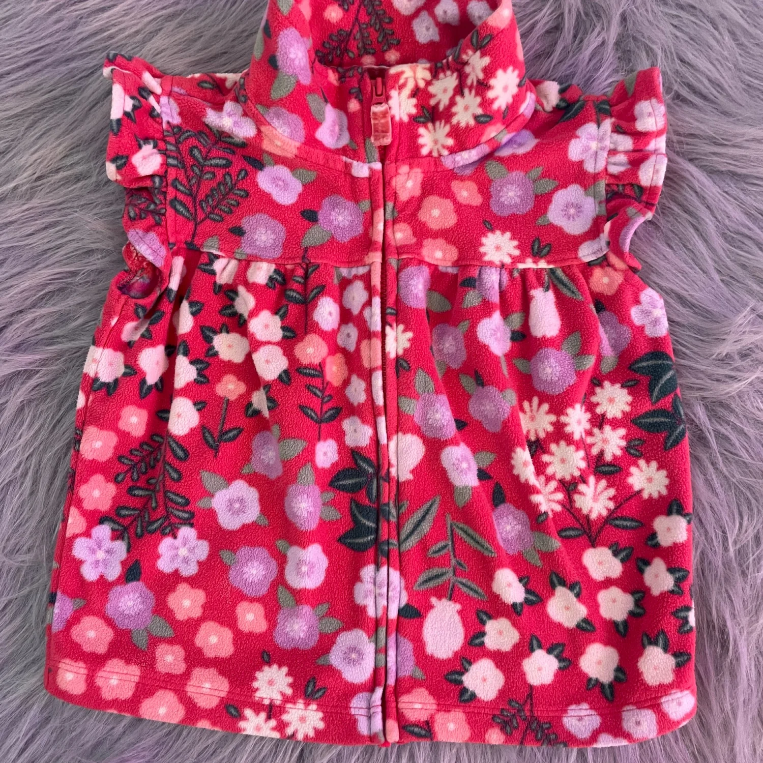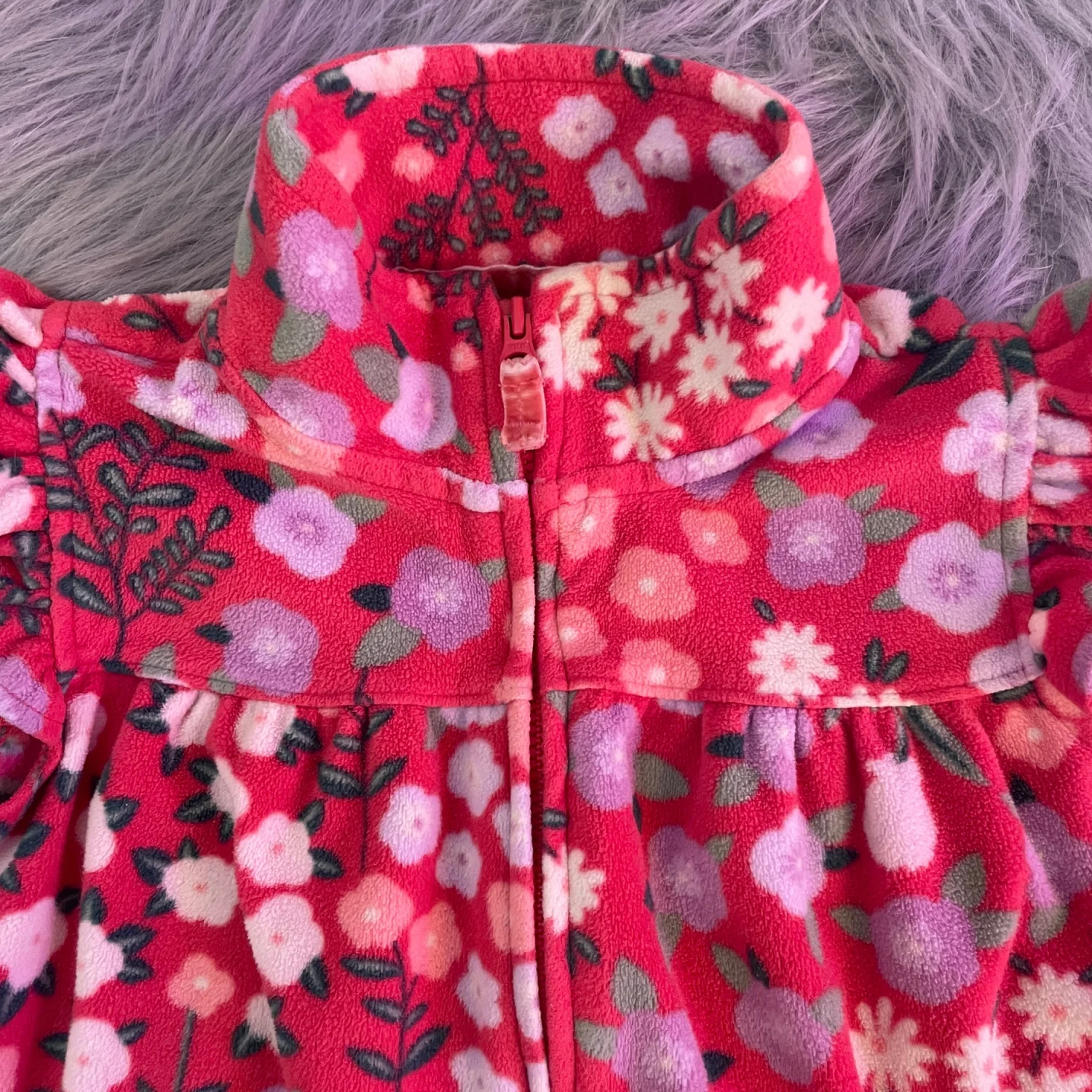 Cozy fleece jacket with floral print. Soft fabric for warmth. Zipper front closure. Cute pastel flower design. Minor wear on color on zipper