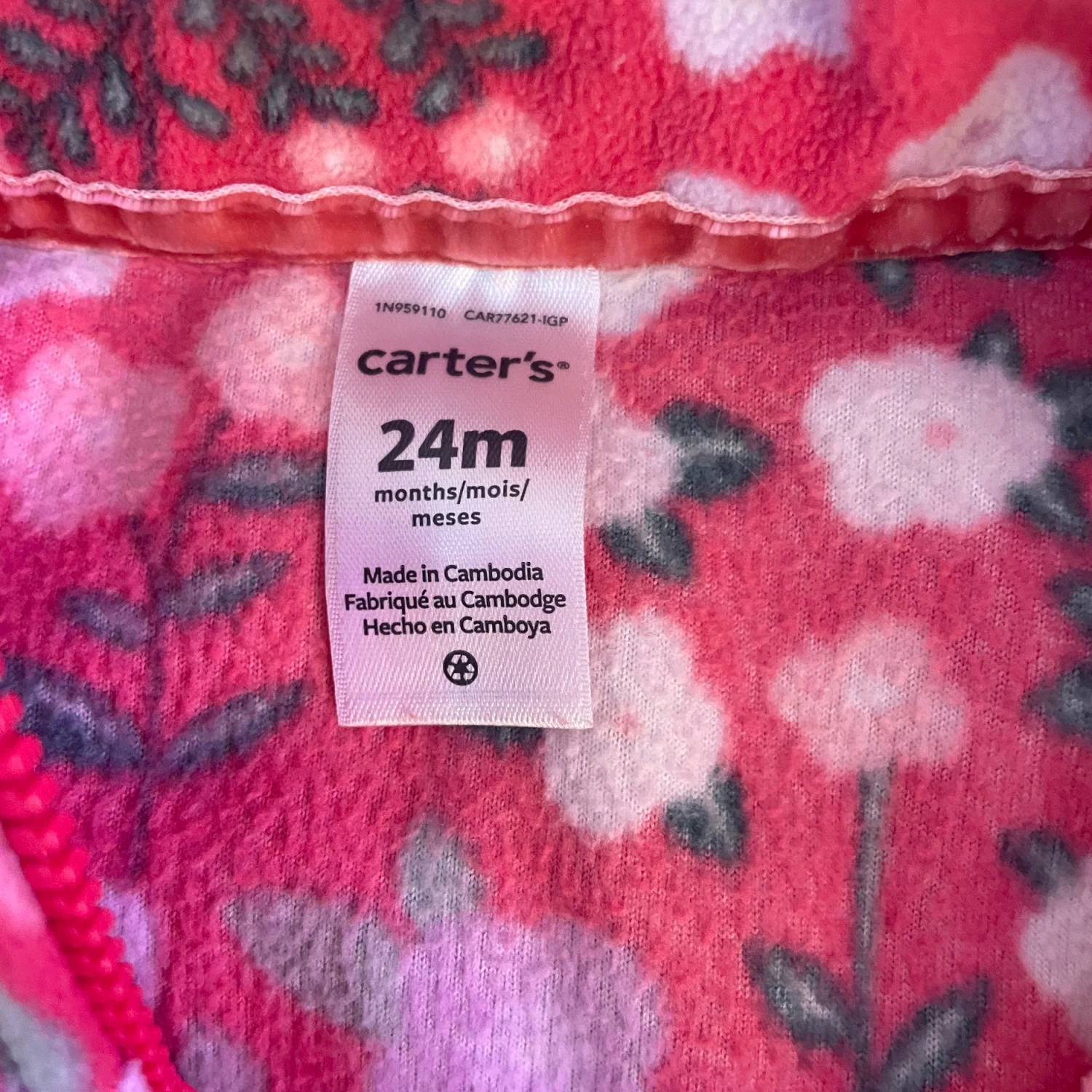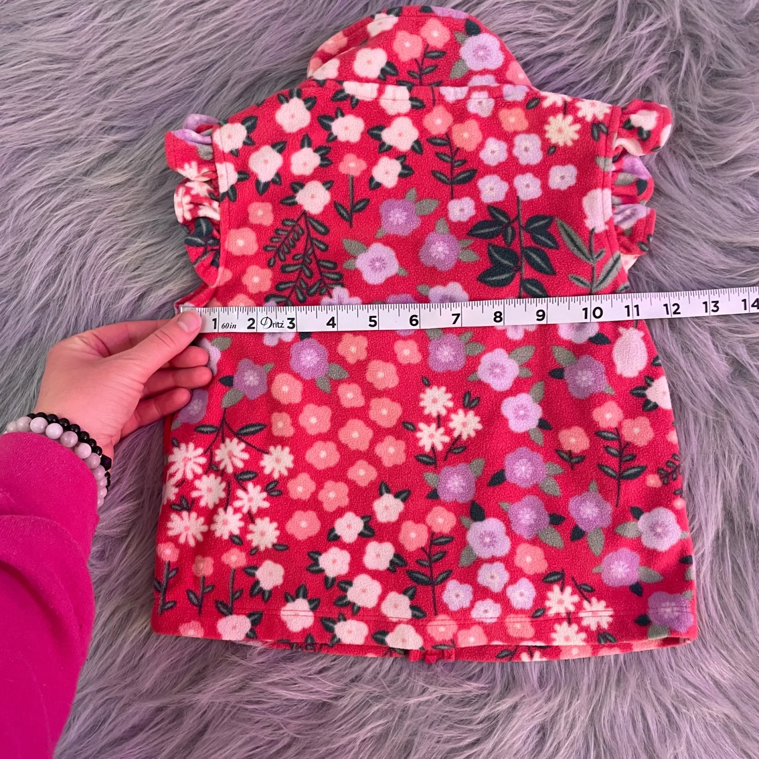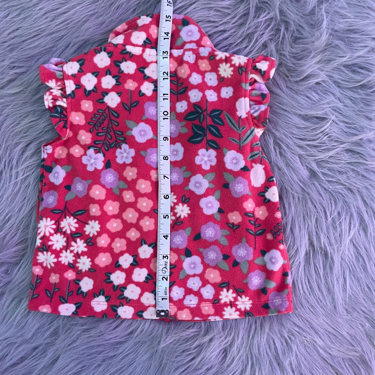 Cozy fleece jacket with floral print. Soft fabric for warmth. Zipper front closure. Cute pastel flower design. Minor wear on color on zipper