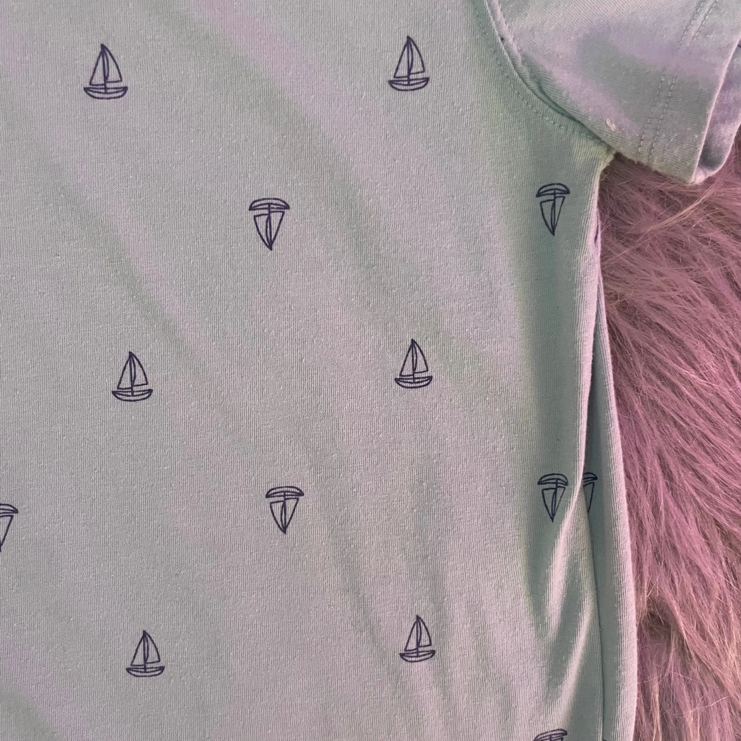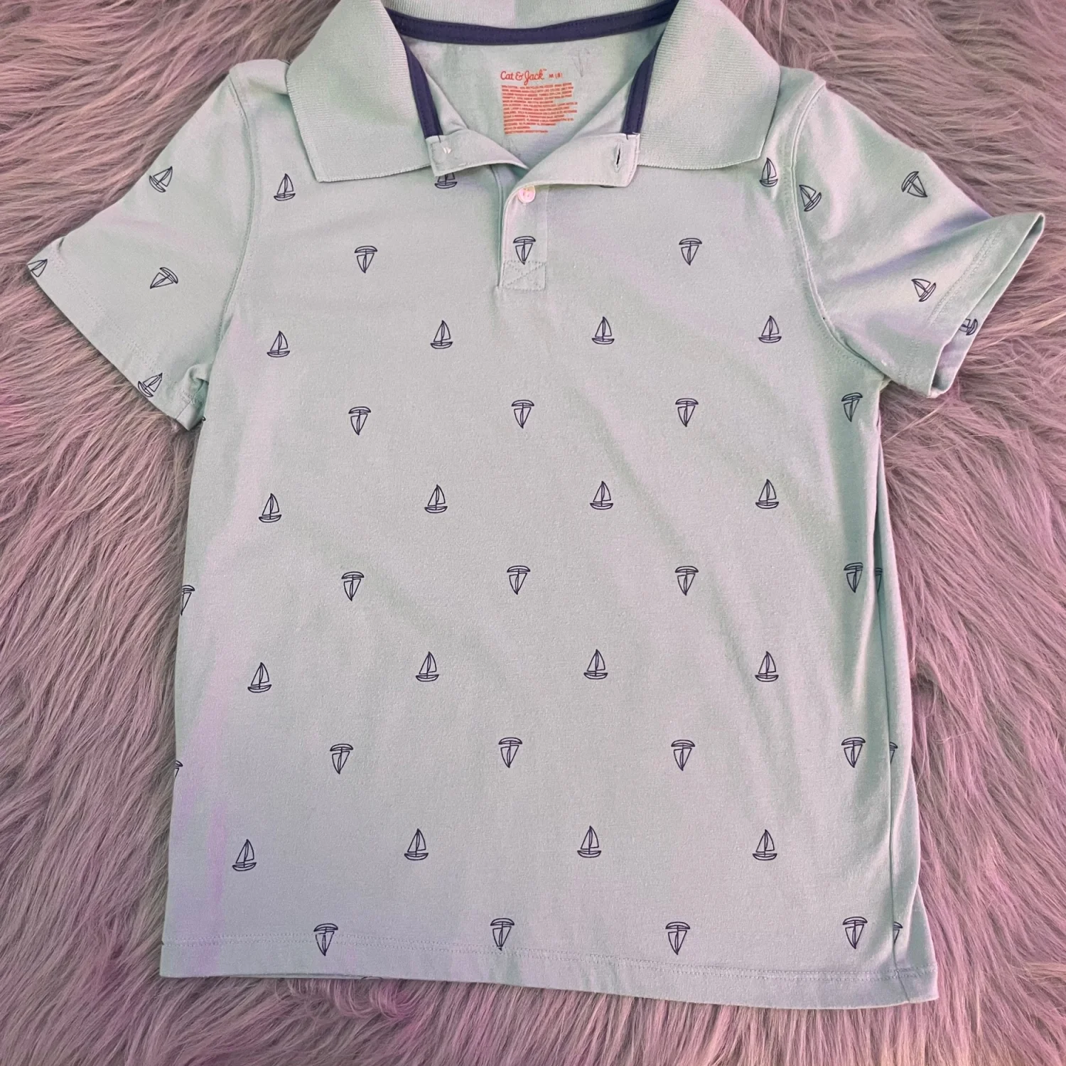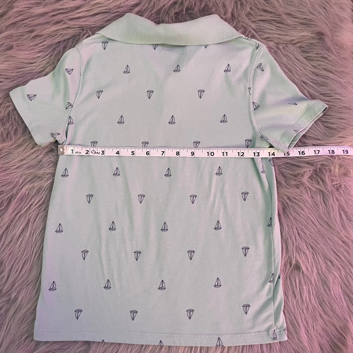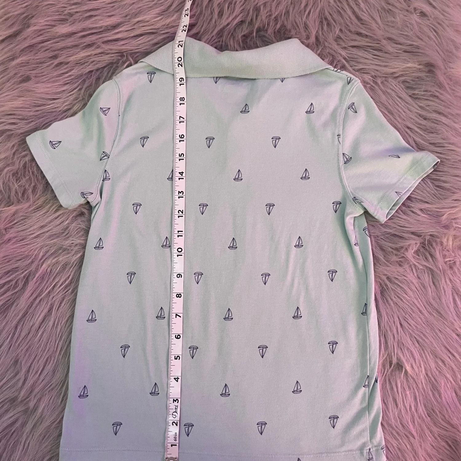 Soft light blue polo with an all-over navy sailboat print. Classic polo collar with two-button placket for easy wear. Breathable cotton-blend fabric keeps kids comfortable all day. Easy-to-style piece for casual outings and playdates.