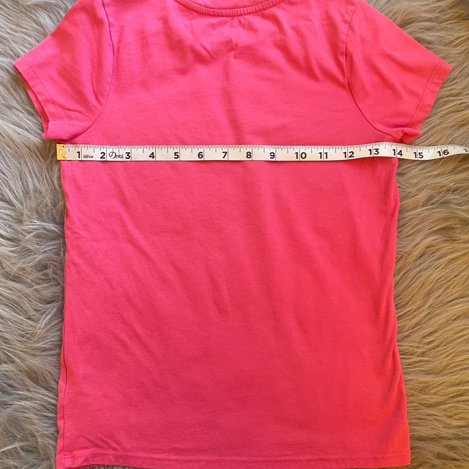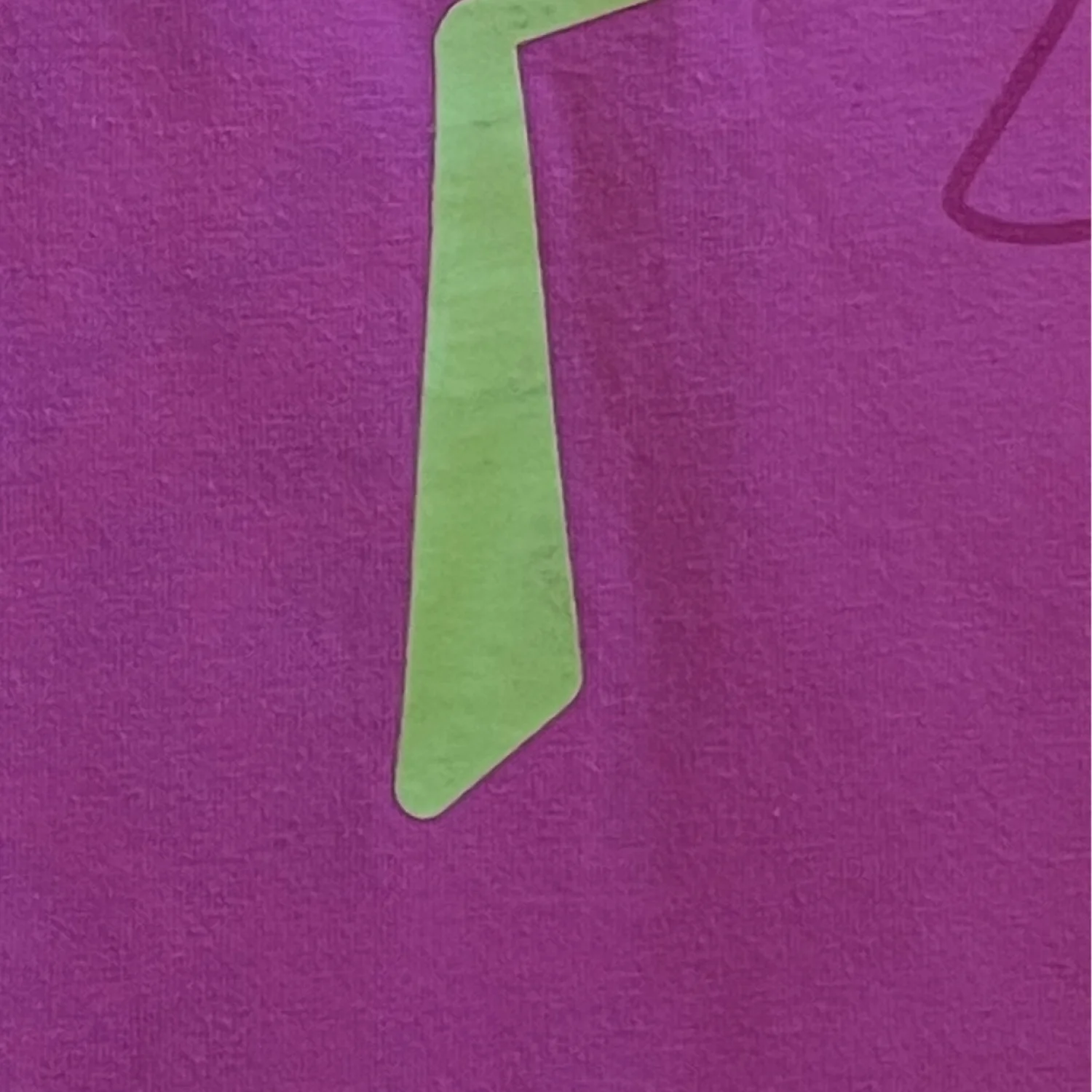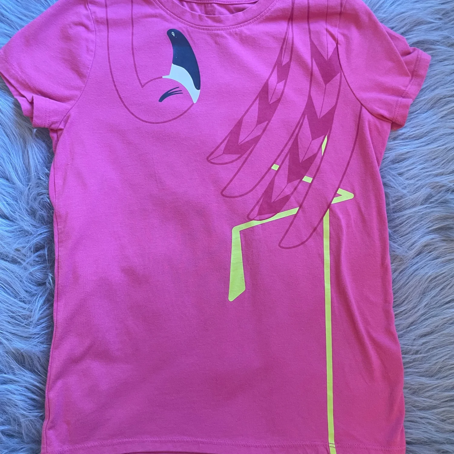Bright hot pink short-sleeve tee with a large flamingo graphic. Neon yellow accents highlight the design. Soft, easy-to-wear cotton blend. Fun and playful for everyday outfits. Difficult to see in photo and when worn but there are some brown lines on the foot. Close up photos best reflect pink shade of tee.