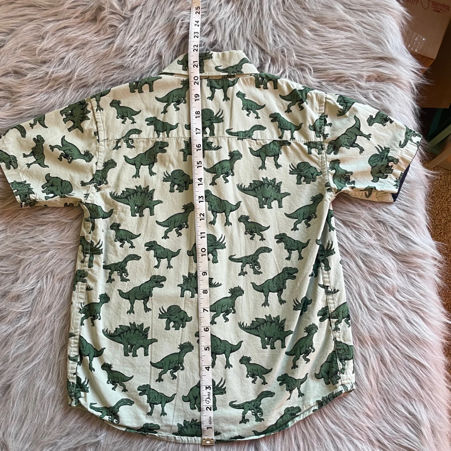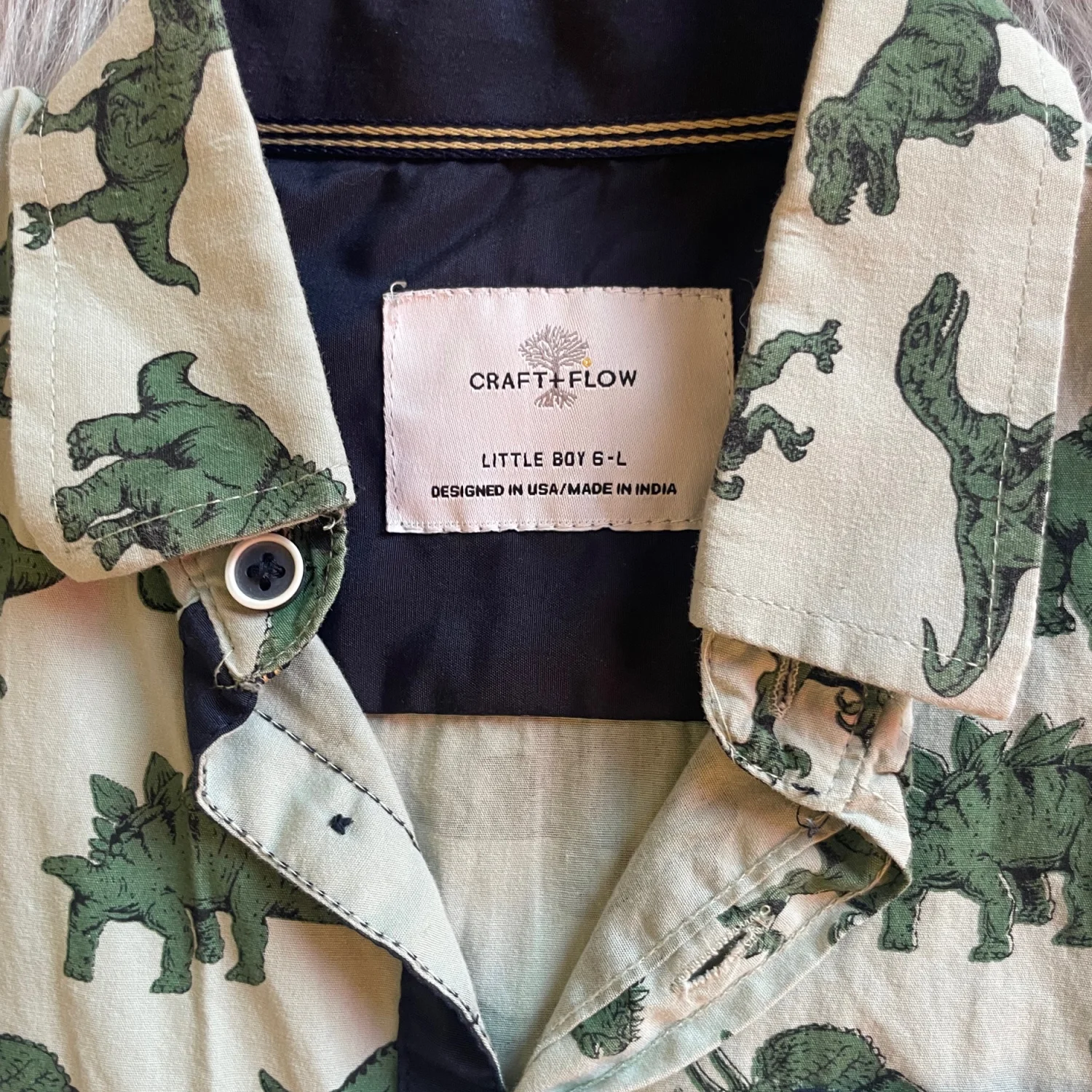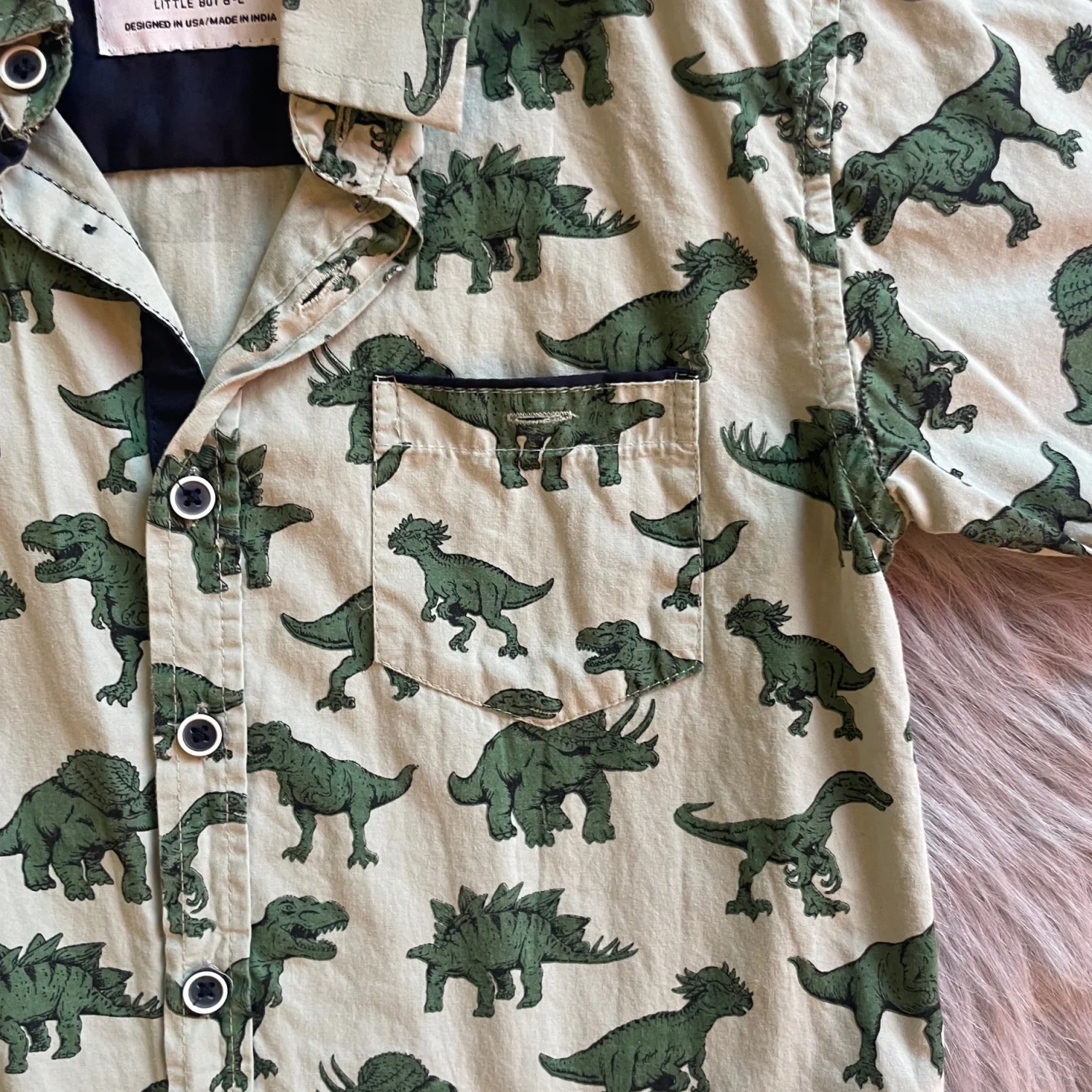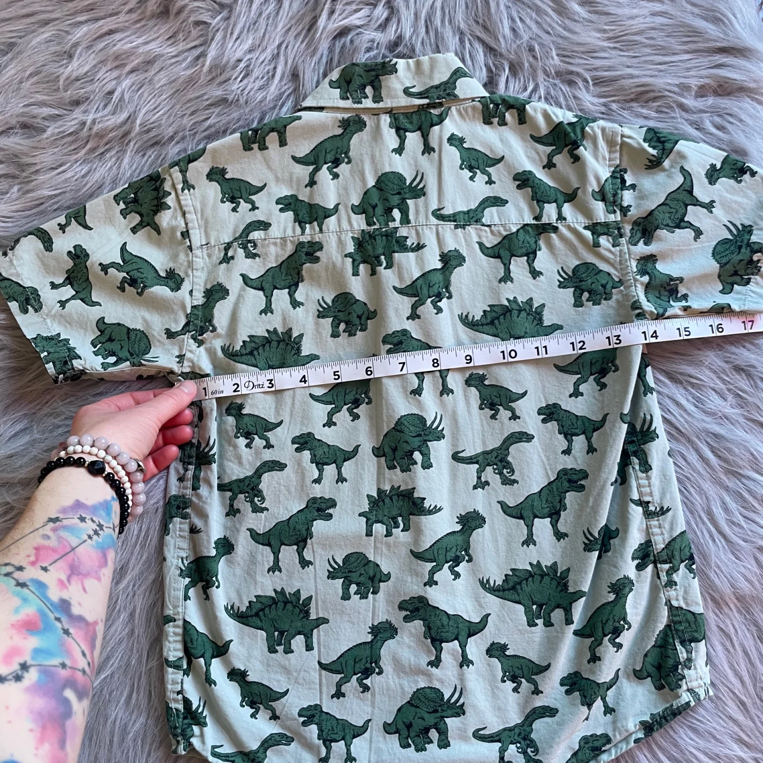 Light green short sleeve button-up with an allover dark green dinosaur print. Soft, breathable fabric for everyday wear. Classic collar and chest pocket add smart style. Easy to pair with shorts or jeans for playful looks. Fourth picture best reflects shades of green.