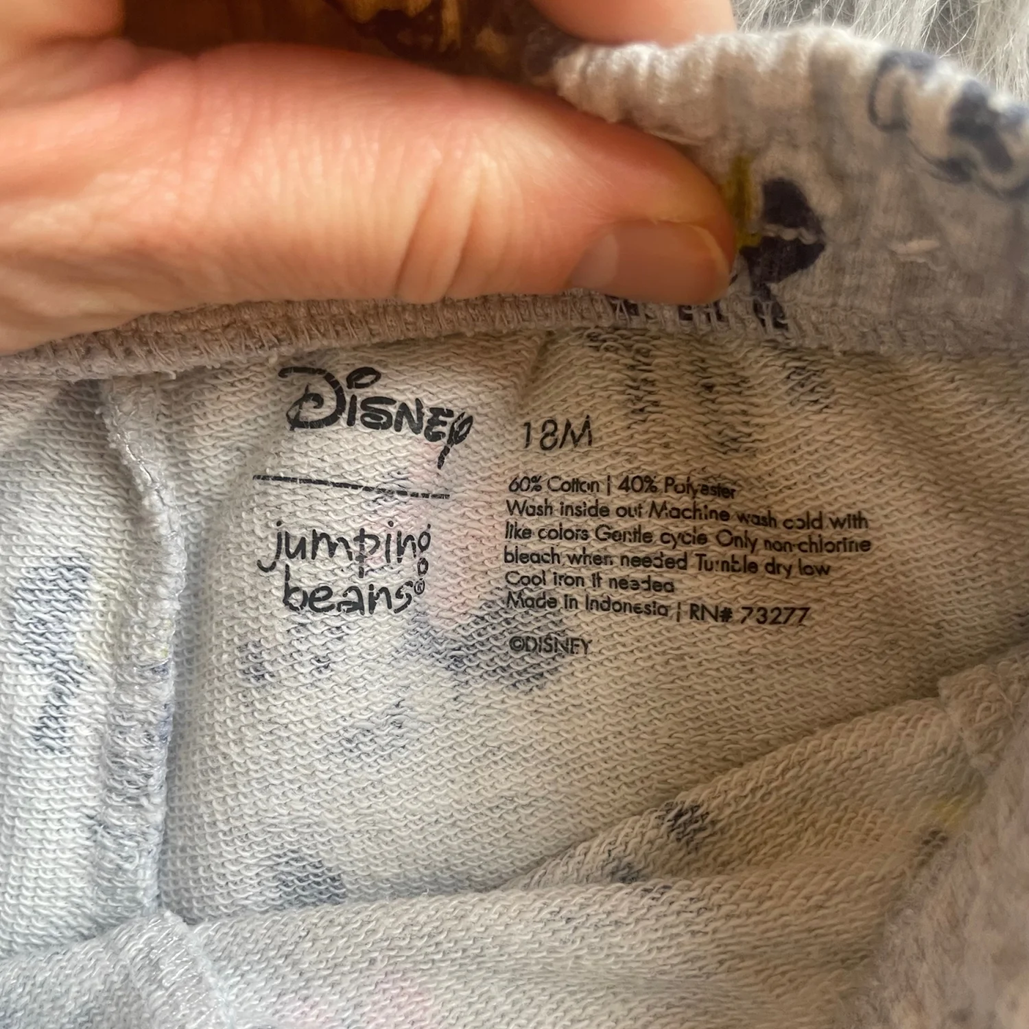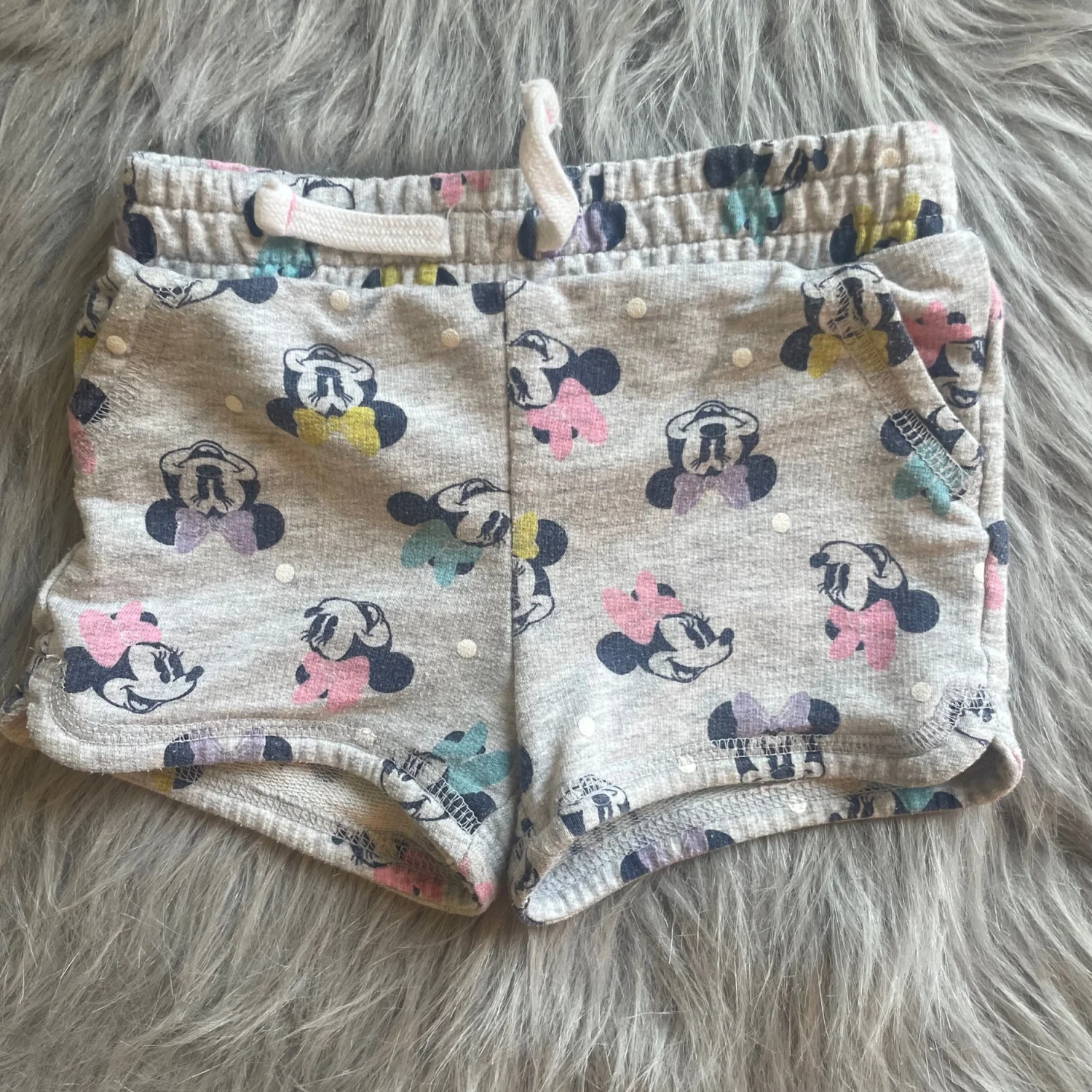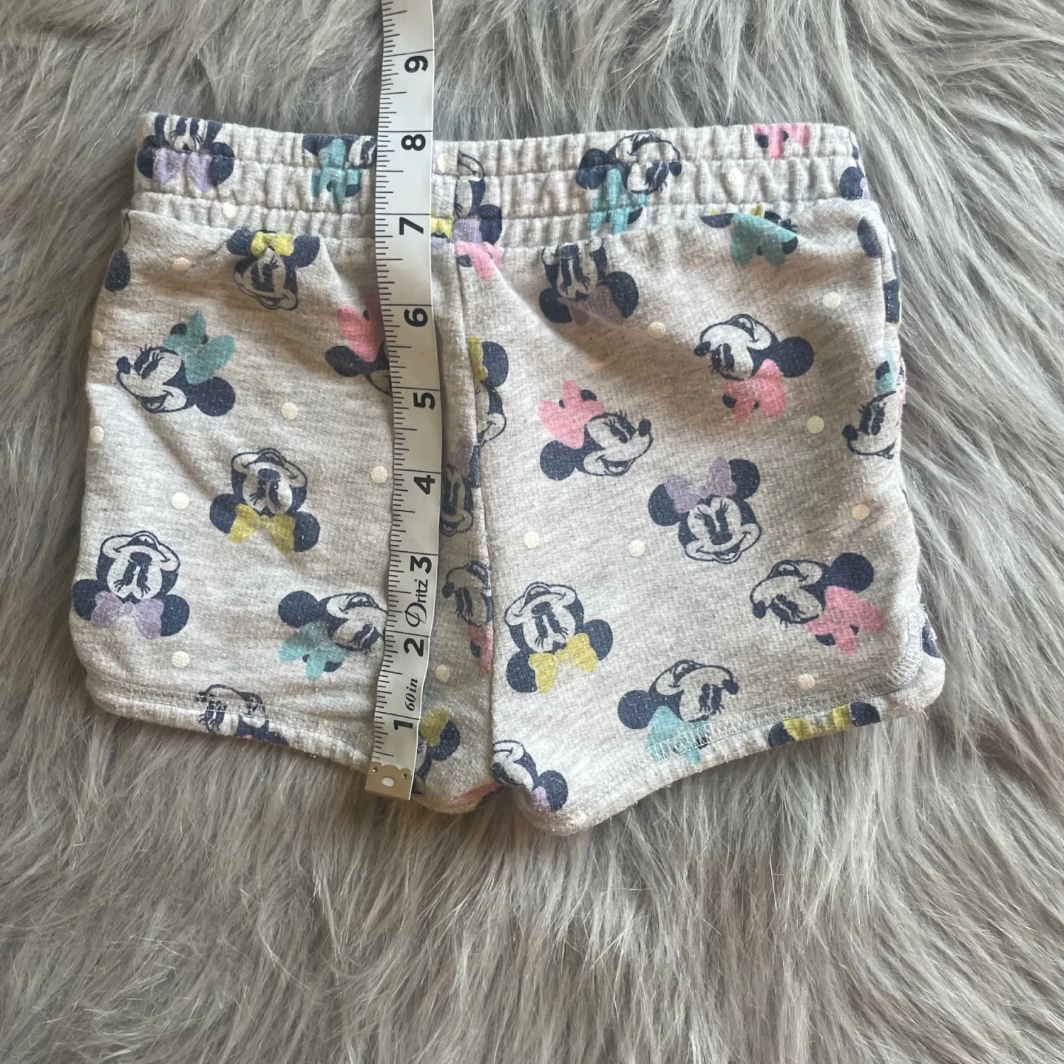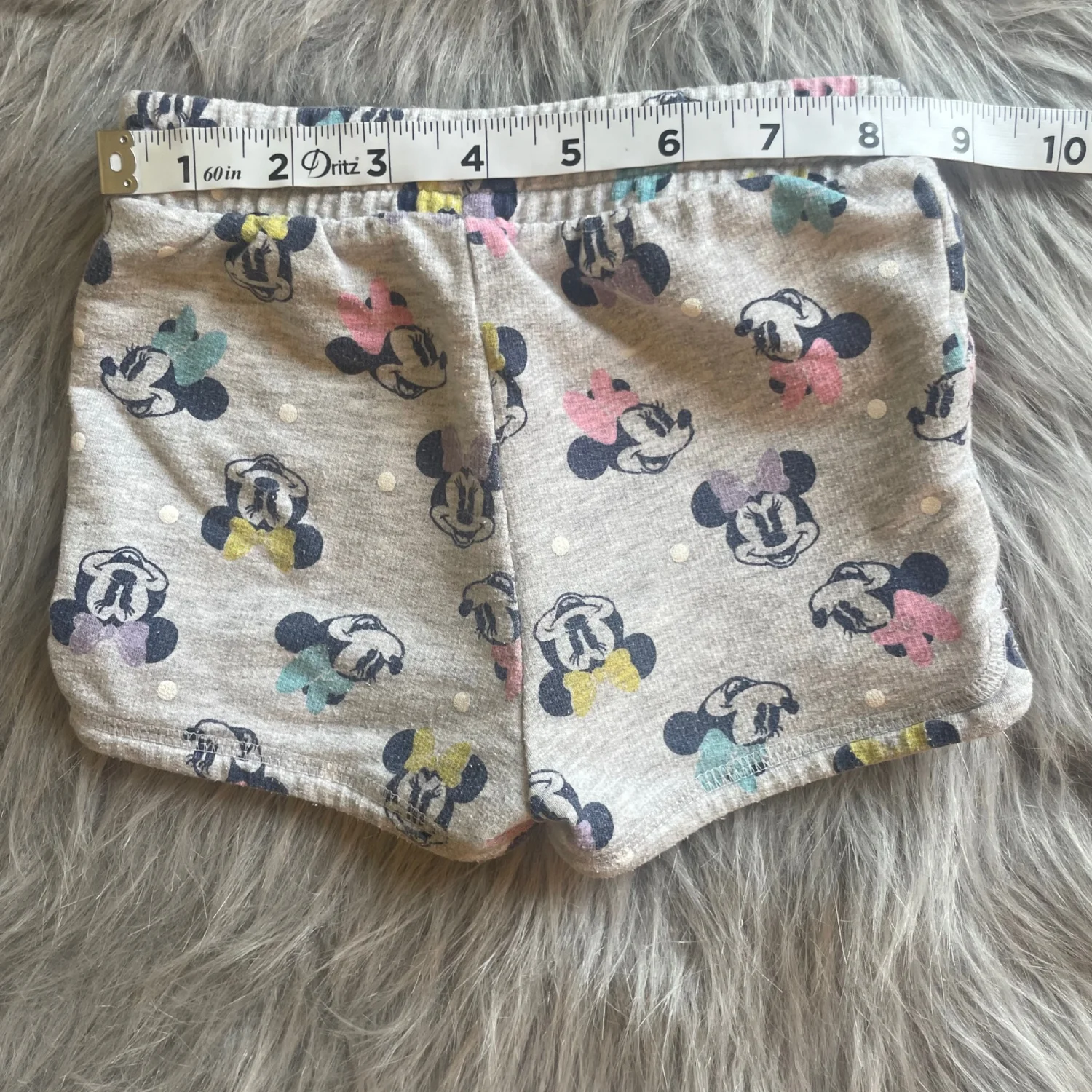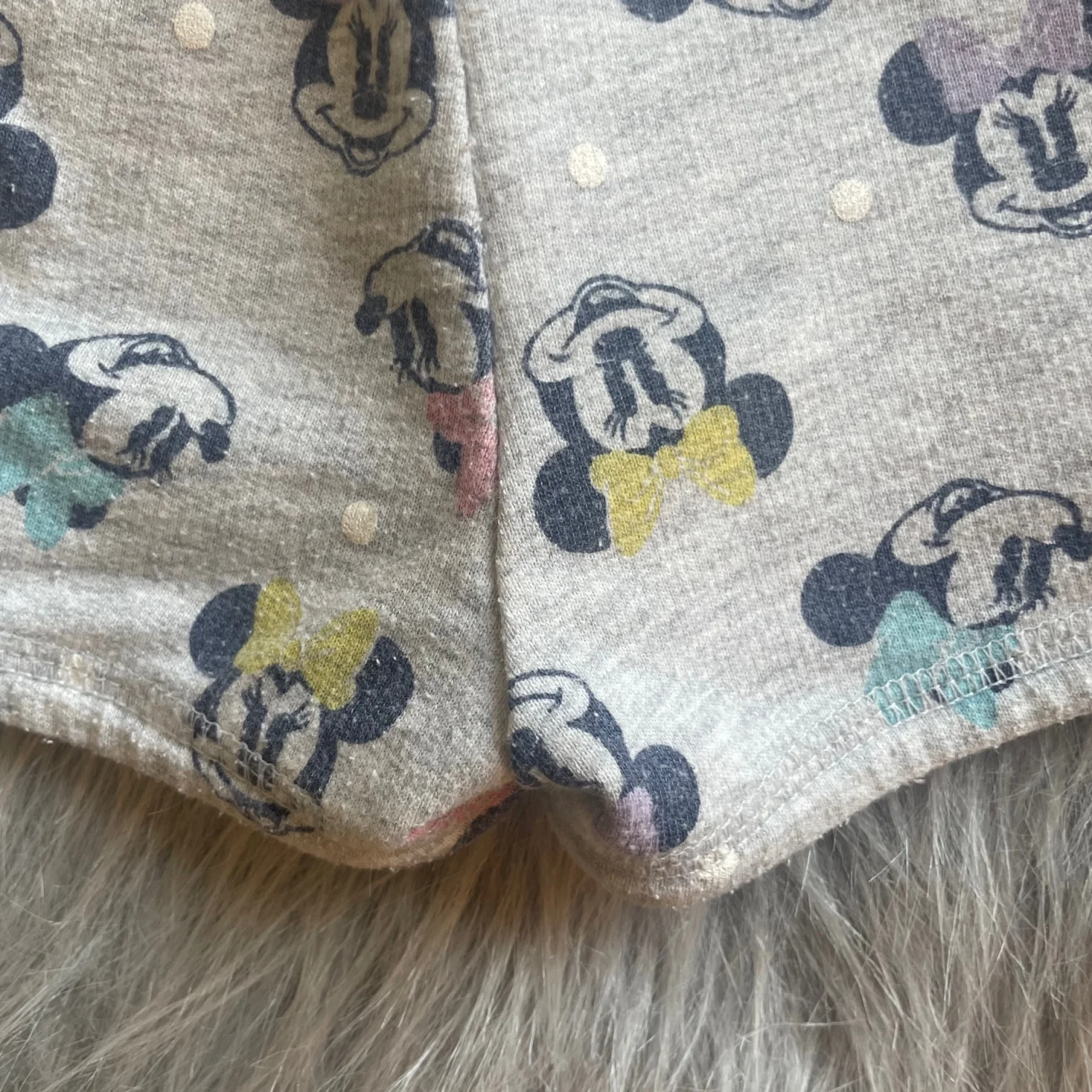 Soft grey knit toddler shorts. Features small Minnie Mouse head motifs in pastel colors. Elastic waistband for easy pull-on. Playful, child-friendly print. Minor pilling on butt