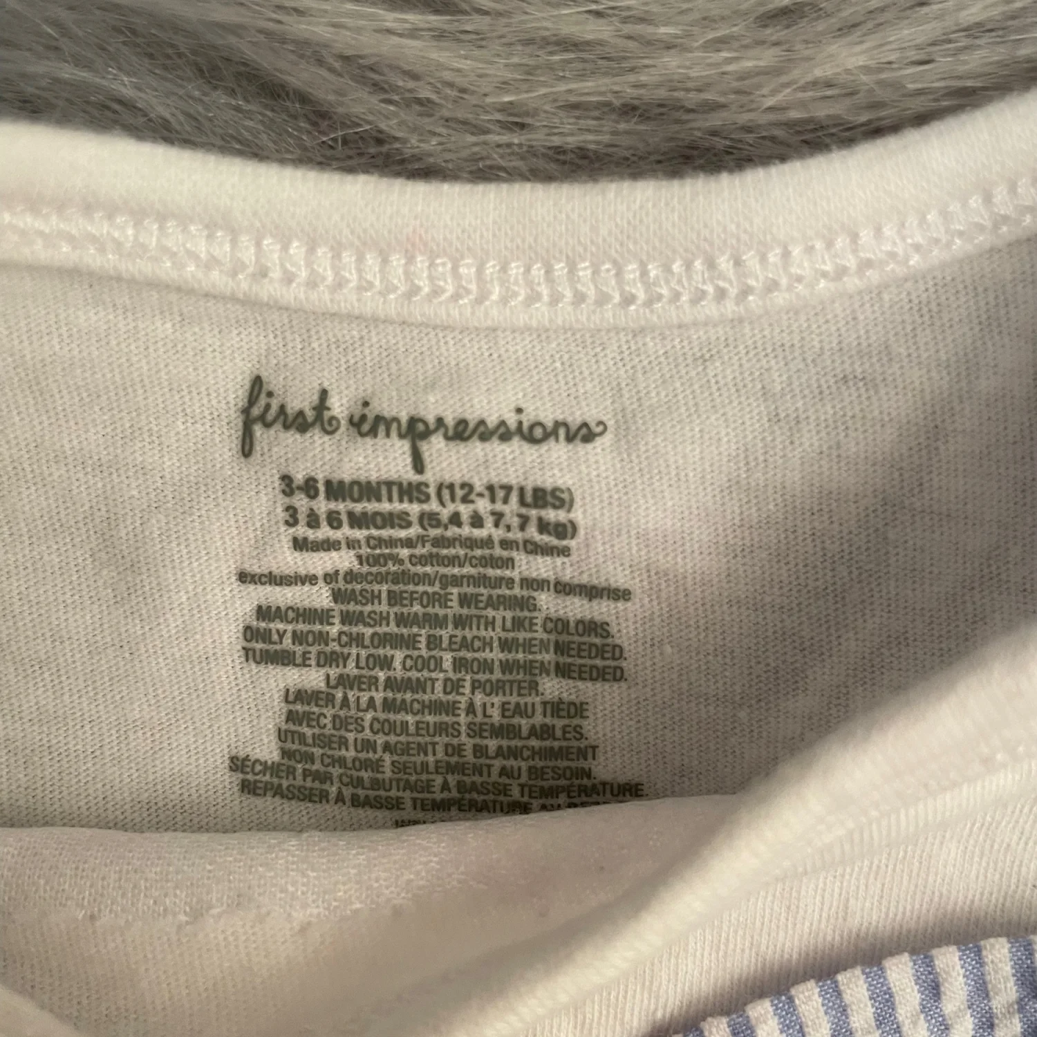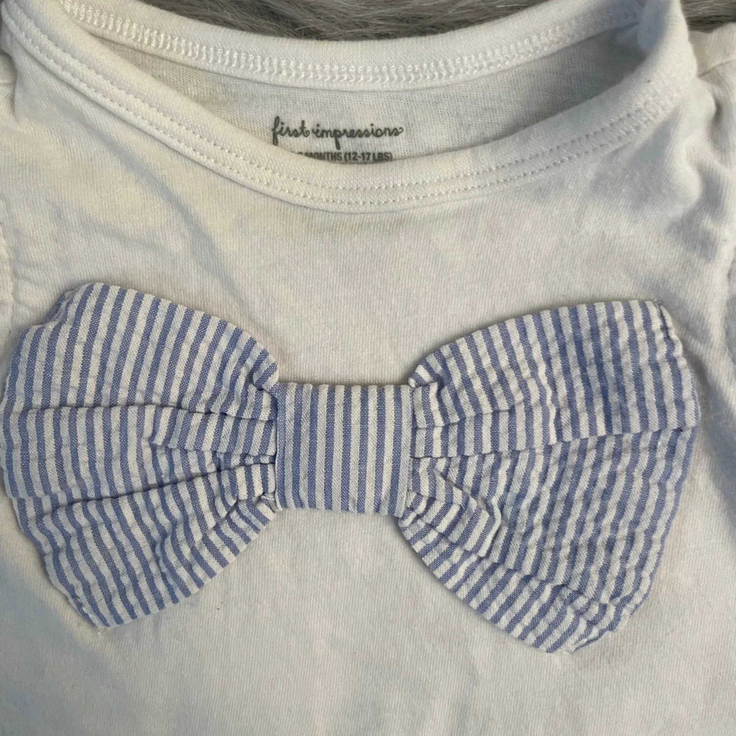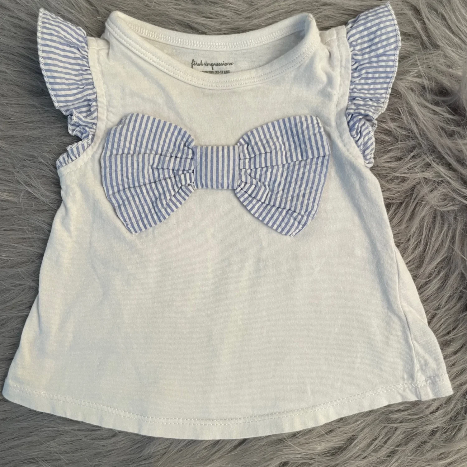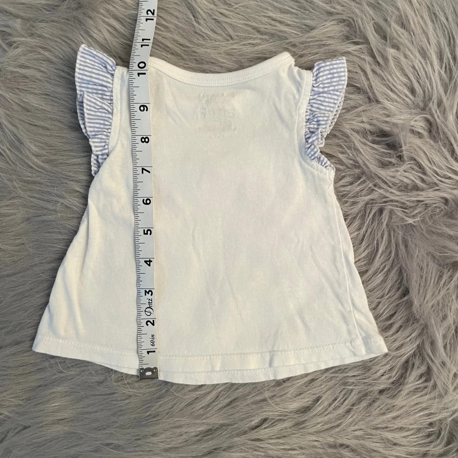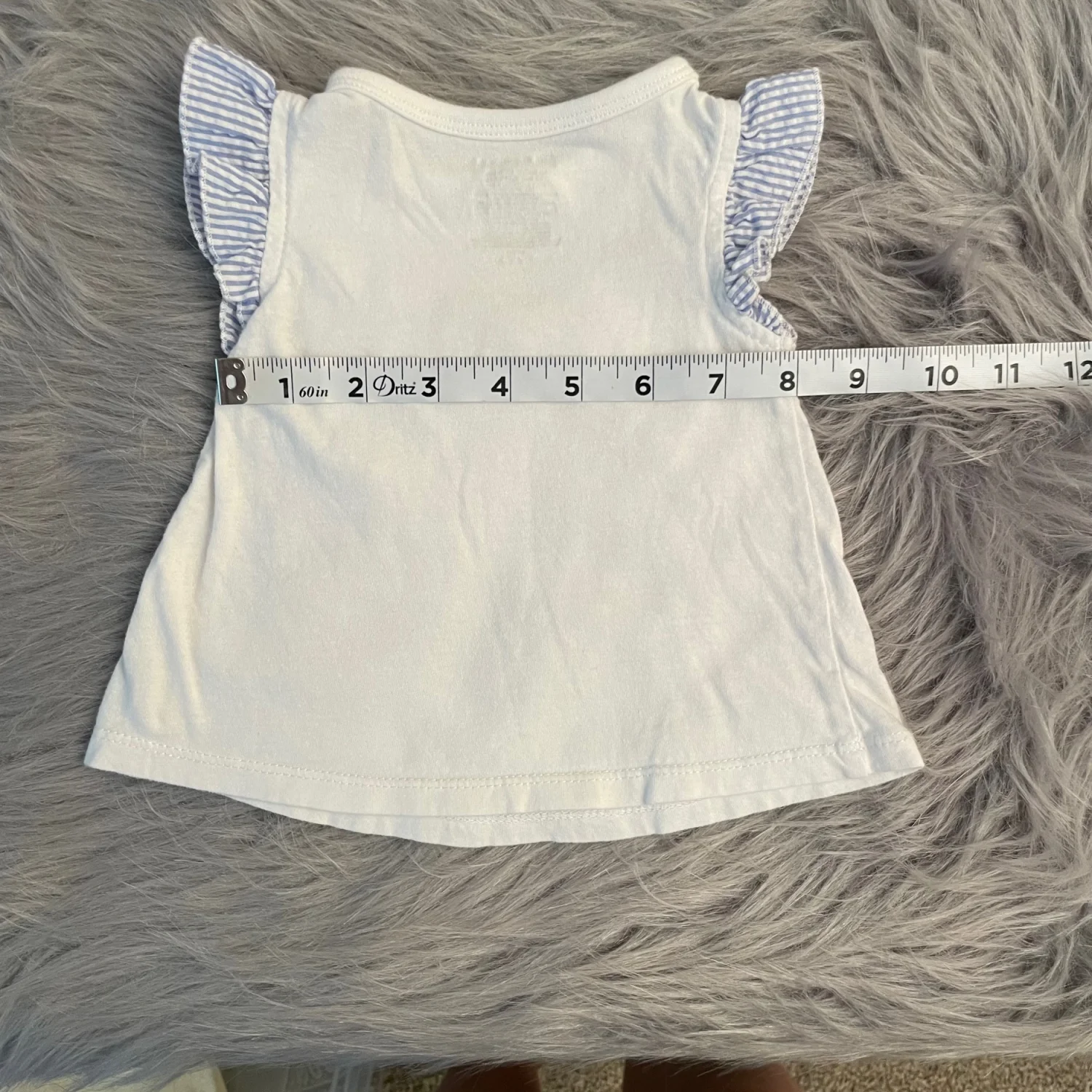 Soft white tank top with a sewn-on blue striped bow. Ruffled striped cap sleeves add charm. Easy to pair for everyday wear.