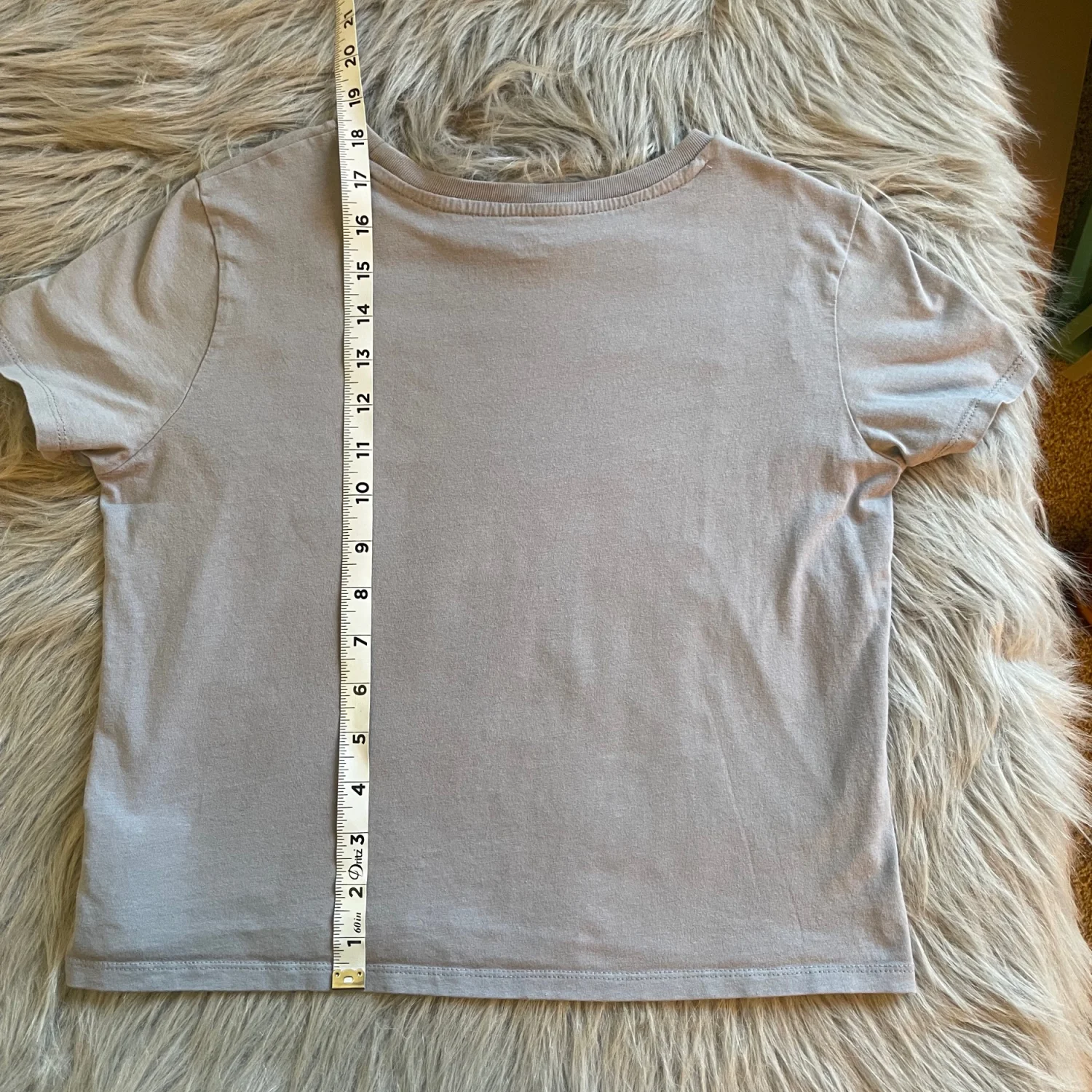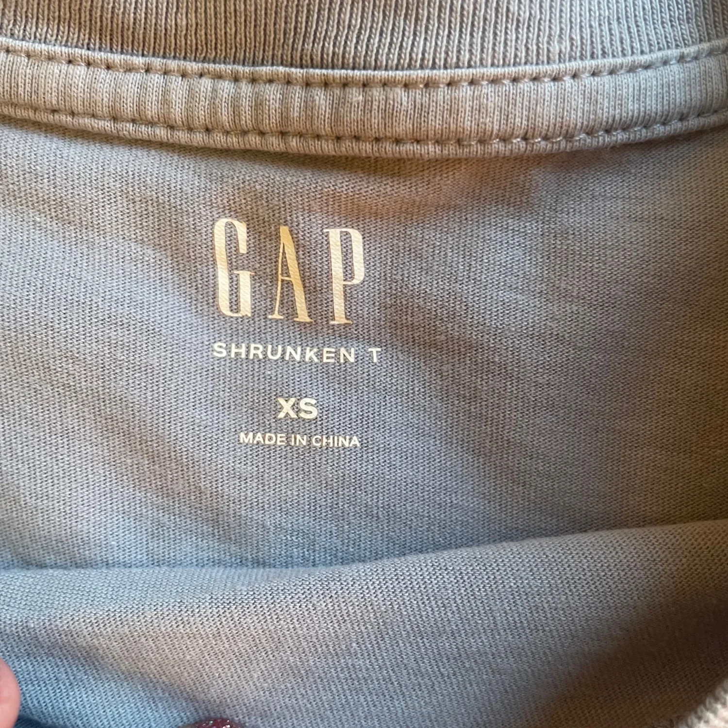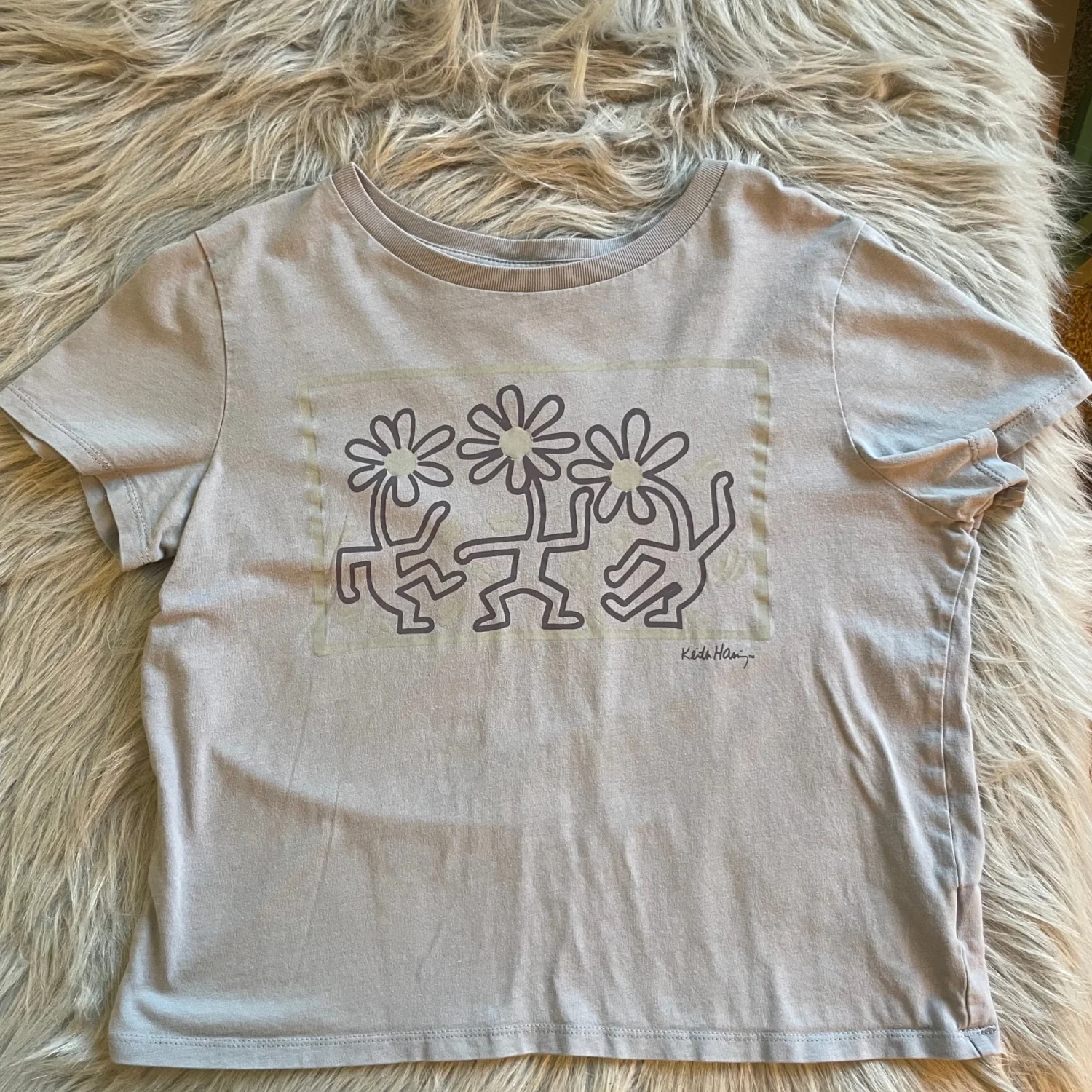 GAP short sleeve tee with playful flower-head dancers across the chest. Simple crew neckline and soft knit fabric. Subtle framed print adds charm to casual looks. Photographed gray but is a darker blue. Small hole from tag in shoulder.