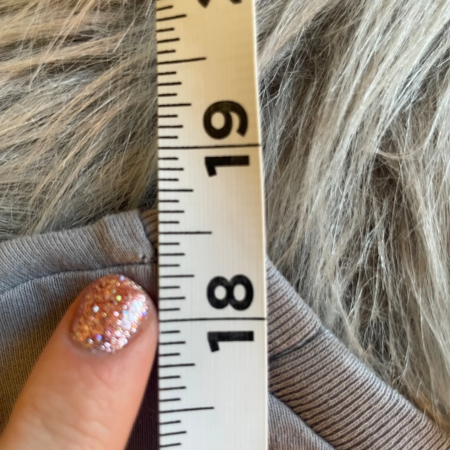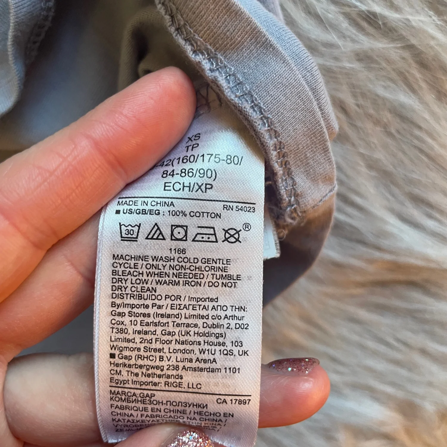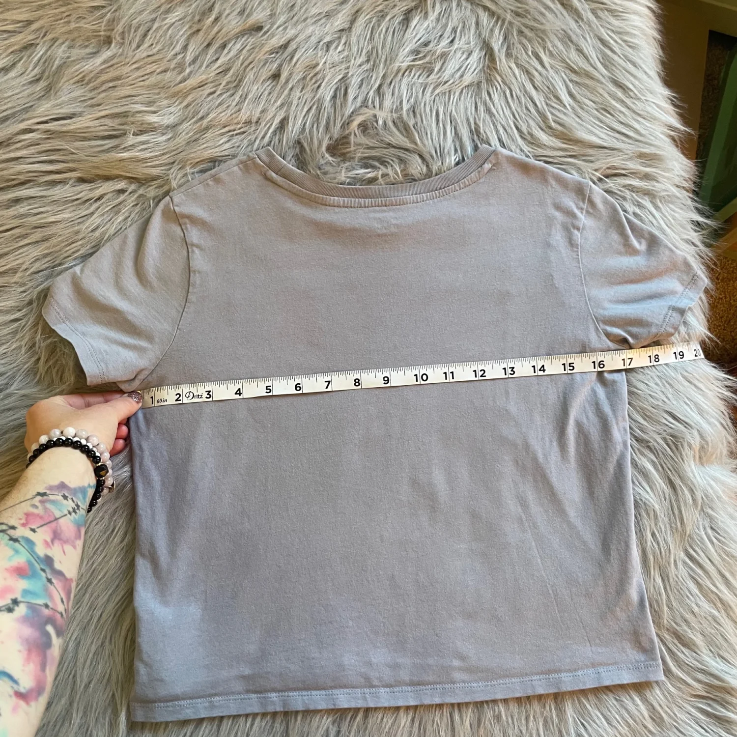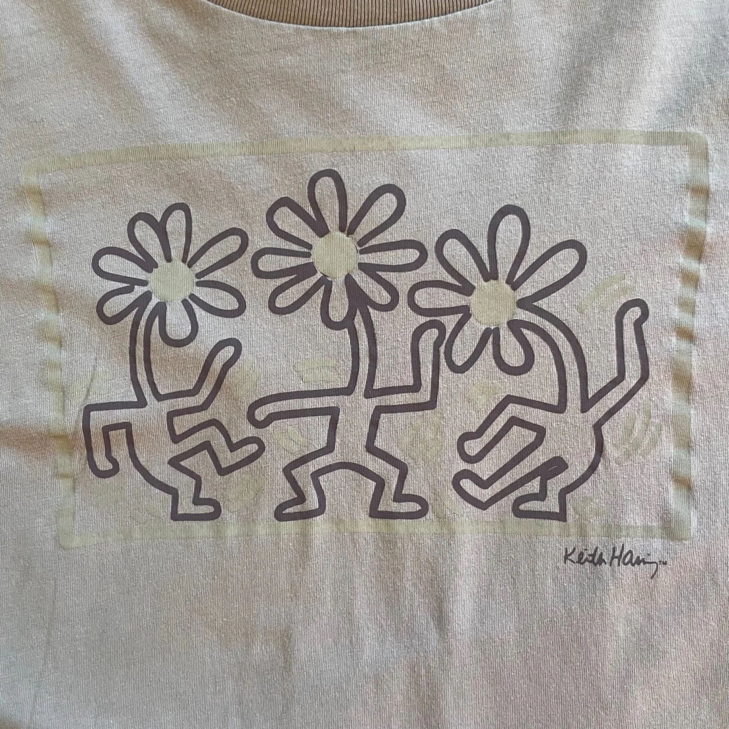 GAP short sleeve tee with playful flower-head dancers across the chest. Simple crew neckline and soft knit fabric. Subtle framed print adds charm to casual looks. Photographed gray but is a darker blue. Small hole from tag in shoulder.