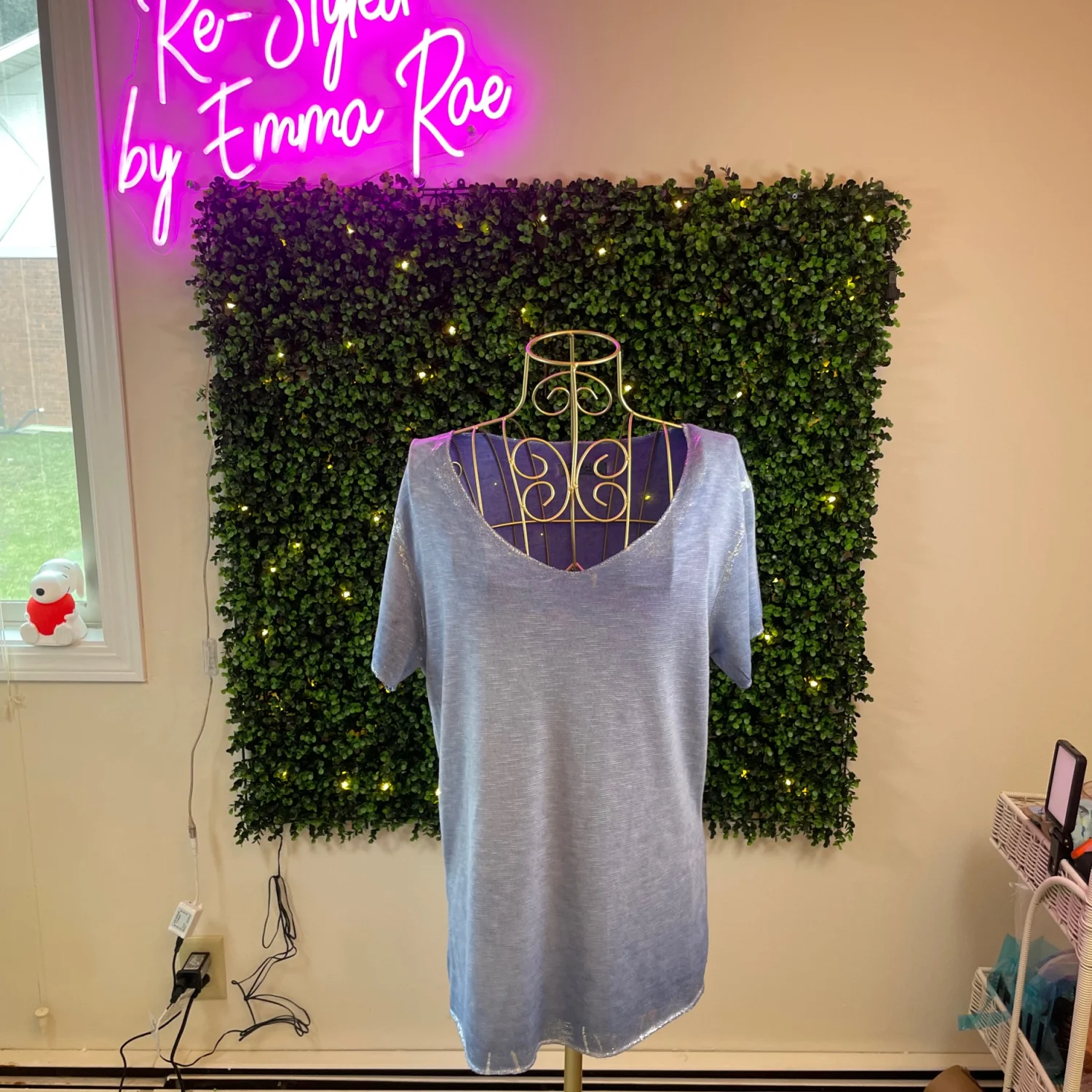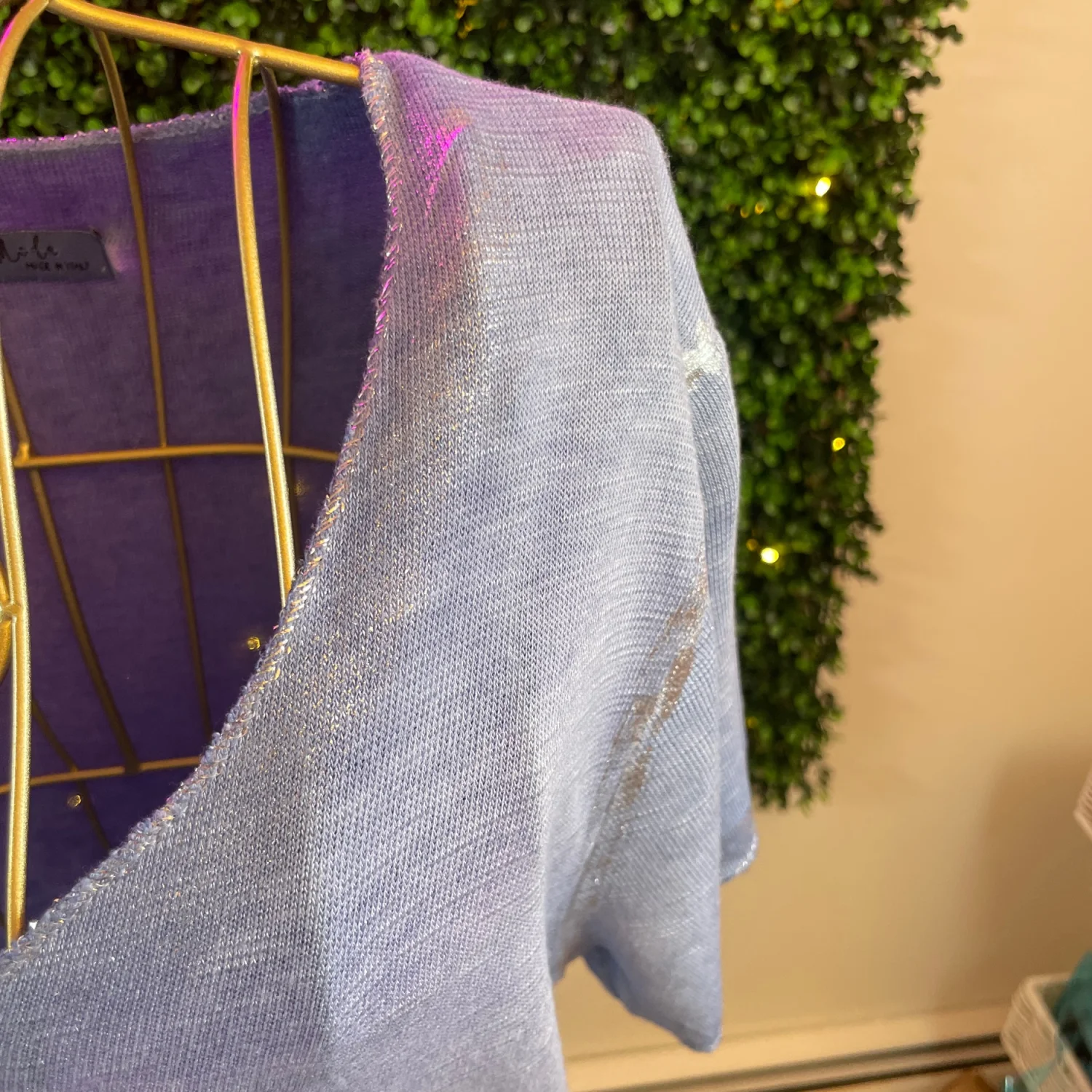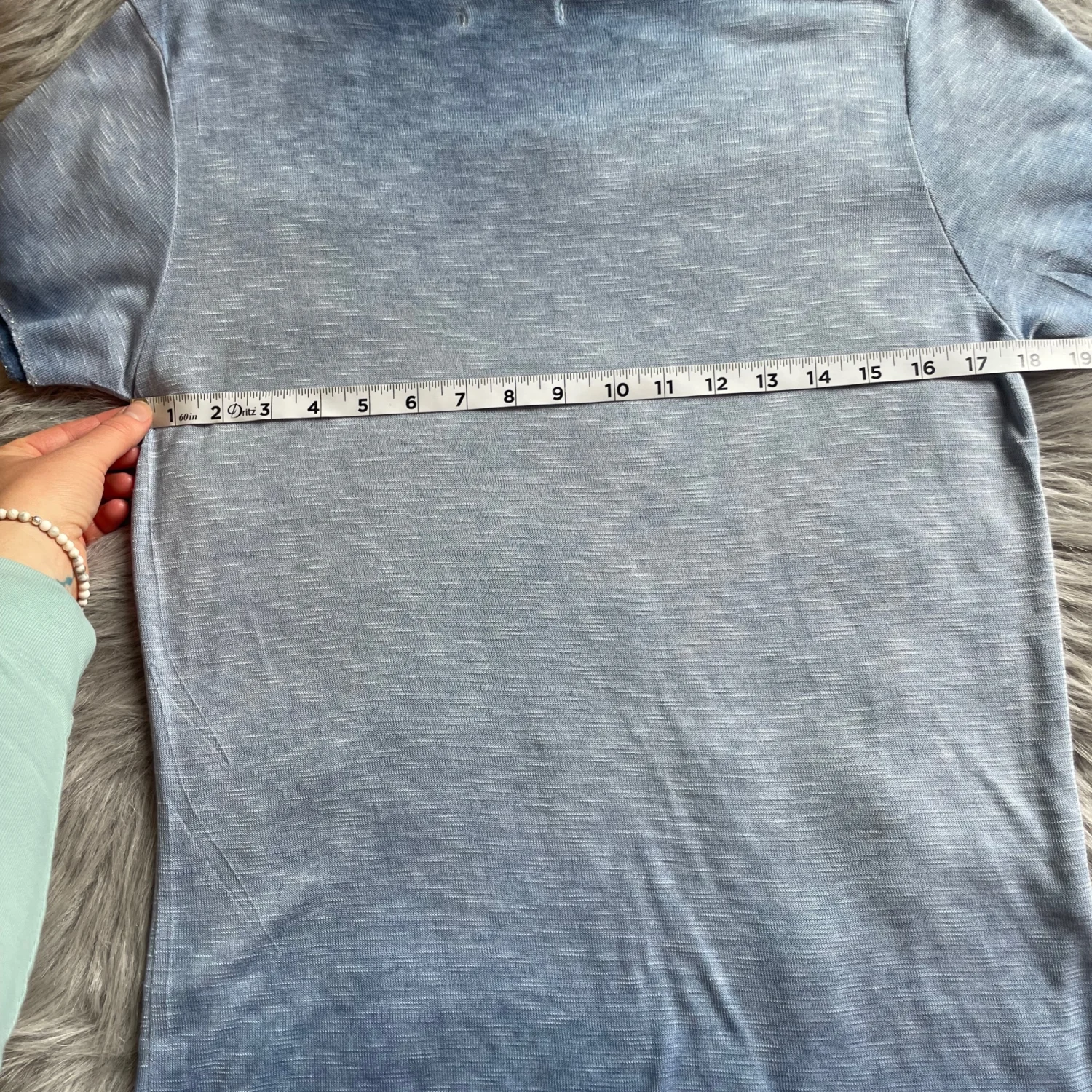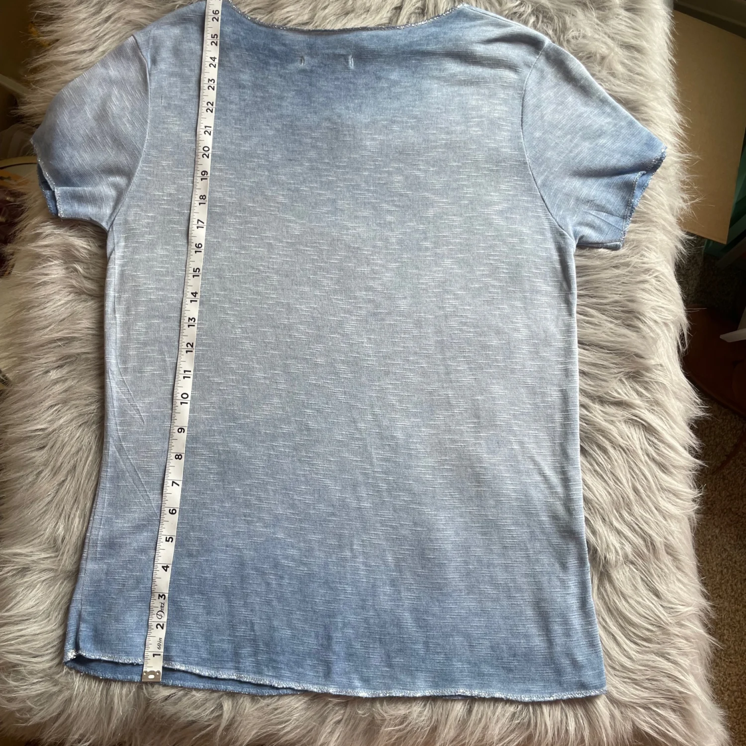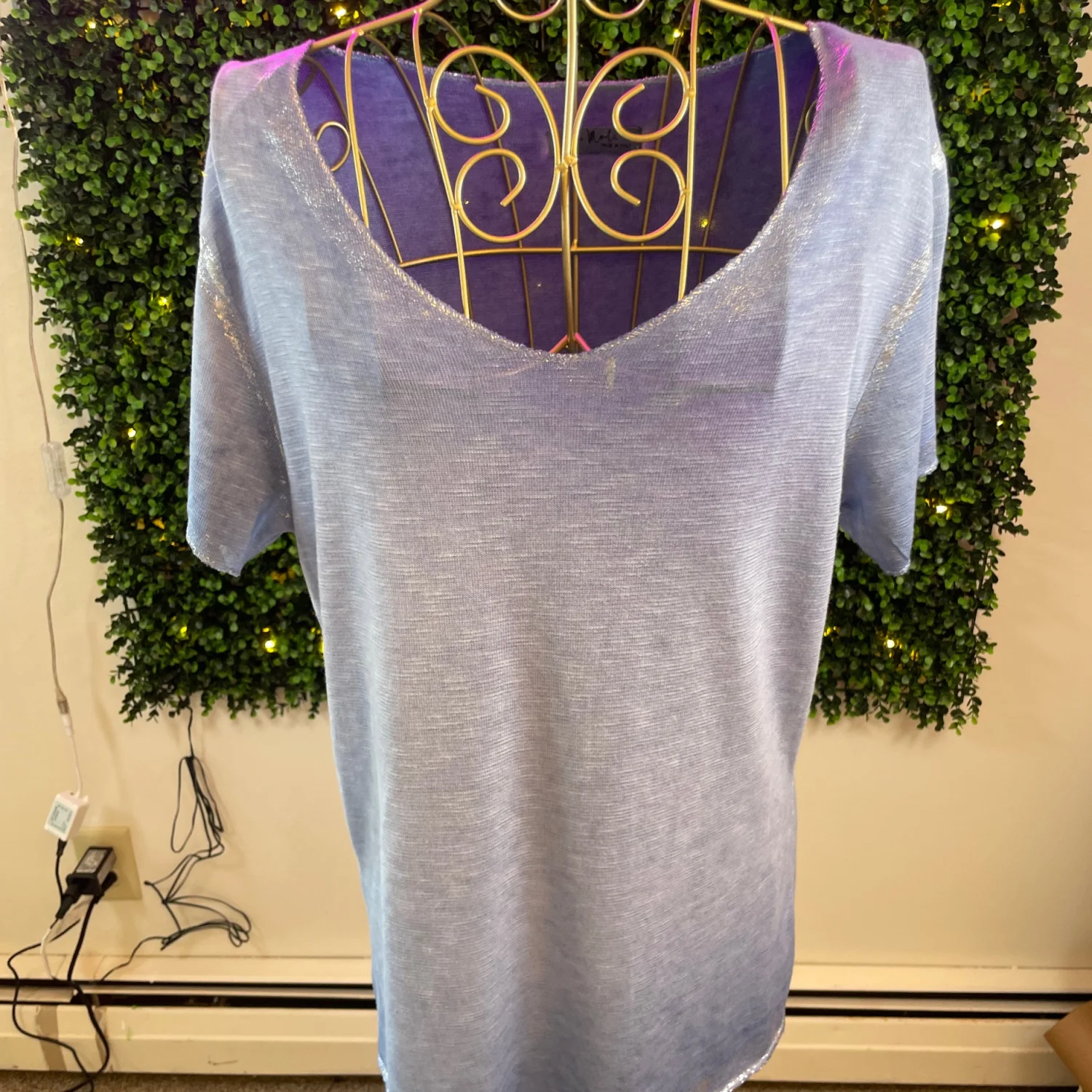 Light blue women's V-neck tee with short sleeves. Soft, breathable fabric for everyday wear. Casual, relaxed fit that pairs easily with jeans or leggings. Easy-care style ideal for layering or solo wear. Gigi Moda is typically labeled “Made in Italy” which means one size so there is no size associated with this shirt. Make sure the measurements in the photos work for you.
