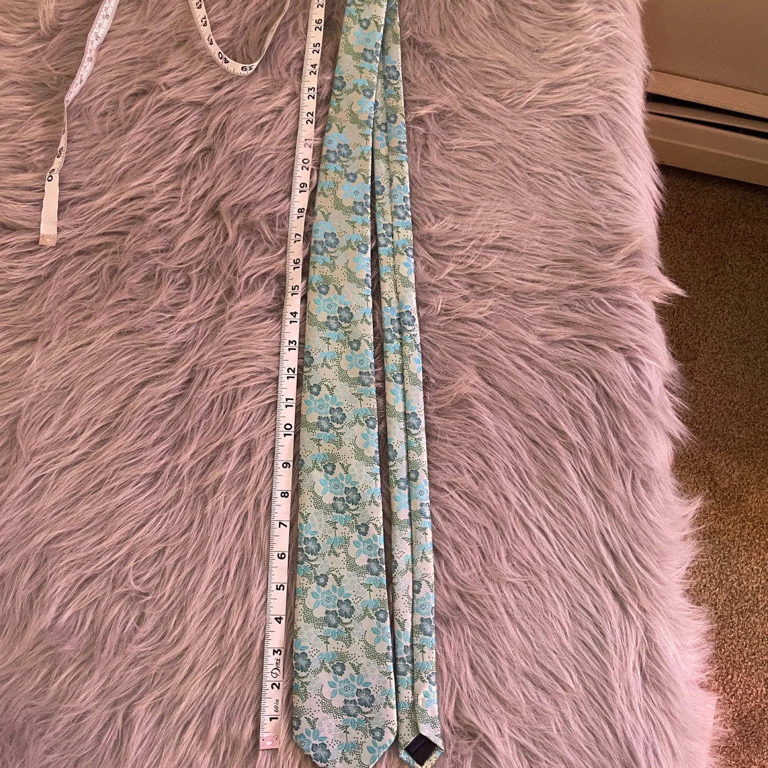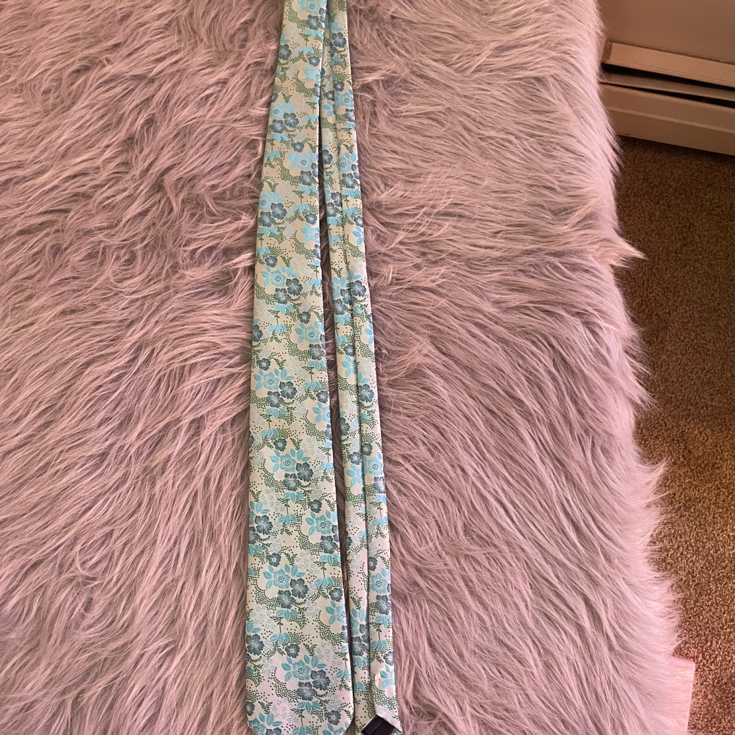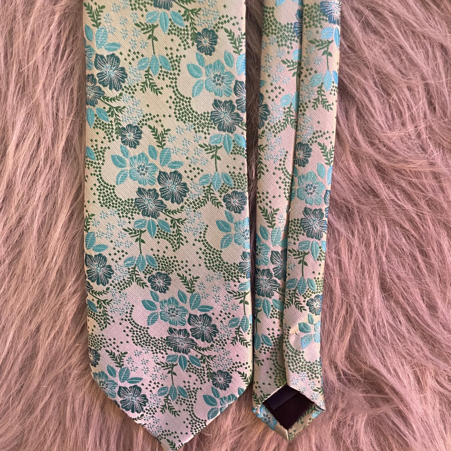 Mint green base with teal and pale blue flowers. In perfect condition.