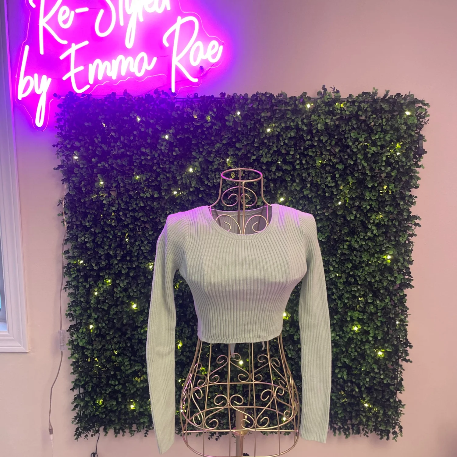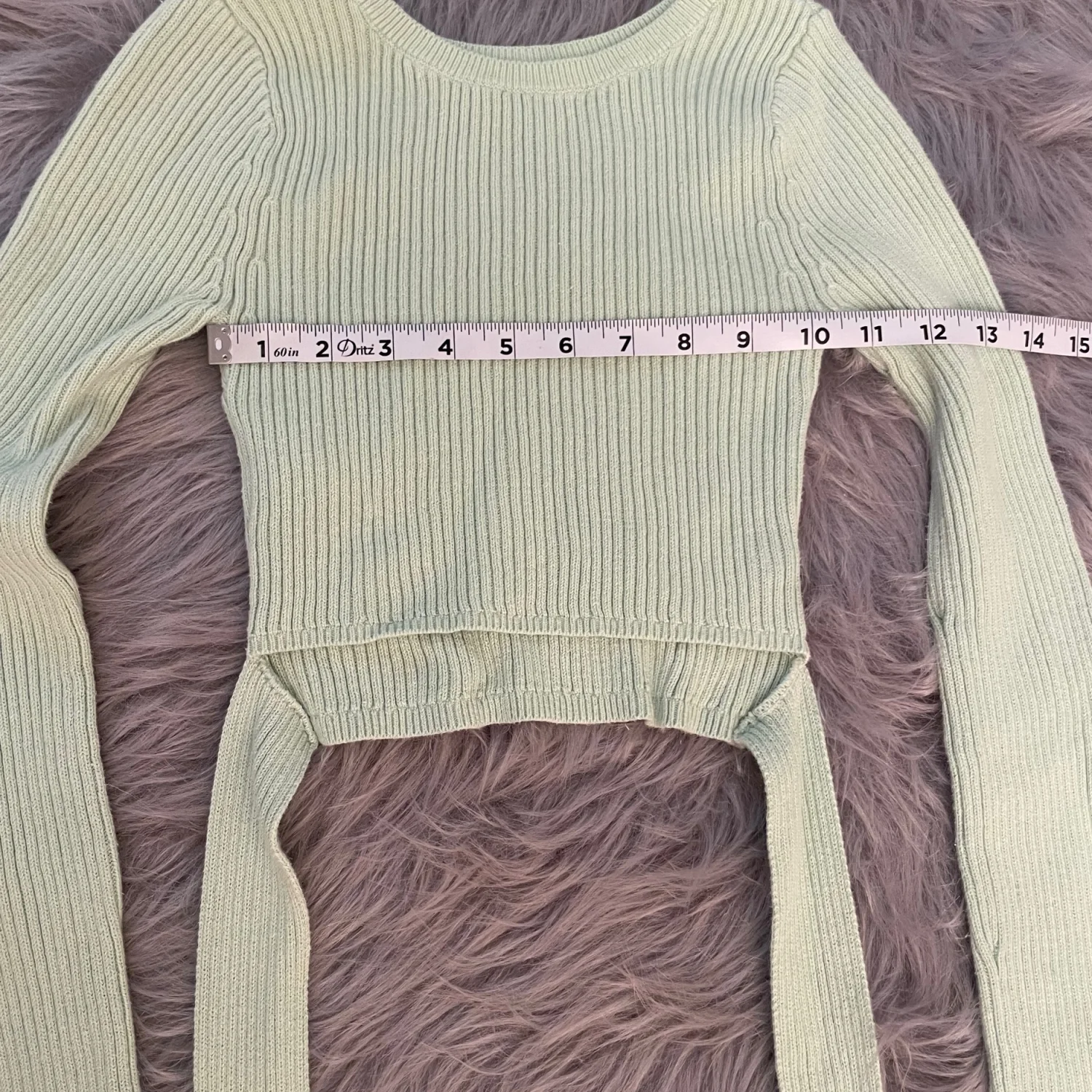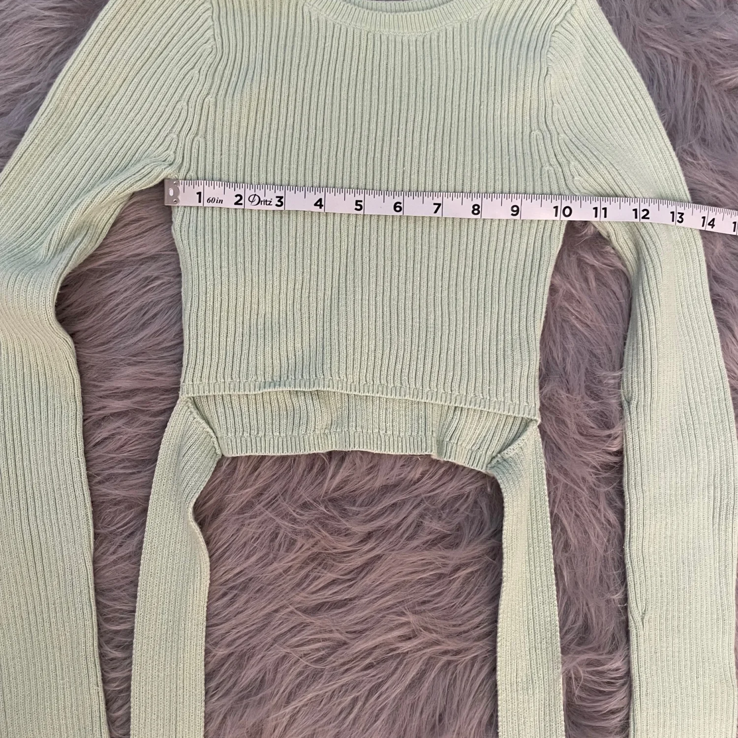 Chic light green ribbed knit top. Features long sleeves and stylish design. Cropped Teen