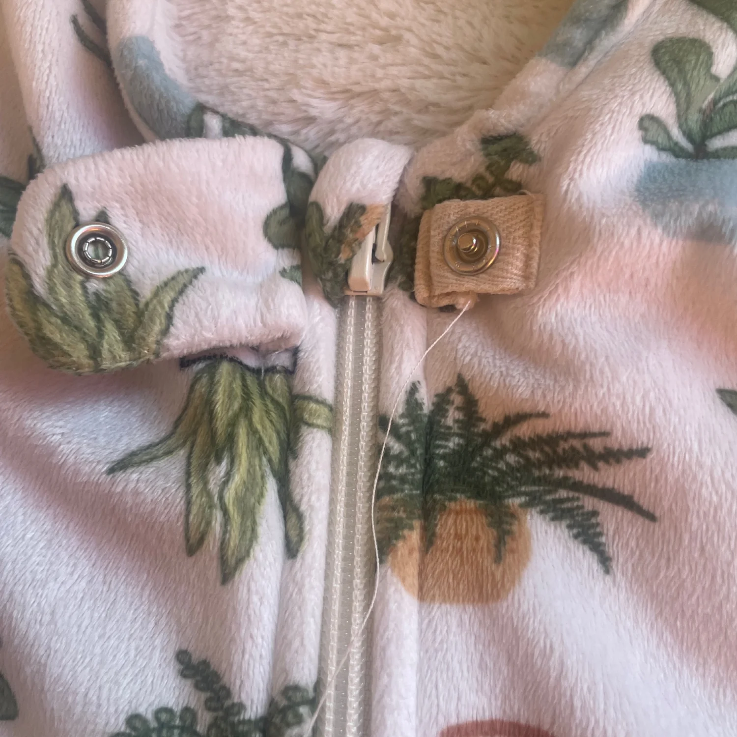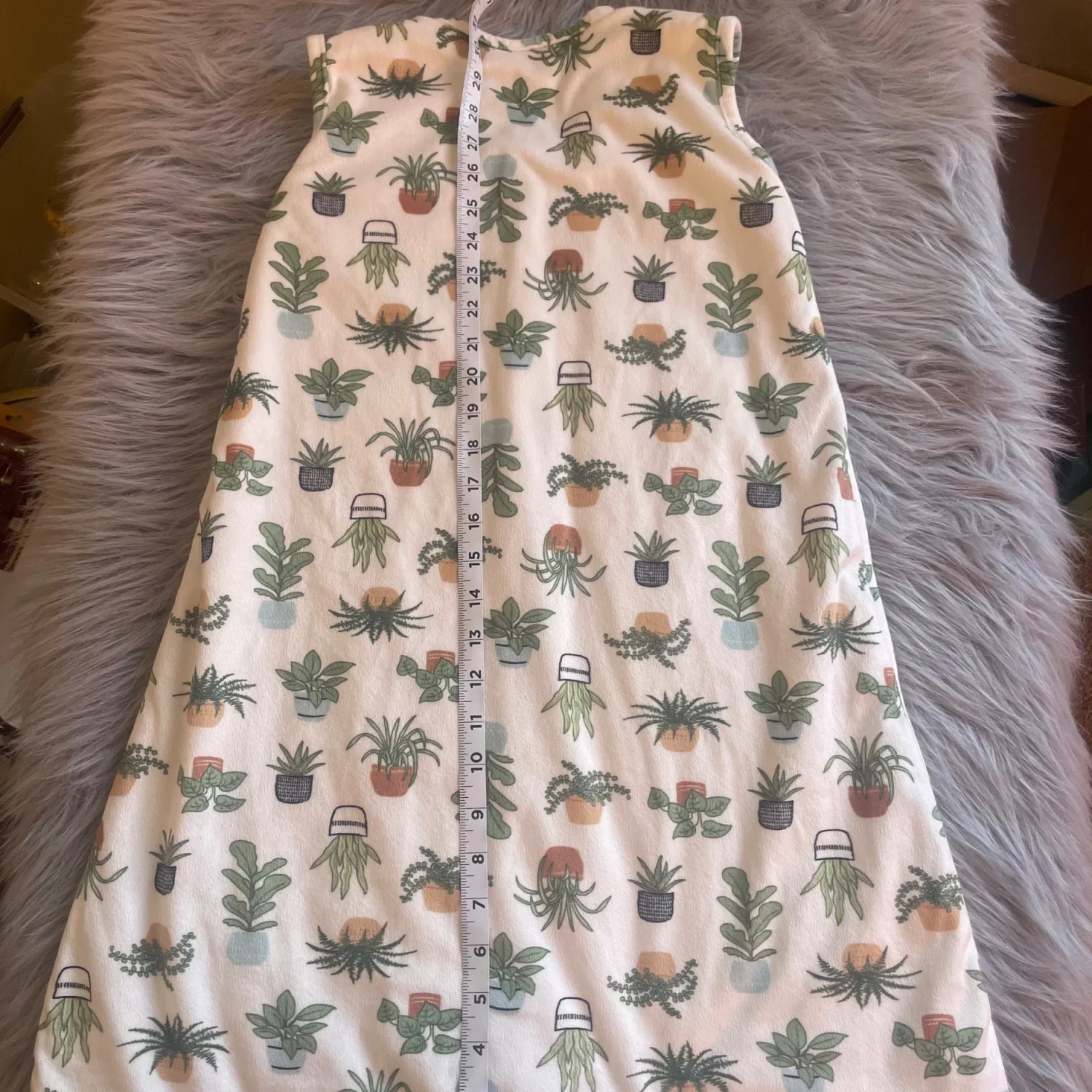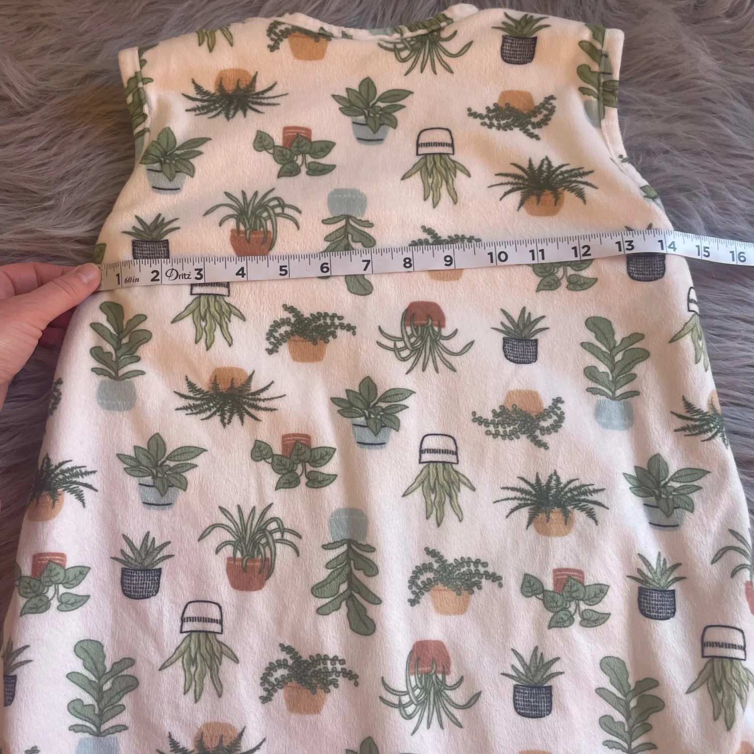 Sleeveless sleep sack with a full front zipper. All-over green plant and terracotta pot print on a cream base. Lightweight, breathable fabric for cozy nights. Easy on-and-off design for simple dressing.