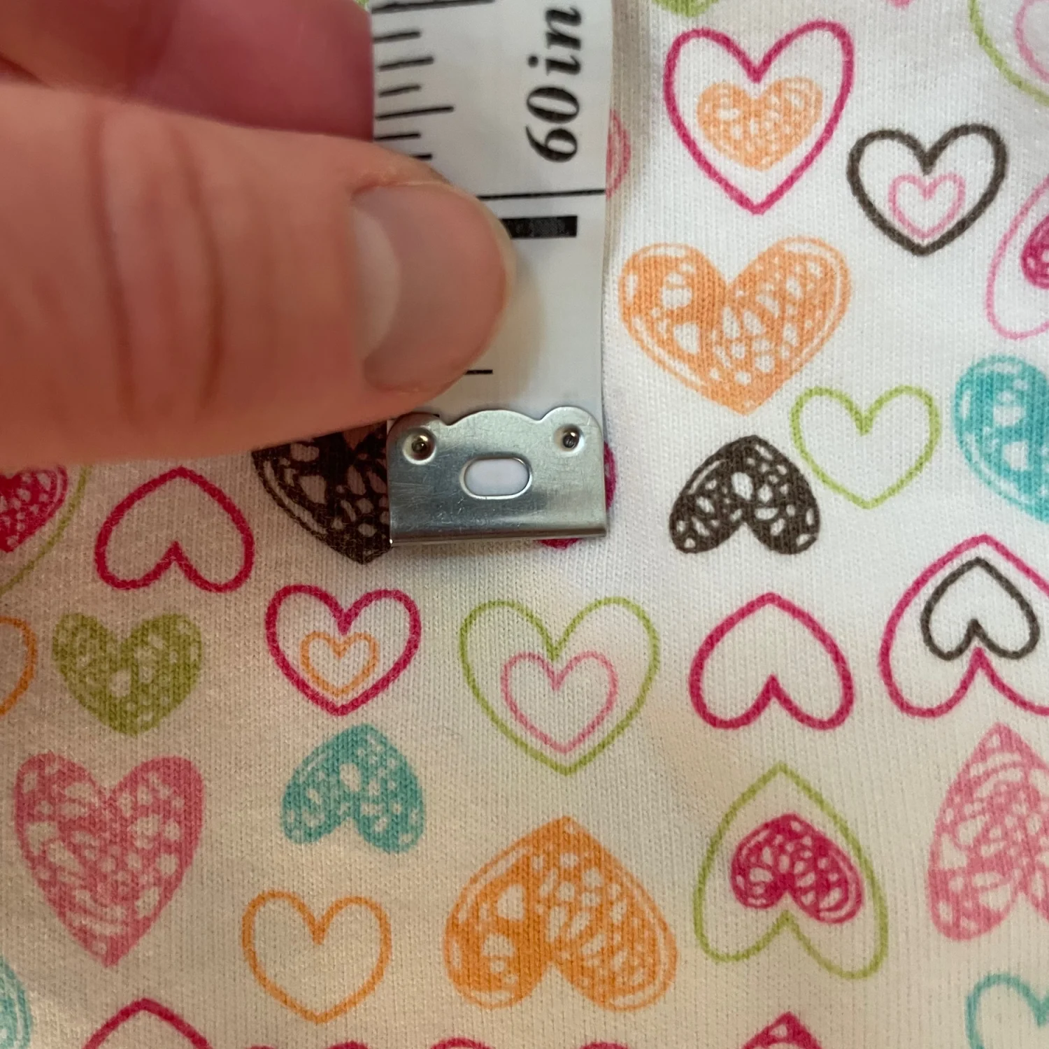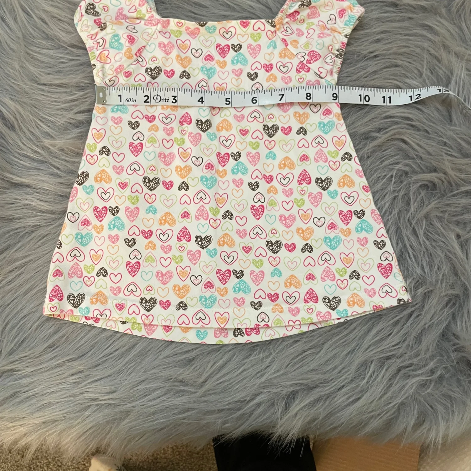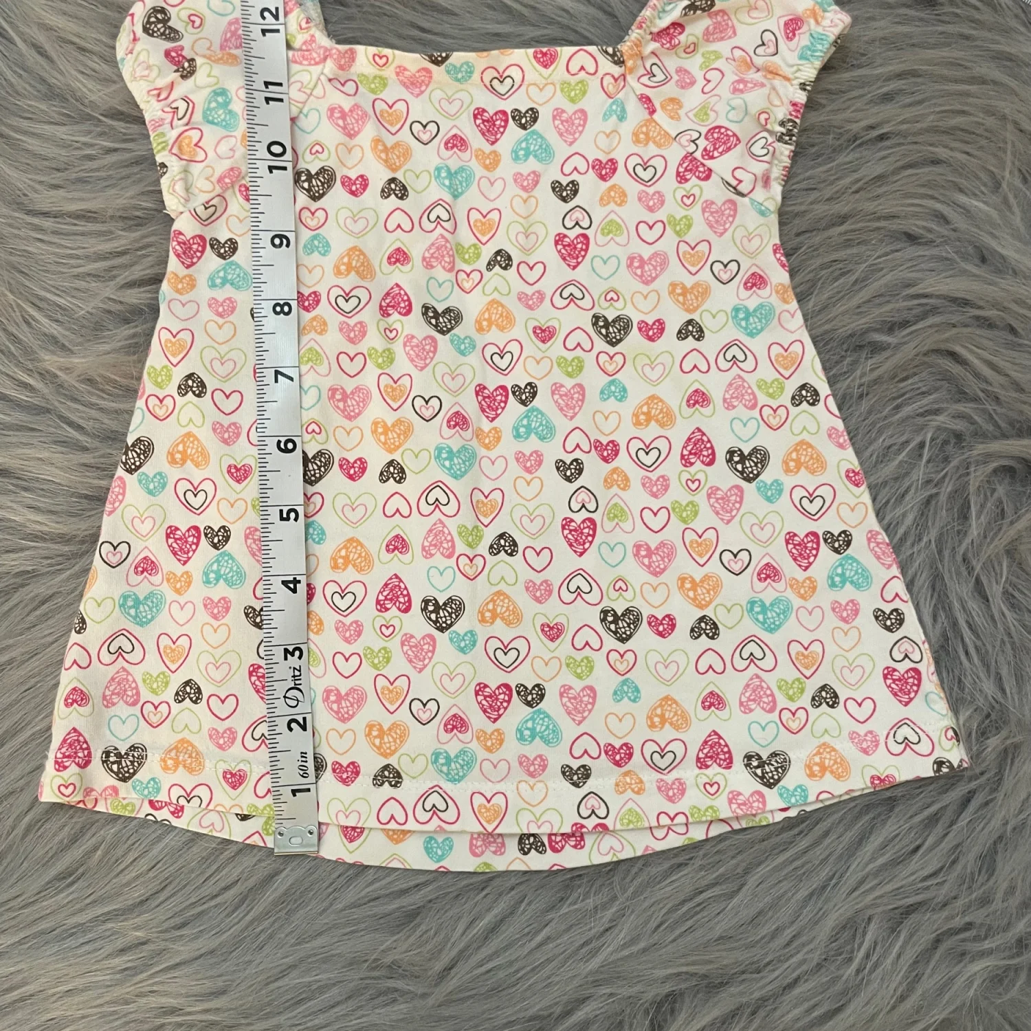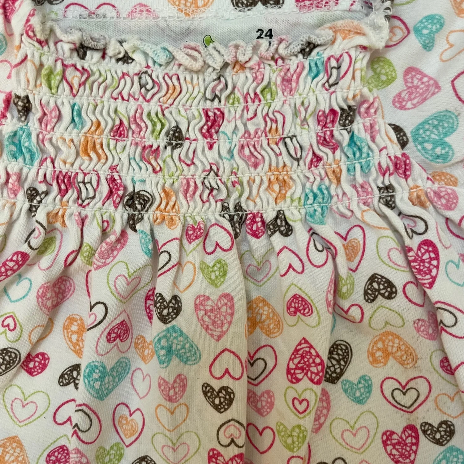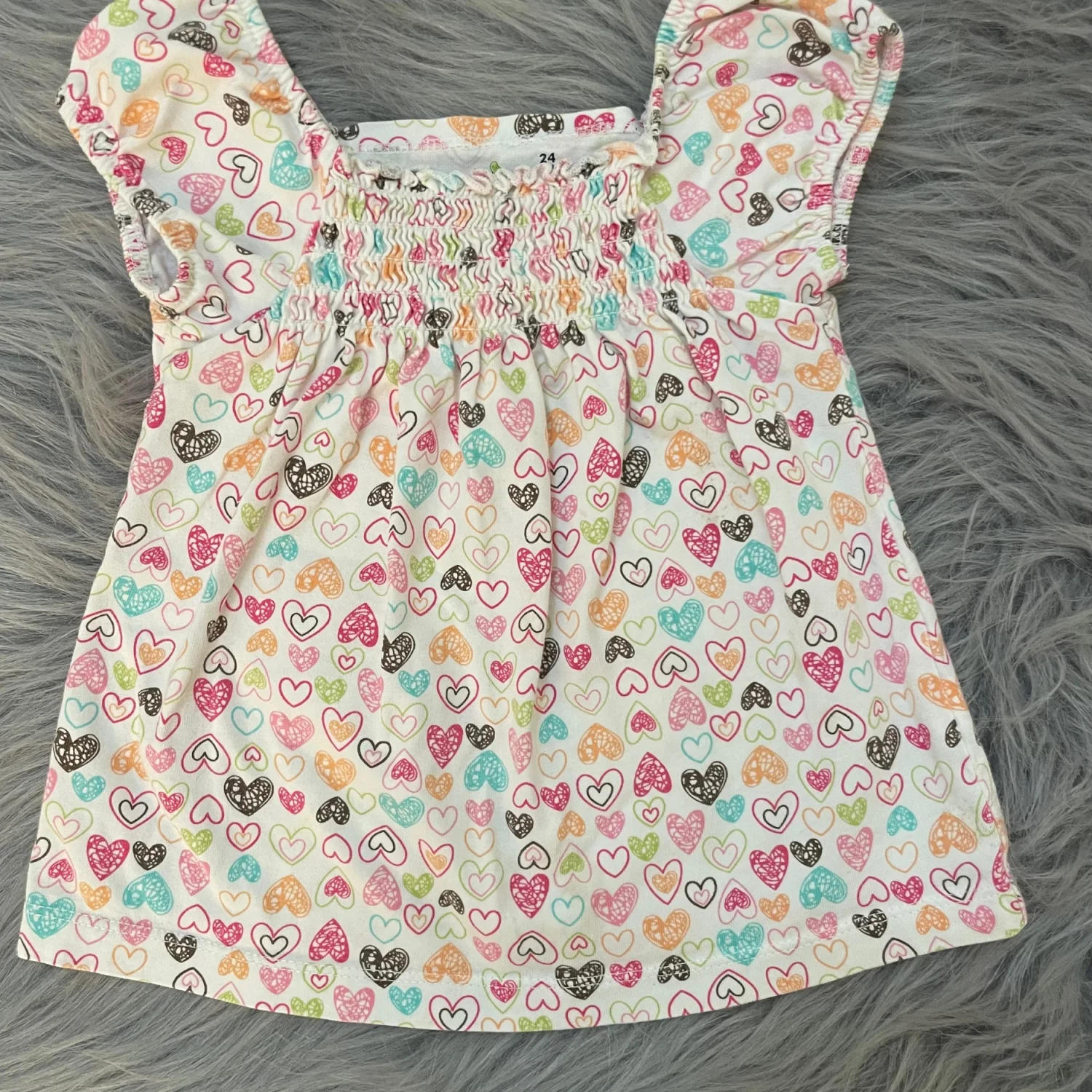 Cute flutter sleeve top with allover heart print. Smocked neckline for gentle stretch. Bright multicolor hearts on a white background. Light yellow spot on back. Heart to see due to design.