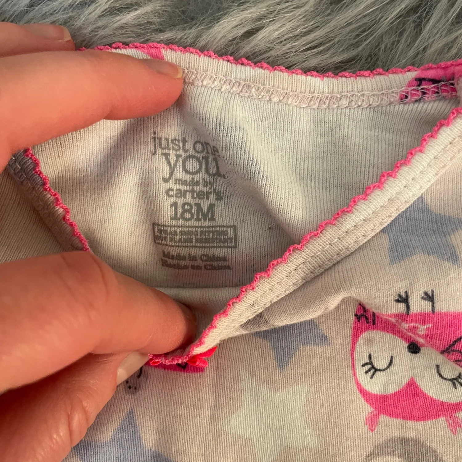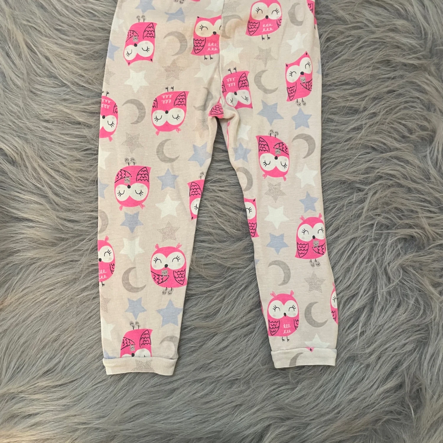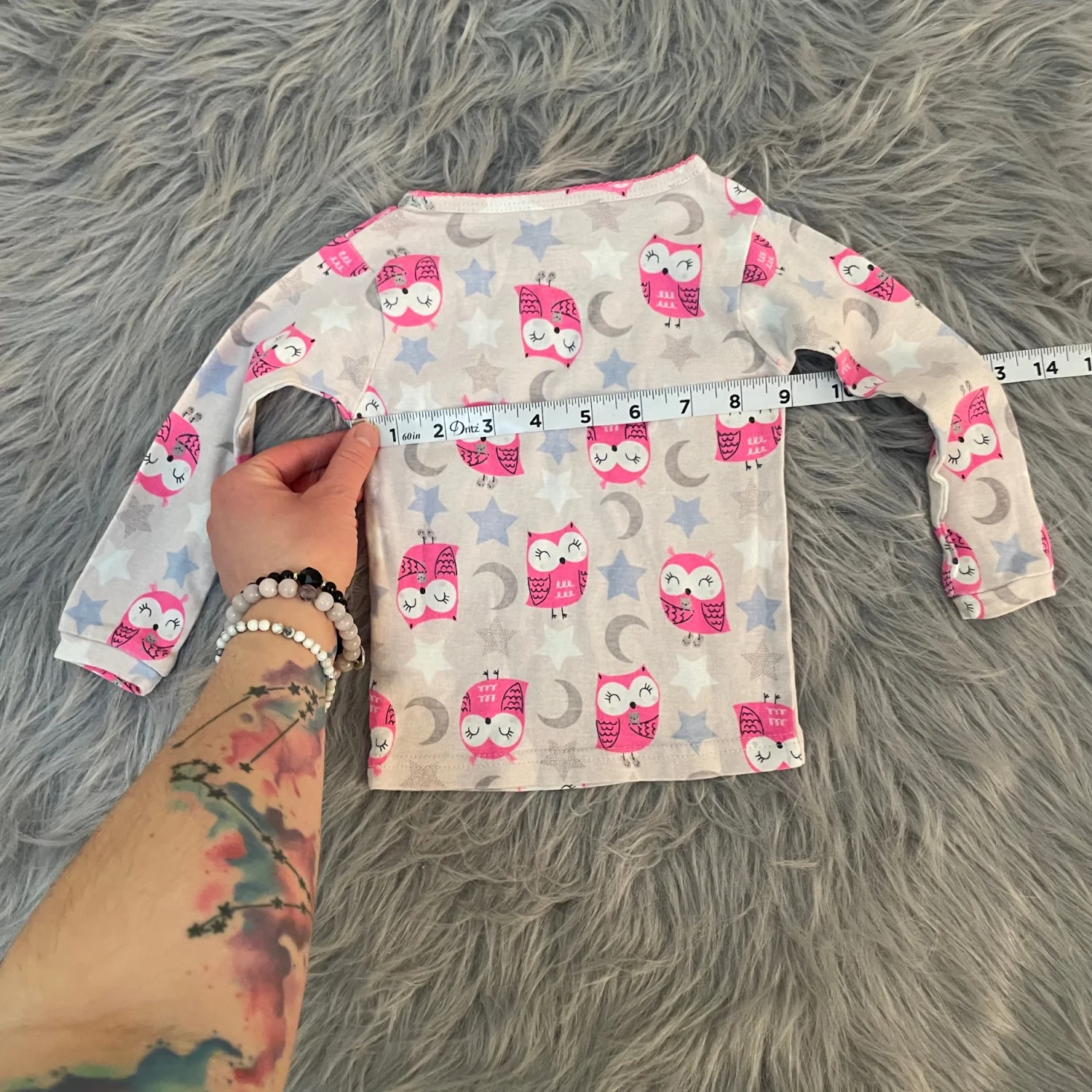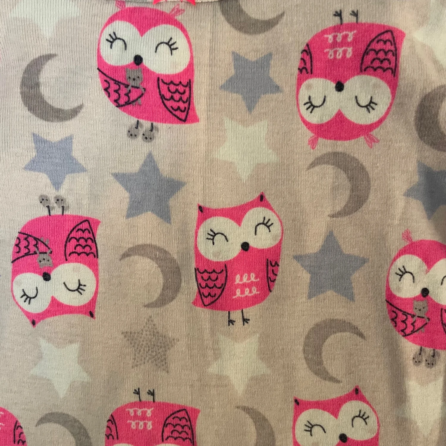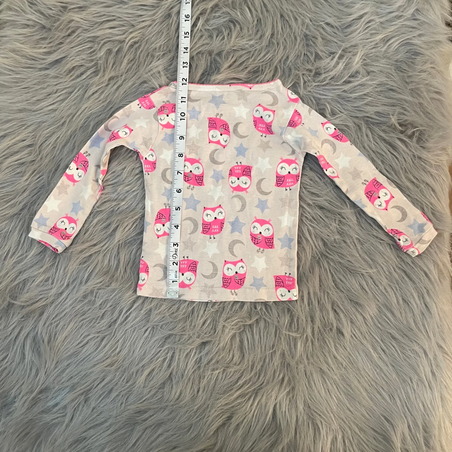 Carter's long-sleeve pj set covered in bright pink owl prints. Gray stars and crescent moons add a playful night-sky pattern. Lightweight and comfy for wear. Cute neckline with pink trim detail.