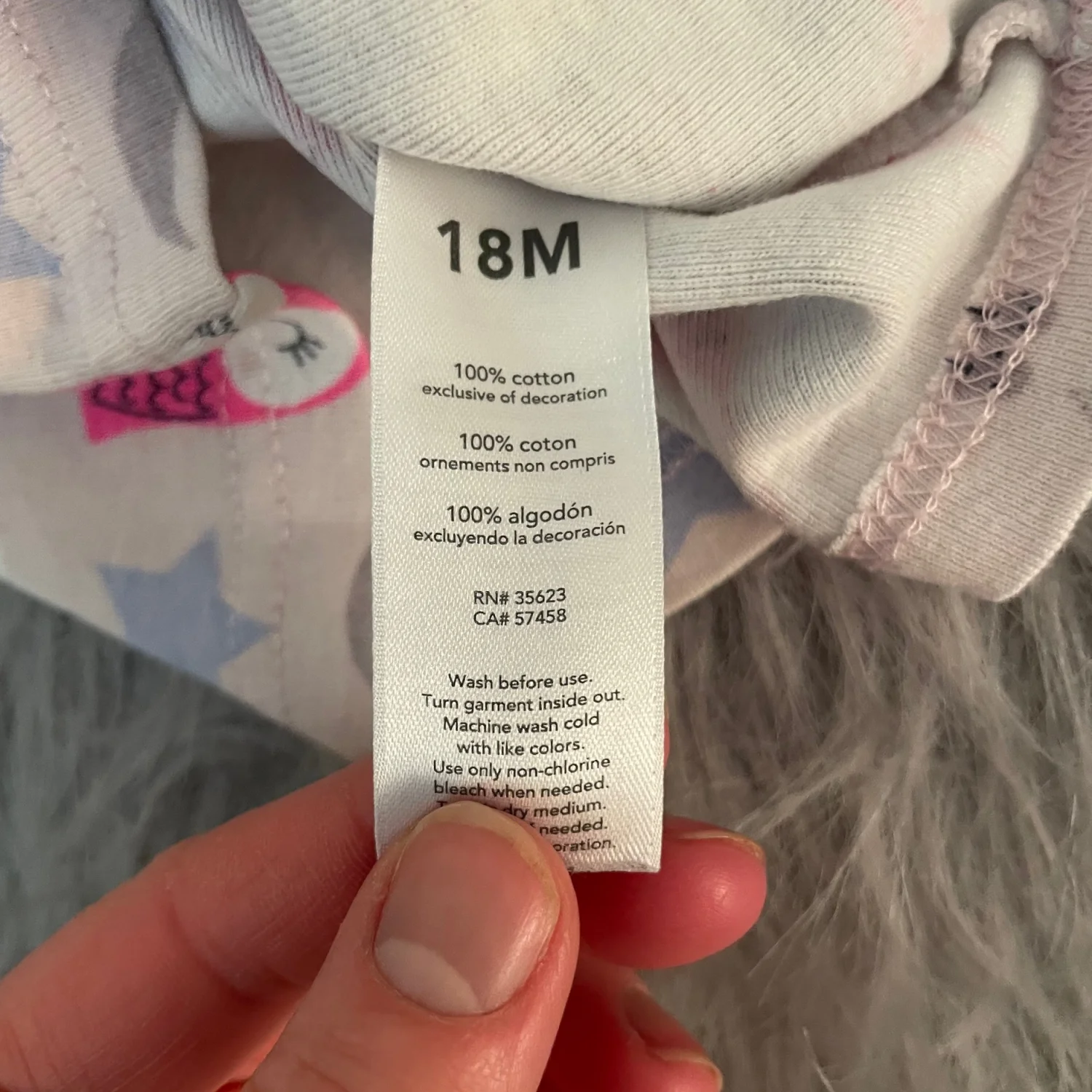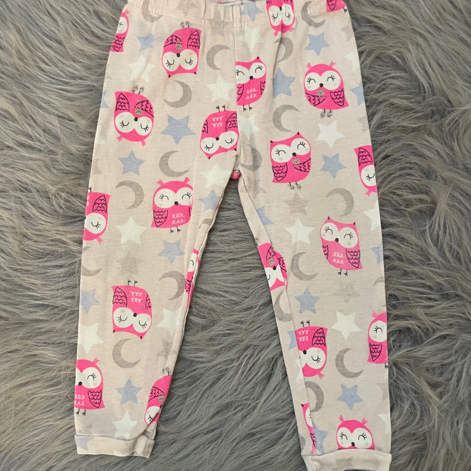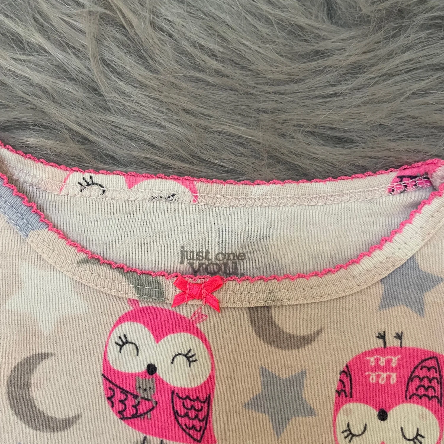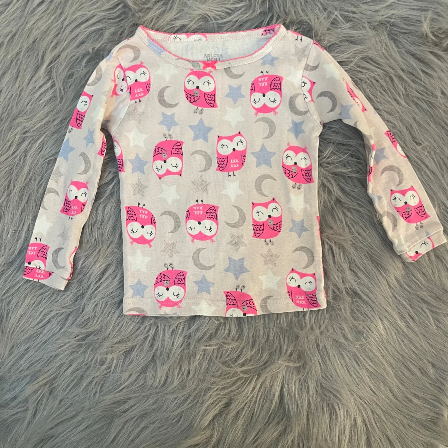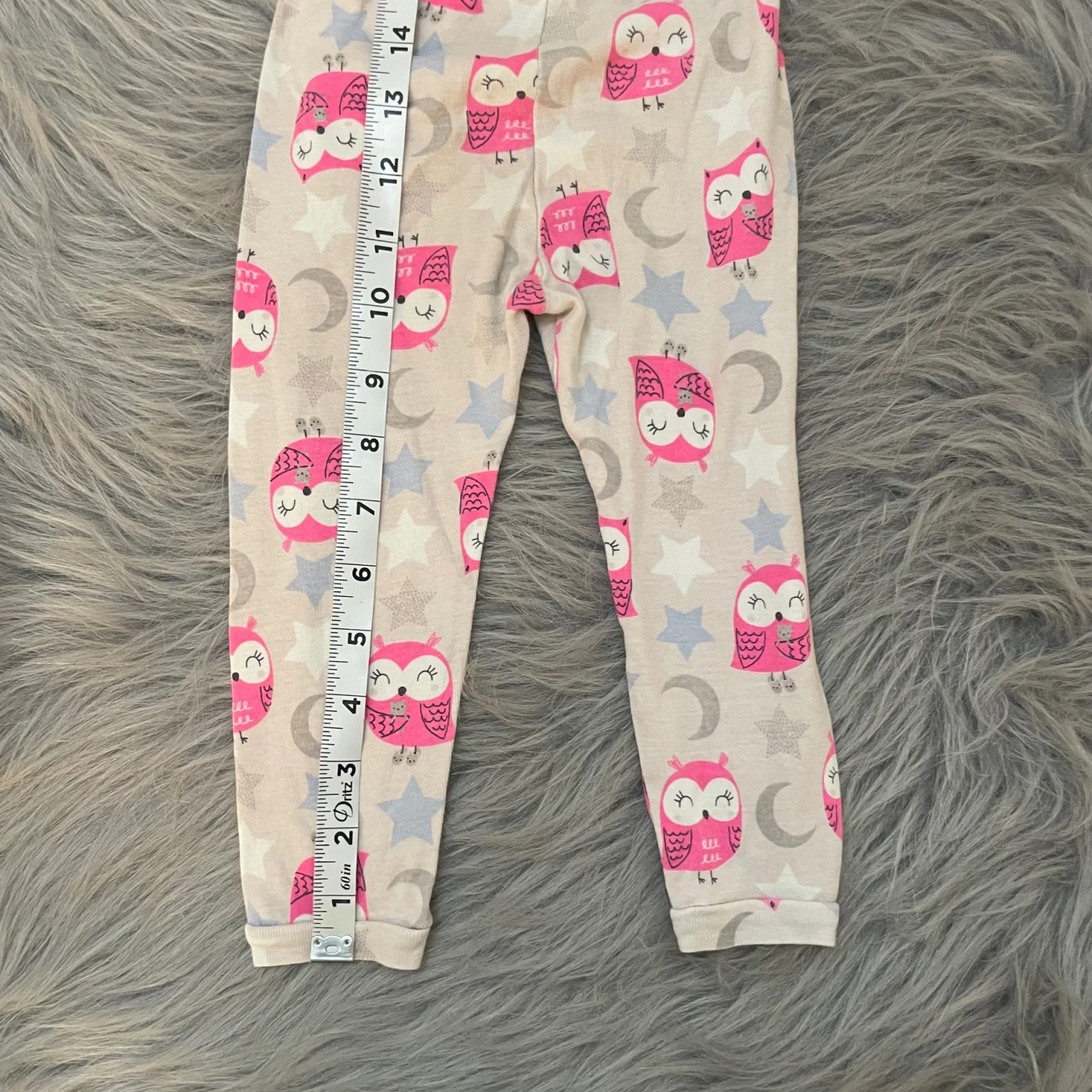 Carter's long-sleeve pj set covered in bright pink owl prints. Gray stars and crescent moons add a playful night-sky pattern. Lightweight and comfy for wear. Cute neckline with pink trim detail.