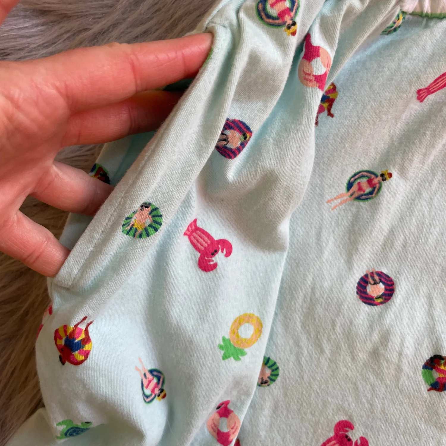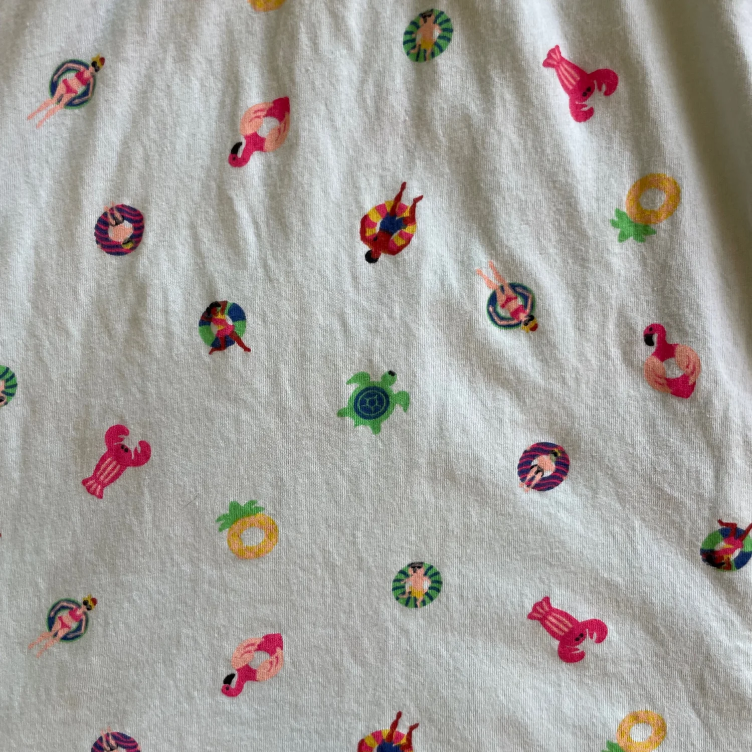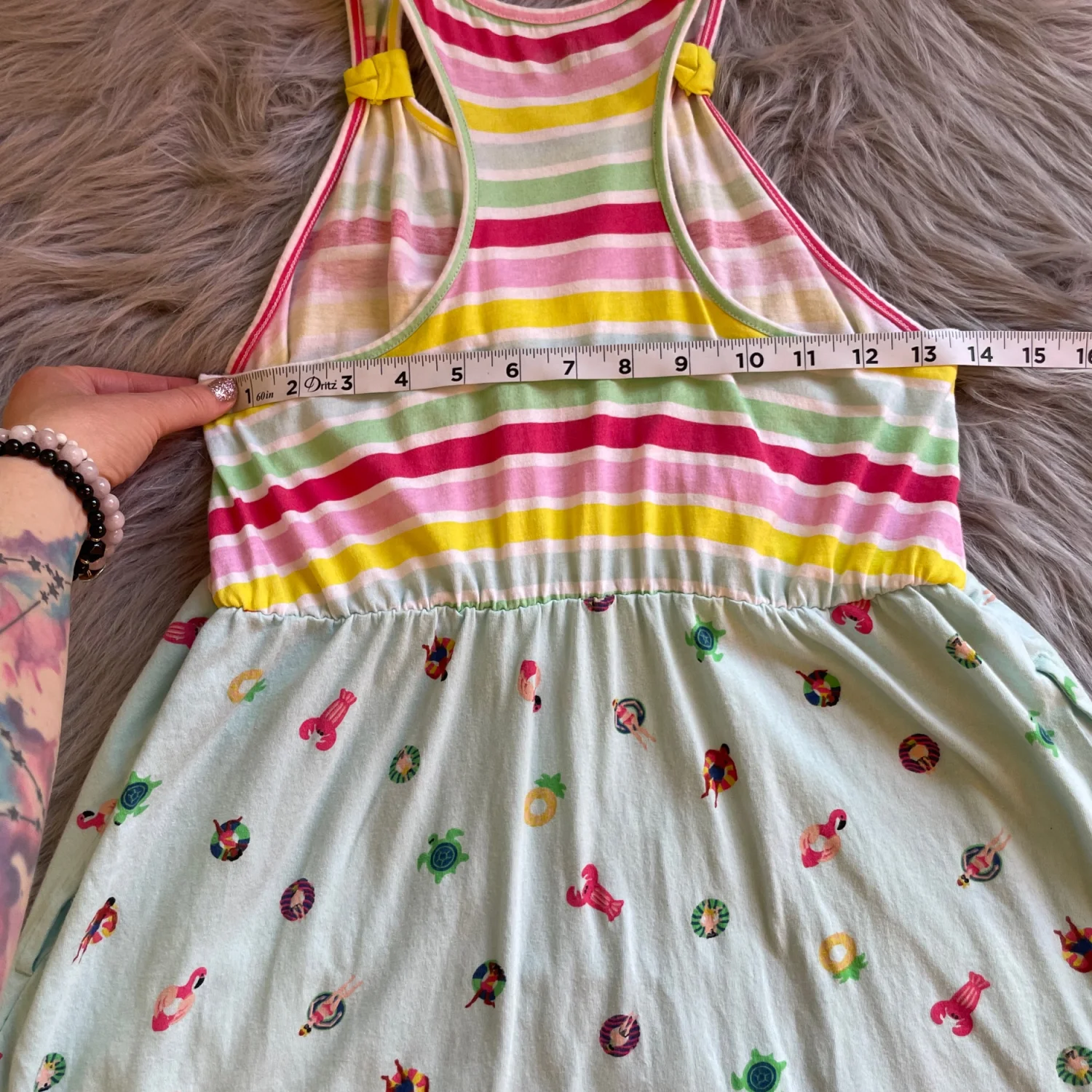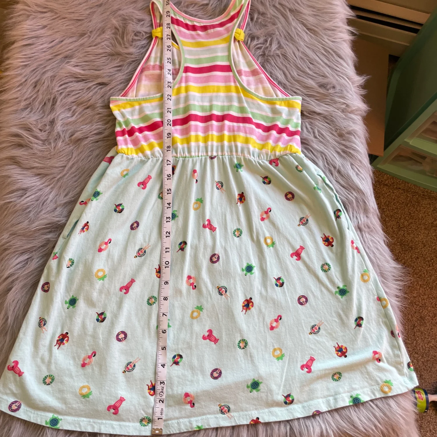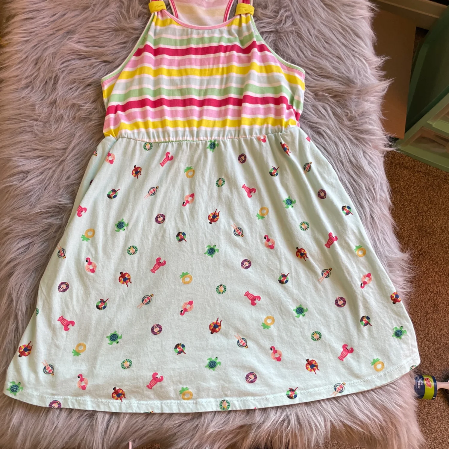 Sleeveless casual dress with colorful striped bodice. Mint skirt patterned with pool float and flamingo motifs. Knot-detail shoulder straps add charm. Soft cotton-blend fabric for everyday wear. Pockets on both sides