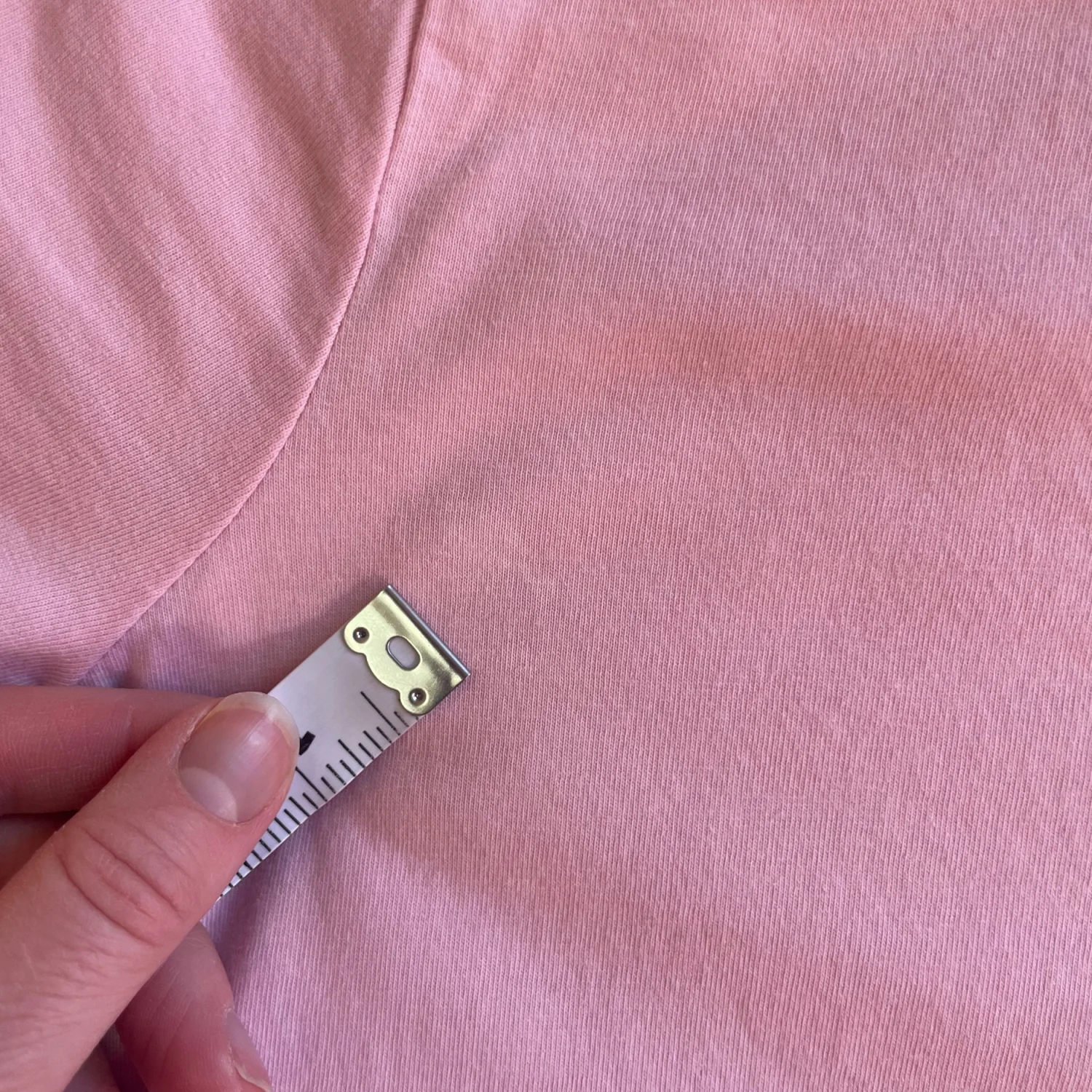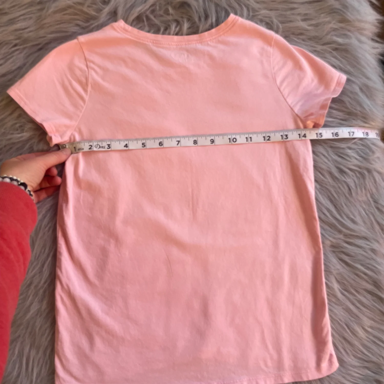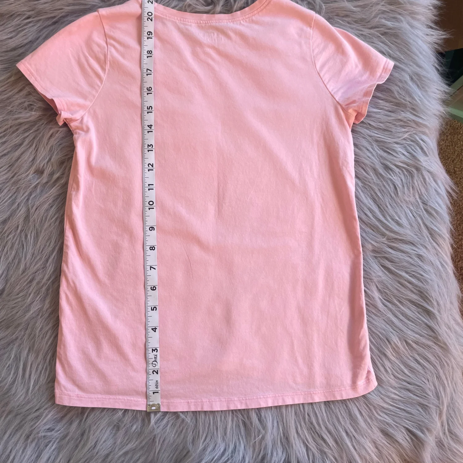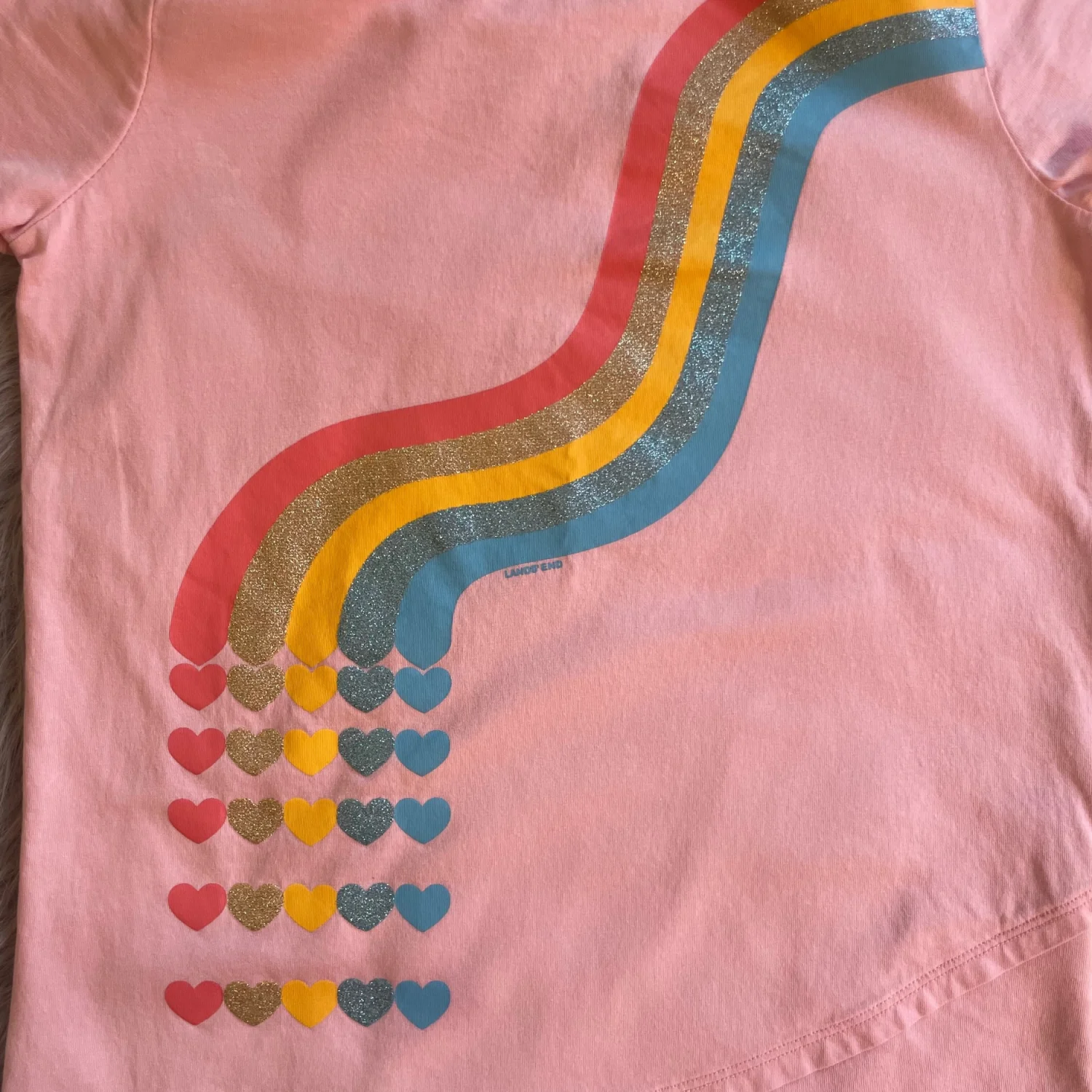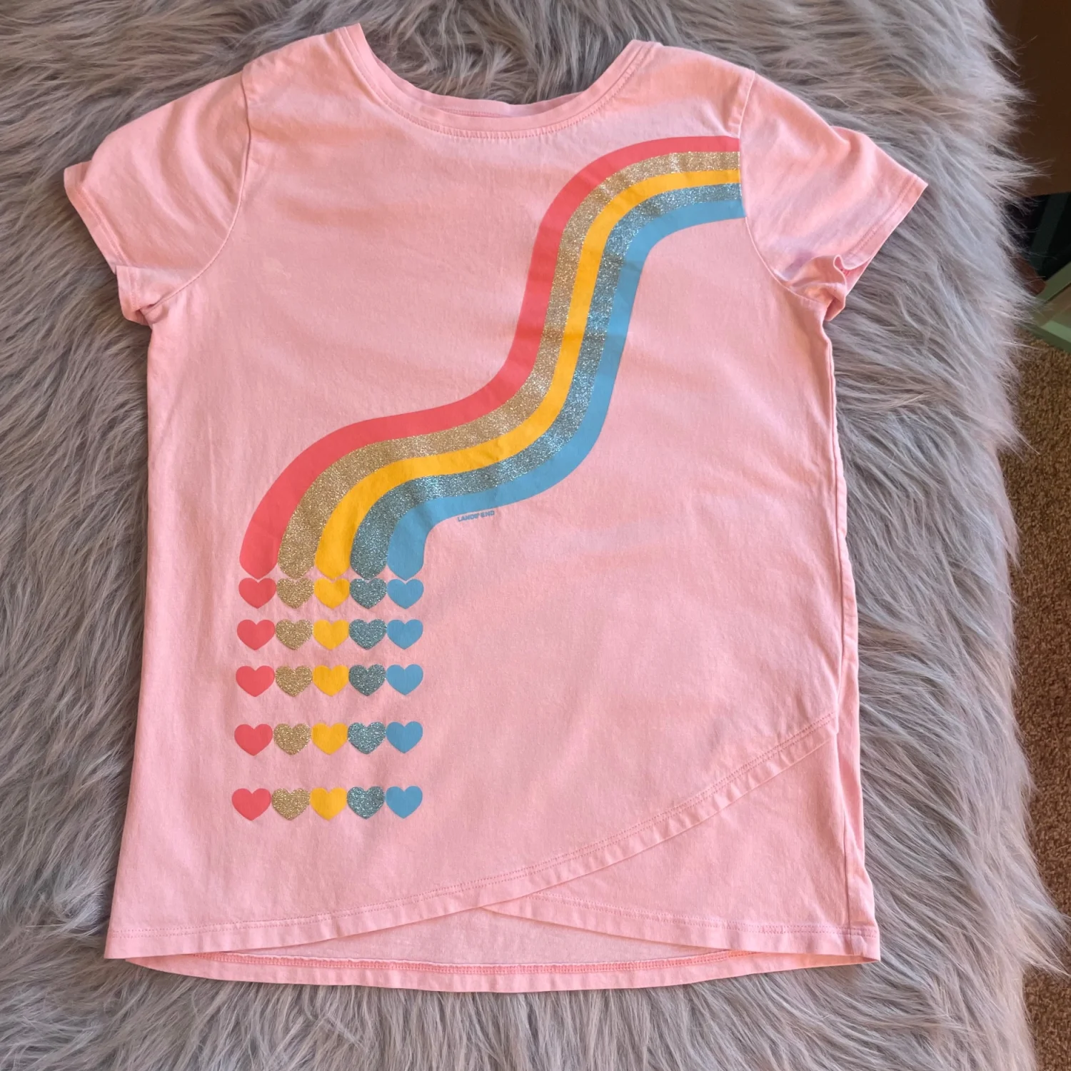 Charming pink tee with colorful rainbow and heart pattern. Soft and comfortable for kids. Light white spot in upper right shoulder