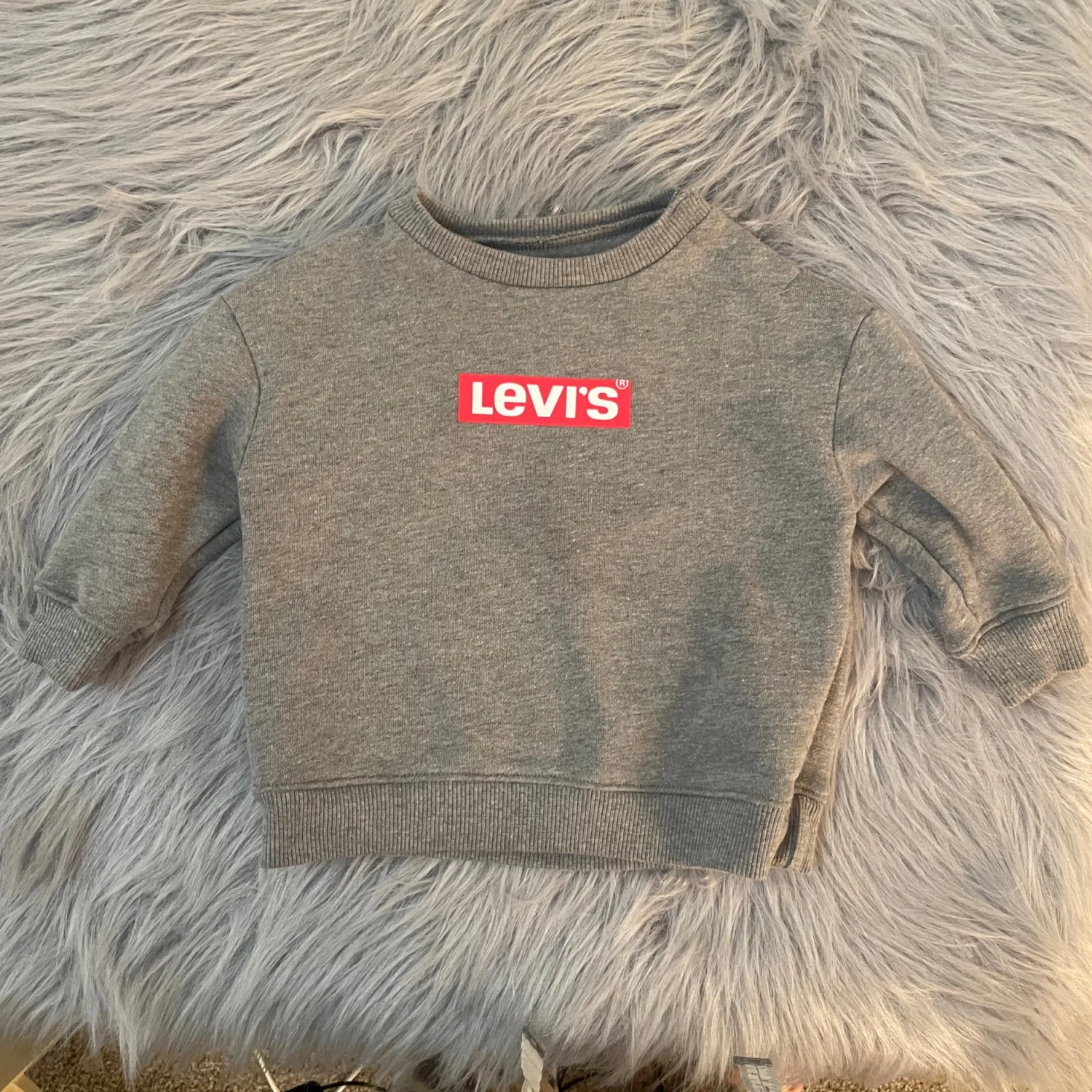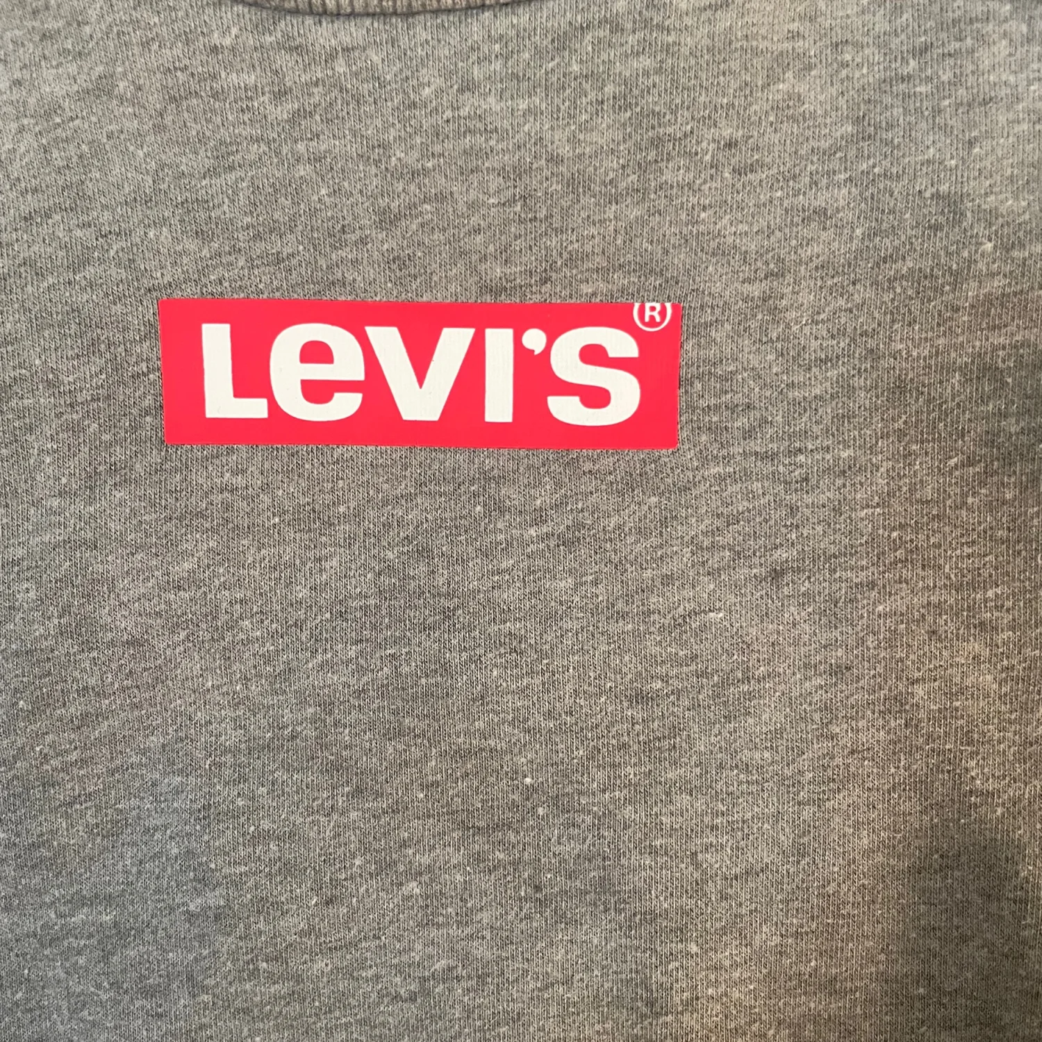 Levi's crewneck sweatshirt in grey with a bold red logo on front. Soft knit fabric for everyday comfort. Simple pullover style that's easy to layer. Slightly looks like gray staining on front but it’s part of the heathered gray material.
