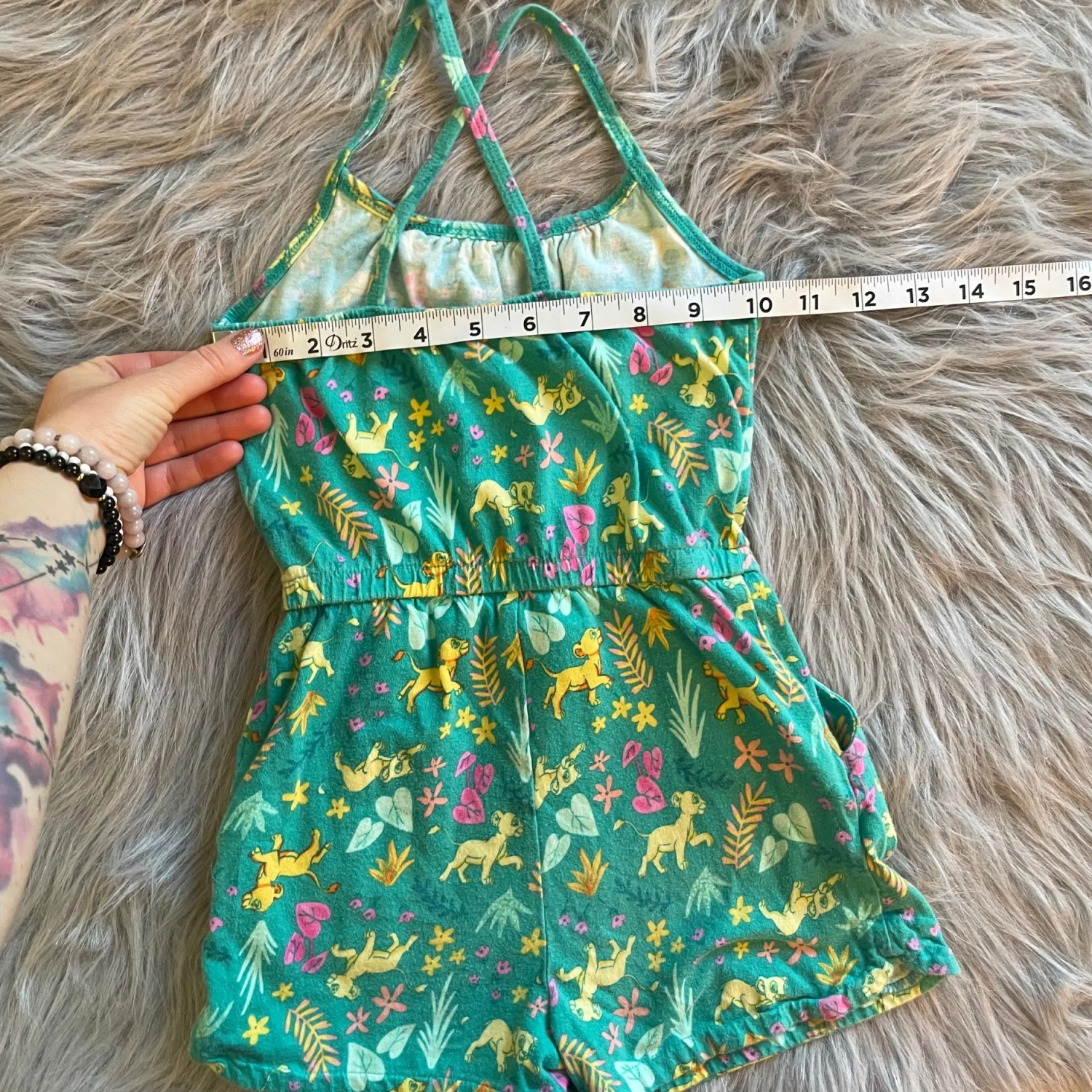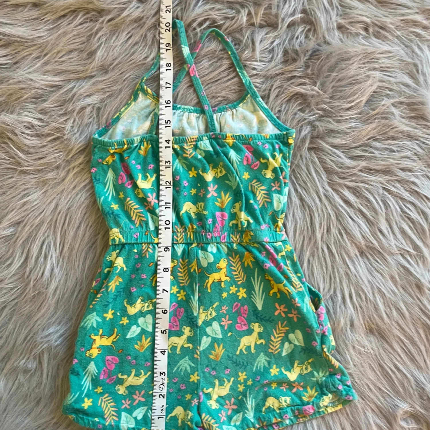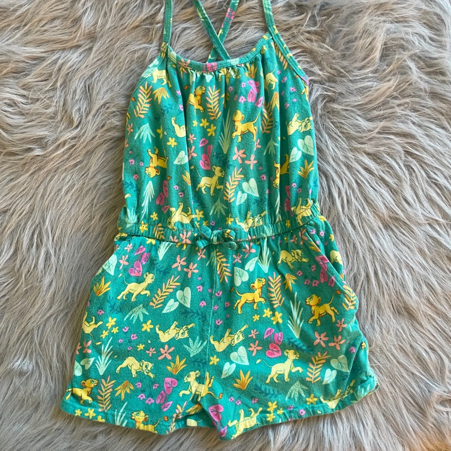 Disney sleeveless romper featuring whimsical Lion King and floral print. Soft knit fabric with elastic waist for easy wear. Cross-back thin straps for secure fit. Pilling throughout