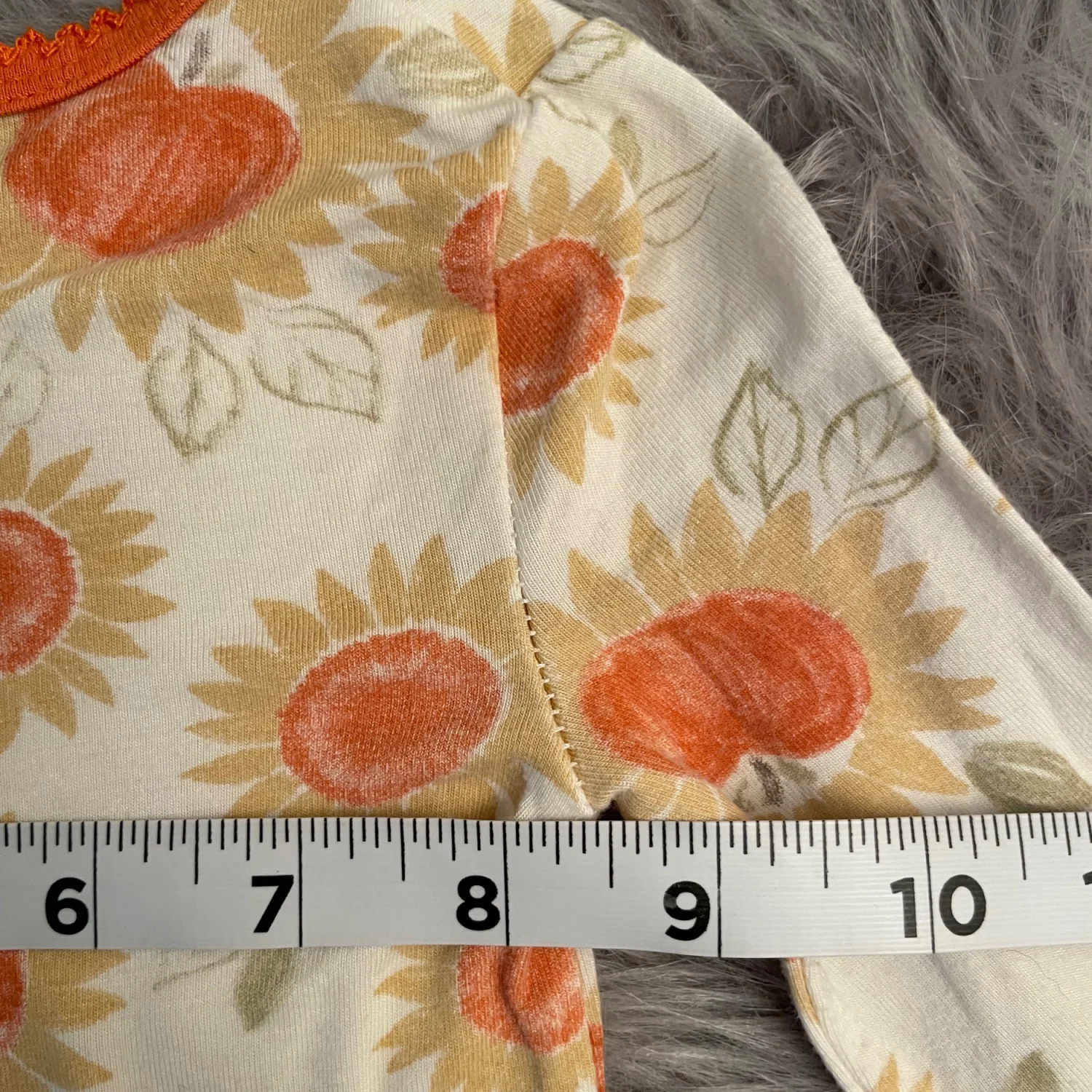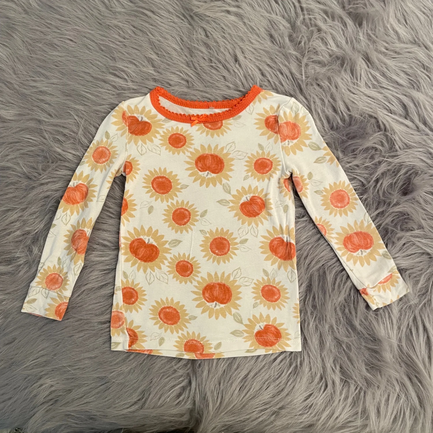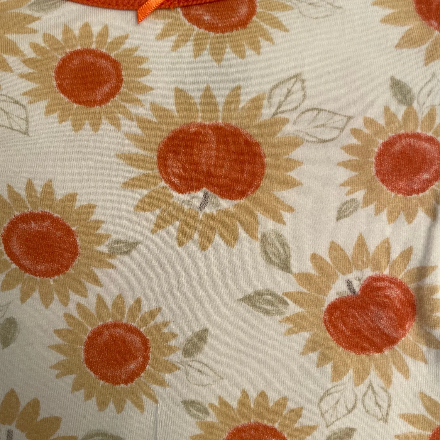 Soft and breathable long-sleeve pj top with a cheerful orange sunflower print. Lightweight knit fabric for comfort. Crew neckline with orange trim adds a playful touch.