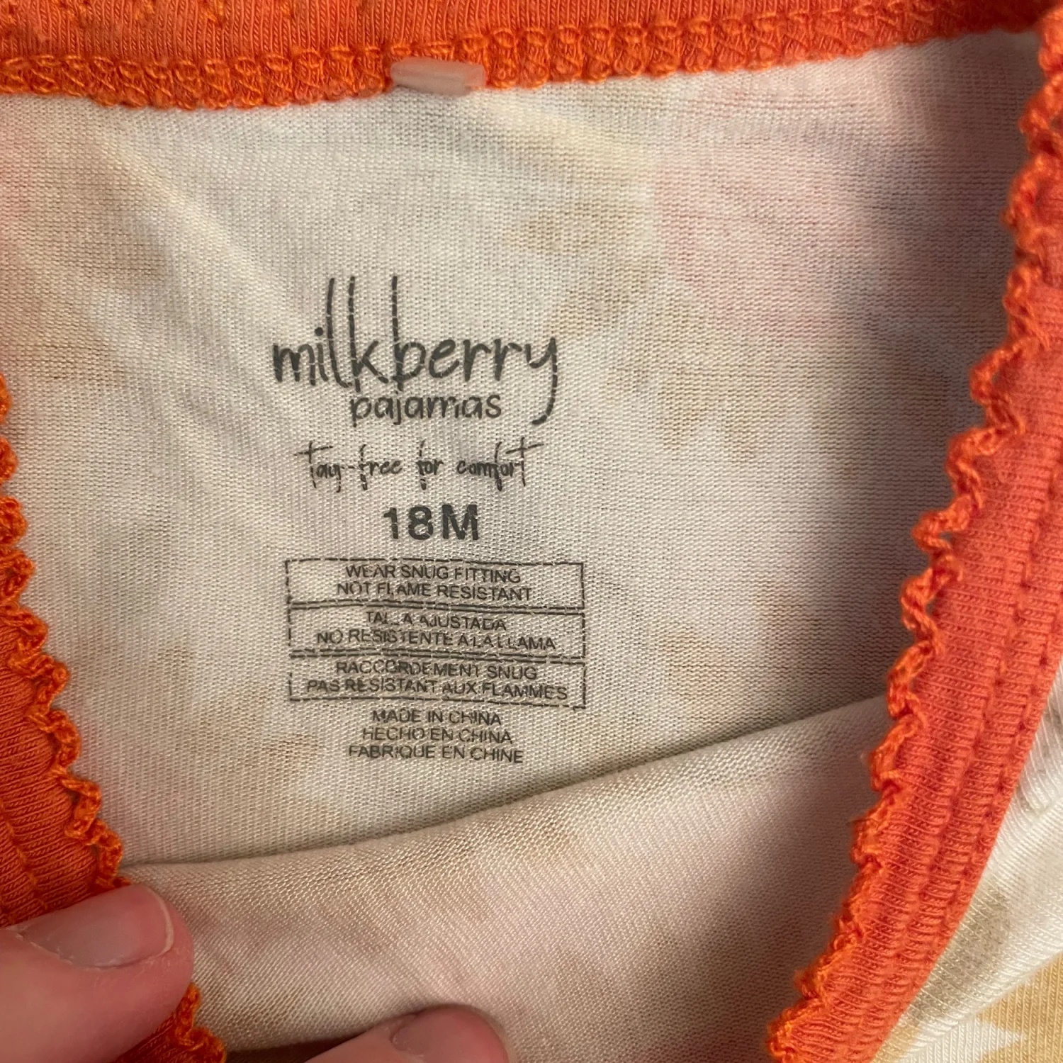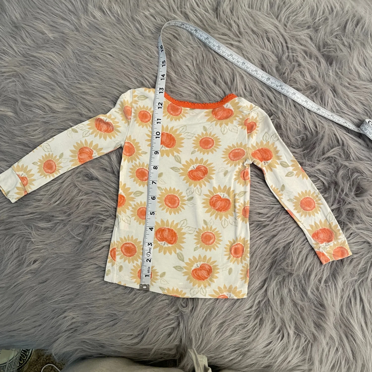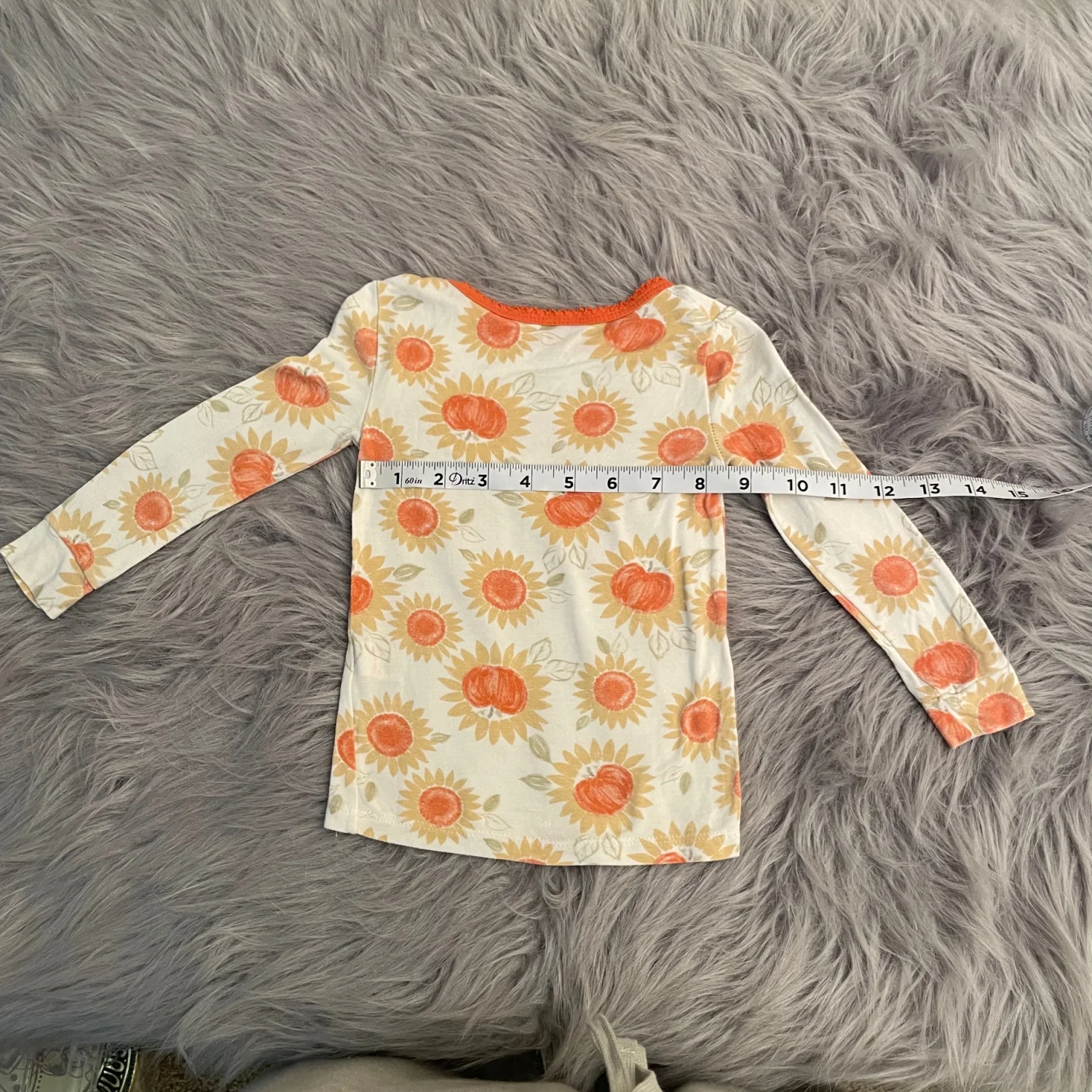Soft and breathable long-sleeve pj top with a cheerful orange sunflower print. Lightweight knit fabric for comfort. Crew neckline with orange trim adds a playful touch.