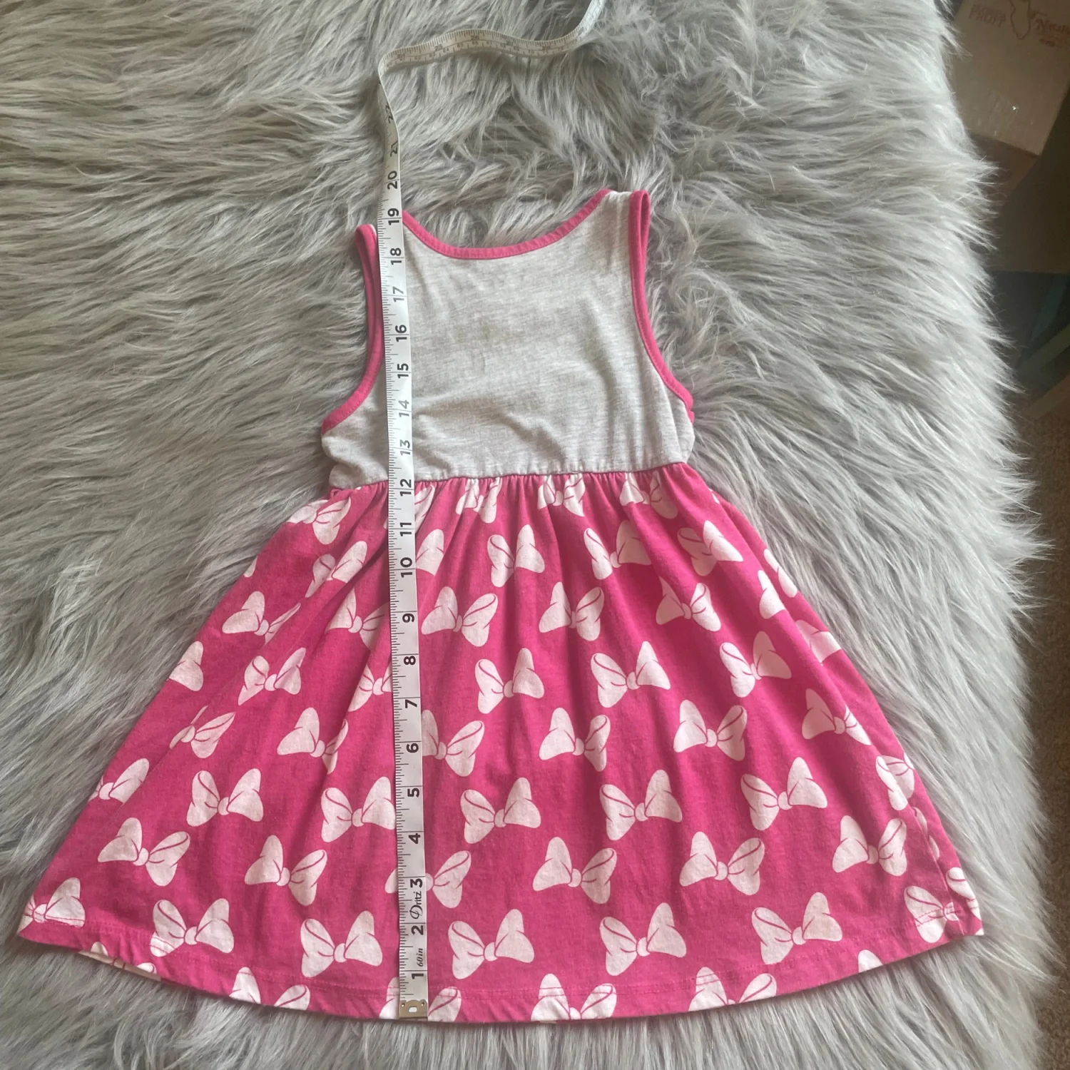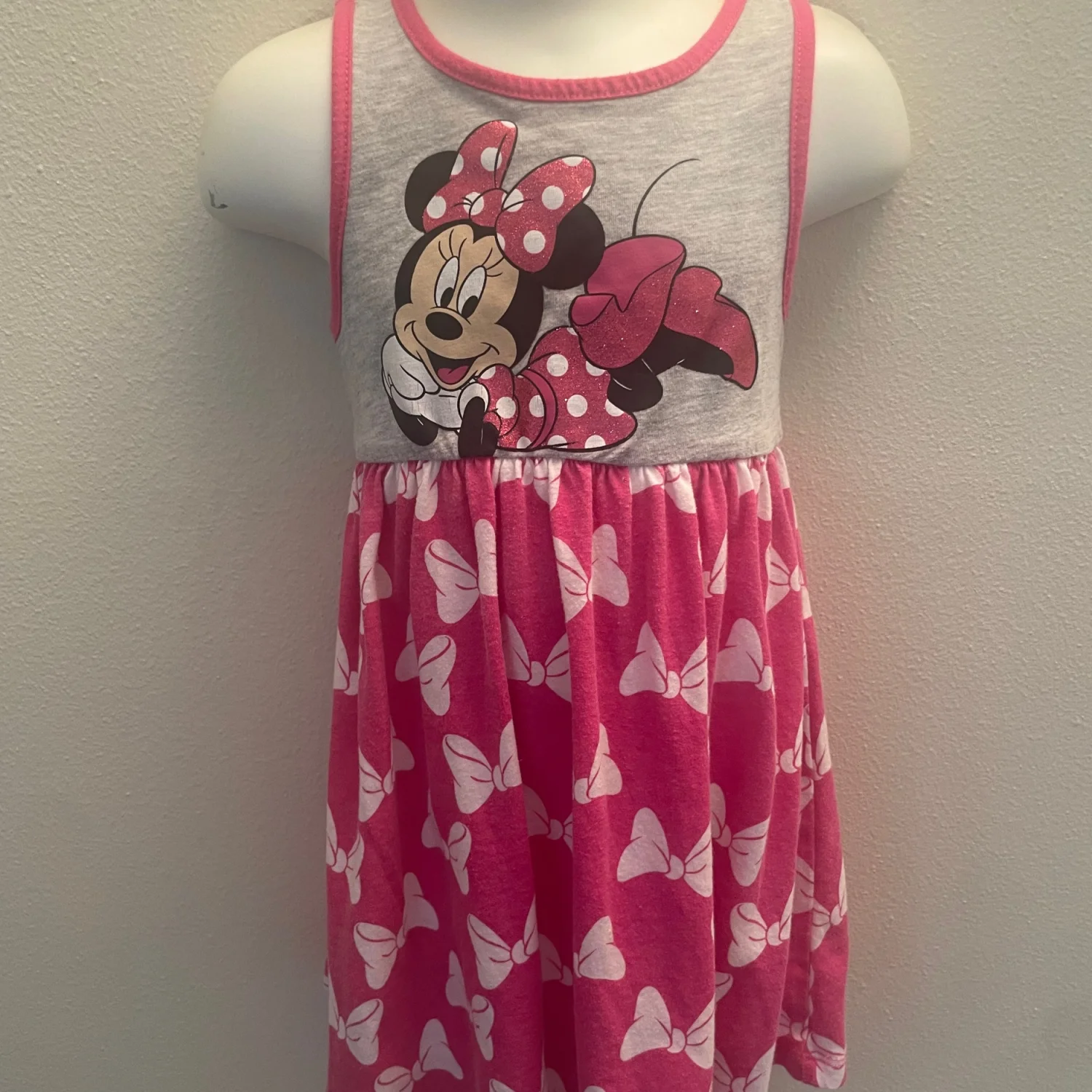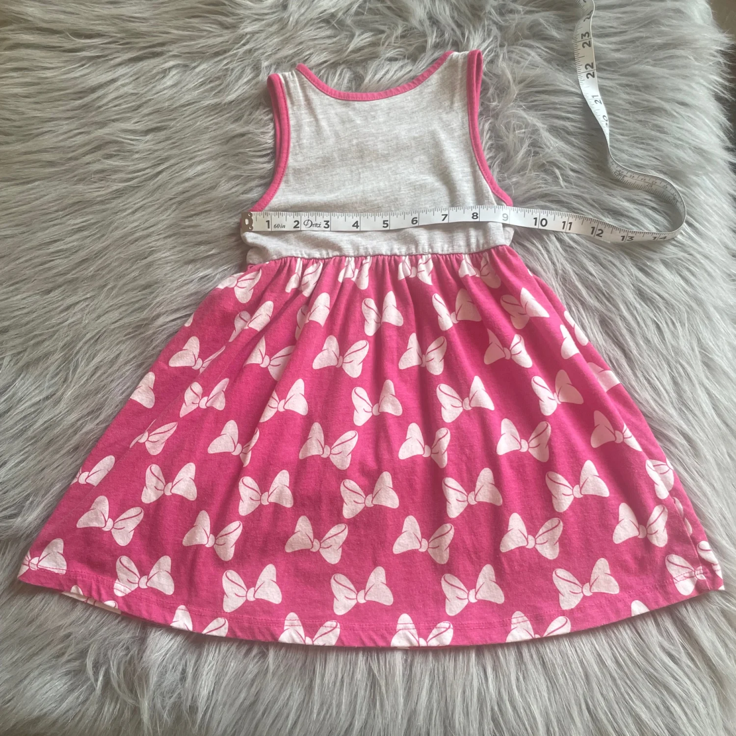 Cute sleeveless dress featuring Minnie Mouse graphic on the bodice. Pink skirt with white bow print. Lightweight and playful. Perfect for everyday wear.